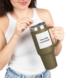 This 40oz insulated travel mug is built for long days, early mornings, and slow afternoons. Double-wall stainless steel keeps drinks hot or cold for hours while the leak-proof push-on lid and included straw make sipping on the go simple and clean. The ergonomic handle and large capacity mean fewer refills during road trips, work shifts, or outdoor adventures. A matte powder-coated finish gives a soft, tactile feel and the UV-DTF printed panel holds crisp, lasting artwork. BPA-free and sturdy, it’s the kind of tumbler you reach for when you want your drink to stay just right through the whole day.