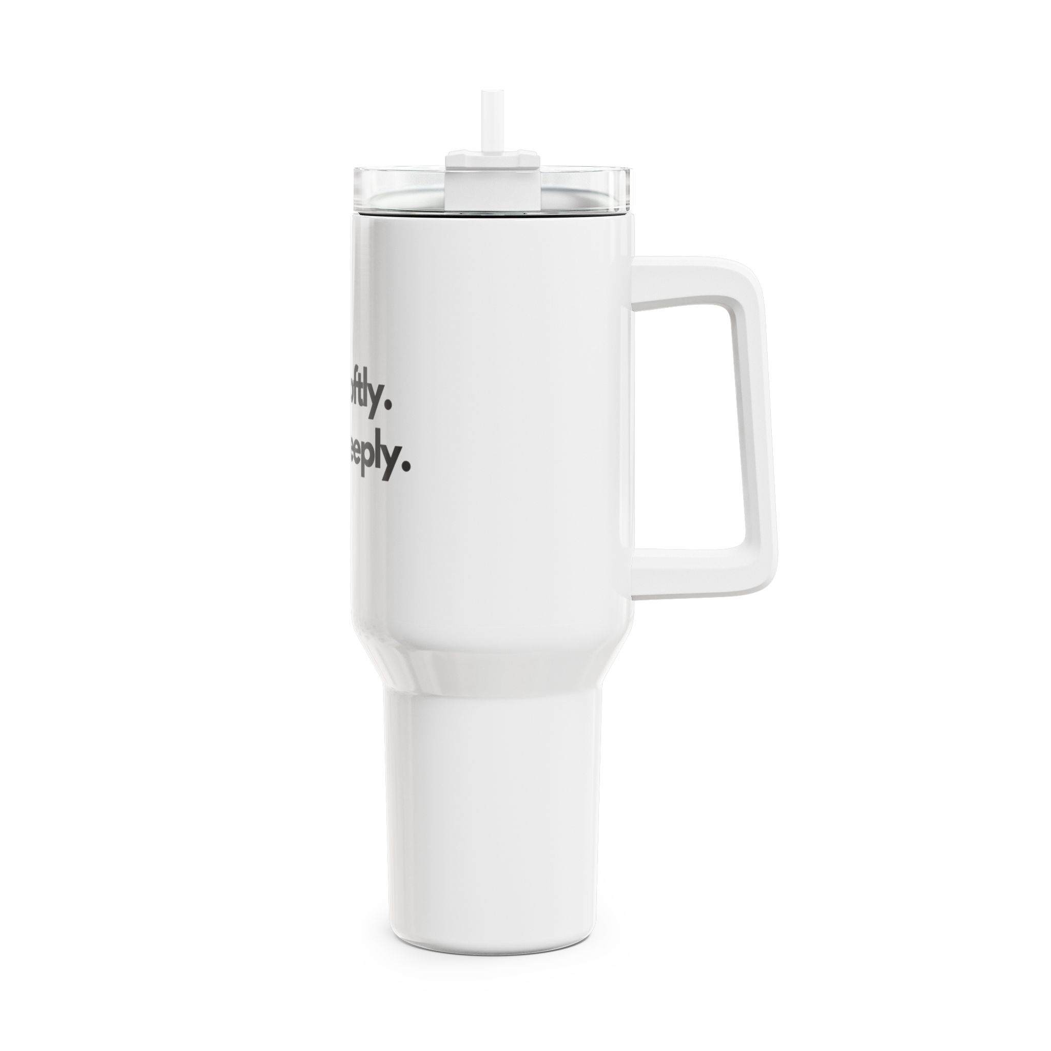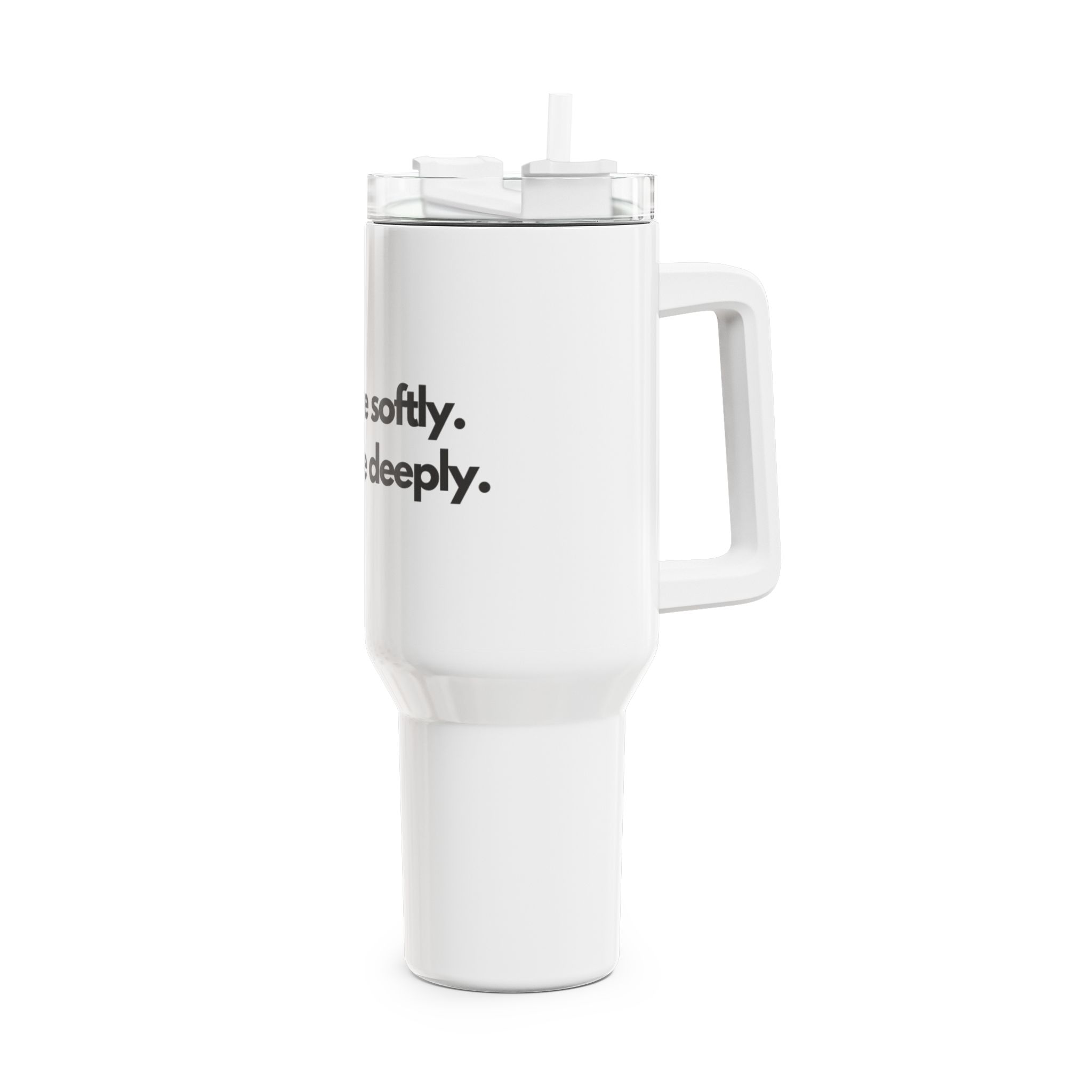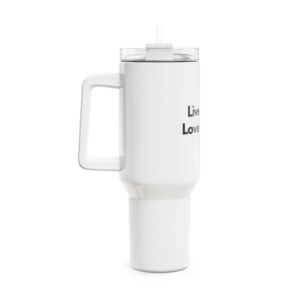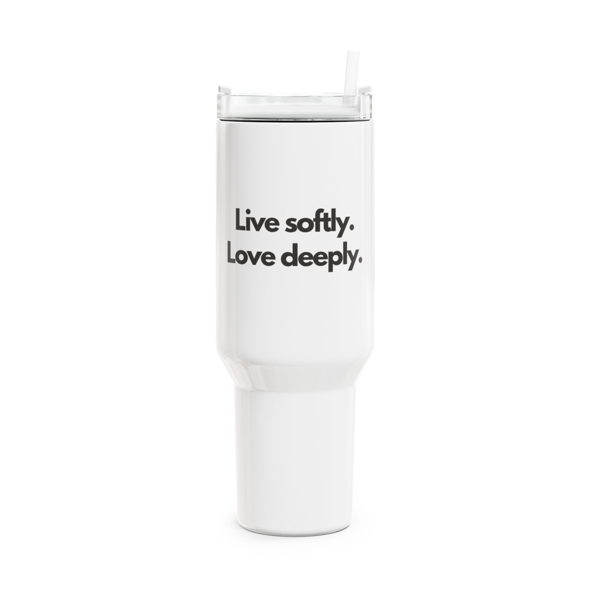 A tall, glossy 40oz tumbler that carries a calm, heartfelt message — small words that settle into your day: “Live softly. Love deeply.” Built for long outings and slow mornings, it holds enough to keep you moving and enough presence to remind you to breathe. The double-wall vacuum insulation keeps coffee warm or iced drinks cold for hours. A clear, rubber-sealed push-down lid with included straw helps prevent spills on the go. The ORCA-coated stainless-steel body keeps printed colors crisp and bright, letting the simple typography stand out against the clean white finish. Durable, BPA-free materials give everyday peace of mind, while the roomy capacity and optional handle make it easy to carry from desk to trail. Hand wash only to preserve the glossy print and coating.