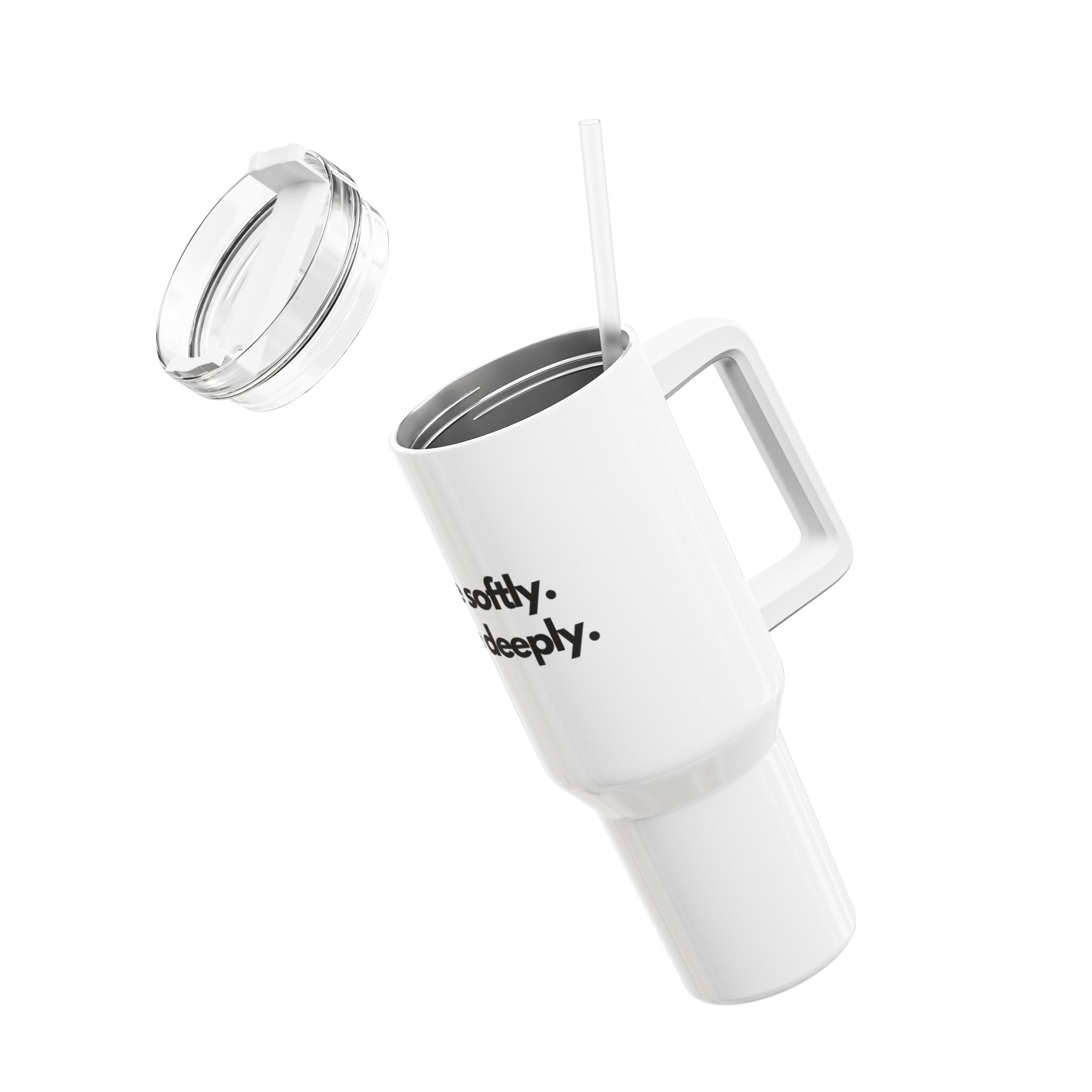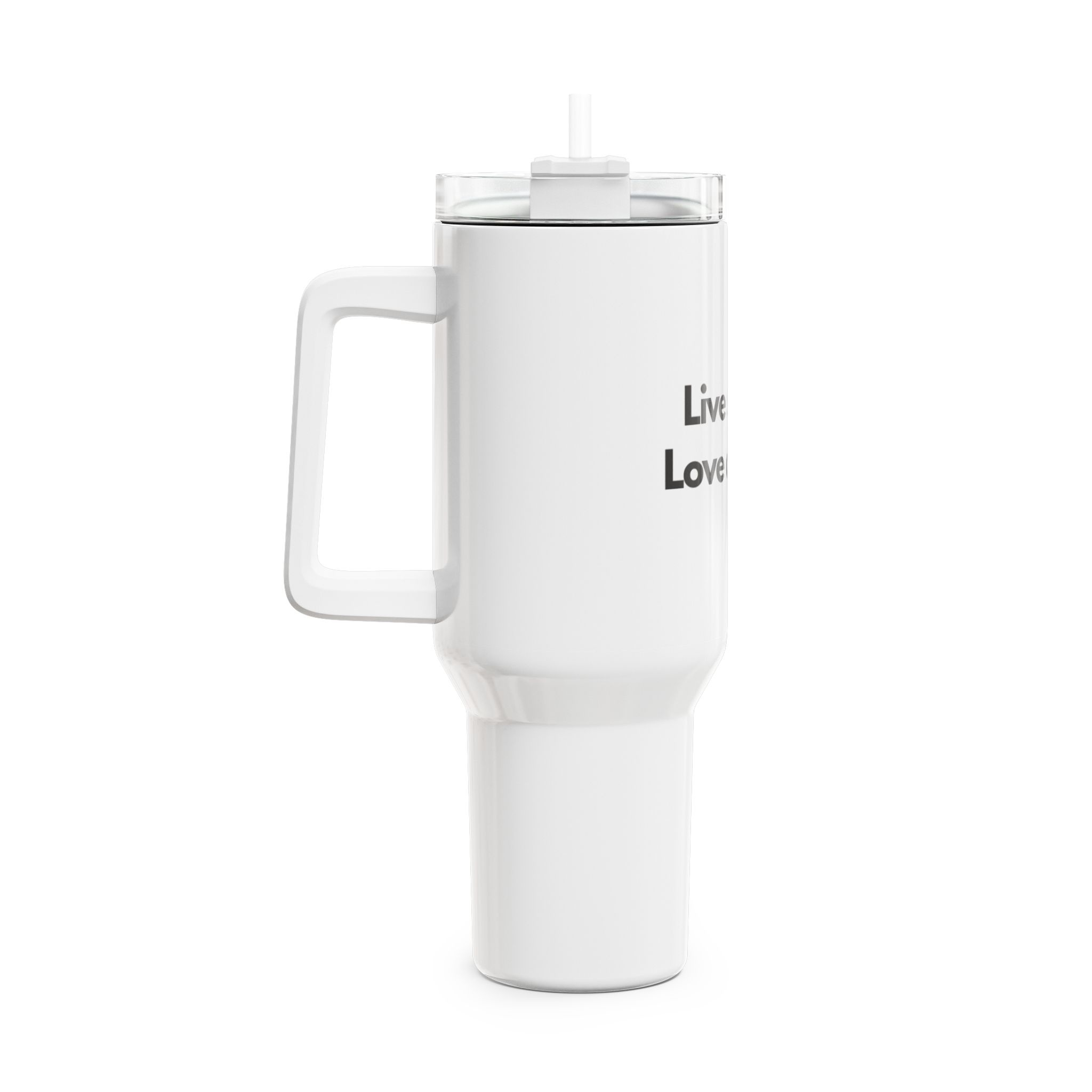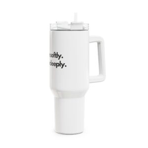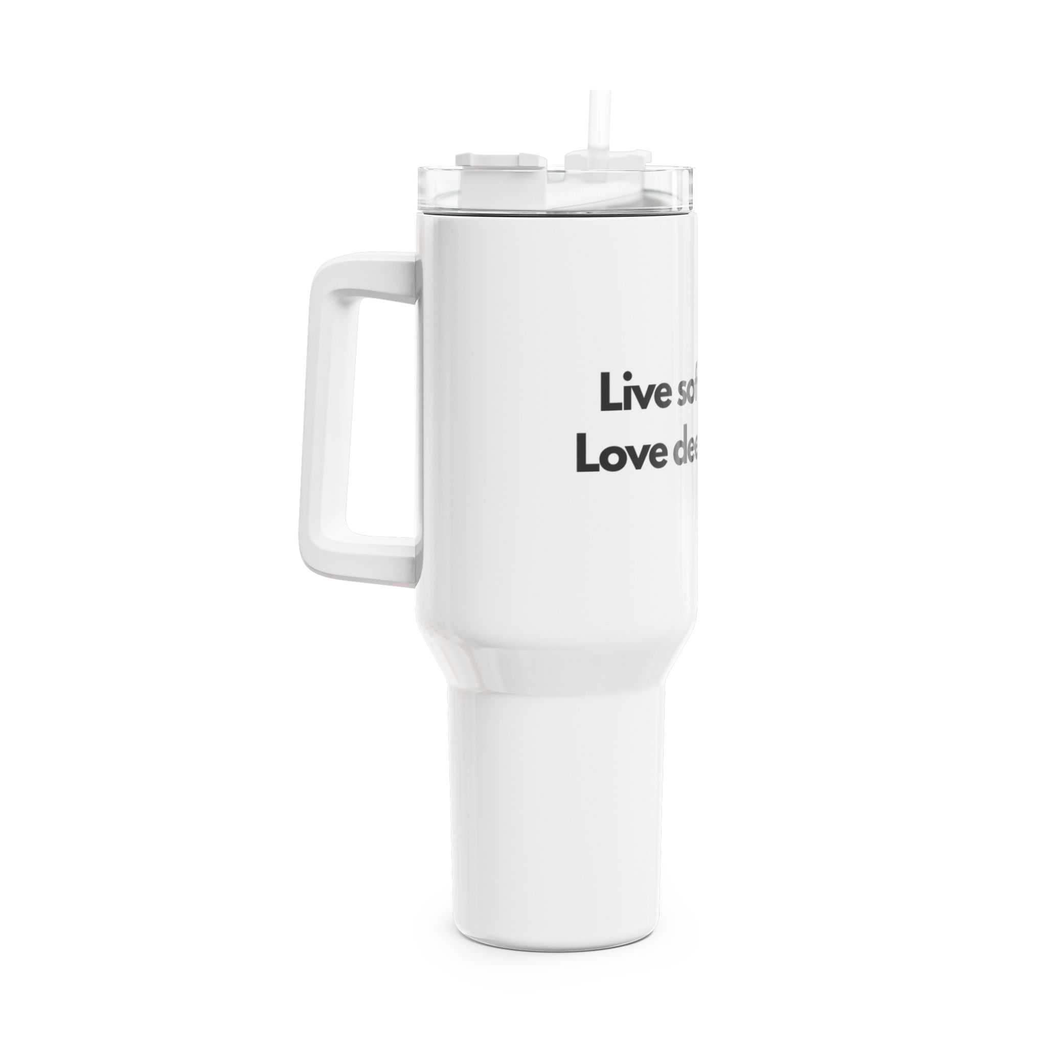 A tall, glossy 40oz tumbler that carries a calm, heartfelt message — small words that settle into your day: “Live softly. Love deeply.” Built for long outings and slow mornings, it holds enough to keep you moving and enough presence to remind you to breathe. The double-wall vacuum insulation keeps coffee warm or iced drinks cold for hours. A clear, rubber-sealed push-down lid with included straw helps prevent spills on the go. The ORCA-coated stainless-steel body keeps printed colors crisp and bright, letting the simple typography stand out against the clean white finish. Durable, BPA-free materials give everyday peace of mind, while the roomy capacity and optional handle make it easy to carry from desk to trail. Hand wash only to preserve the glossy print and coating.