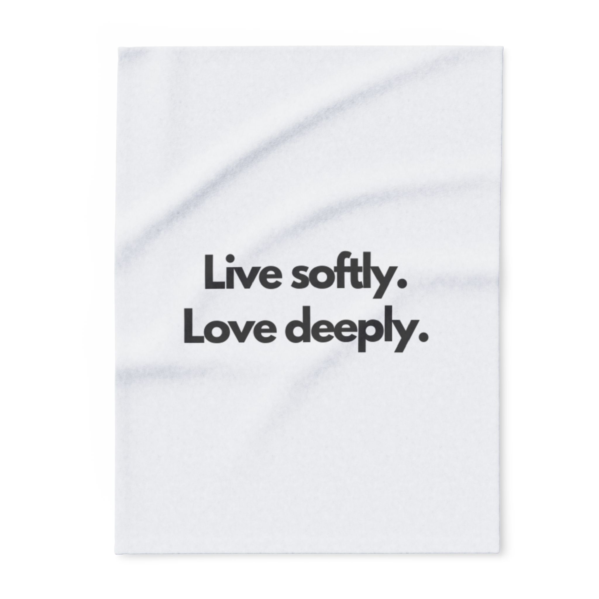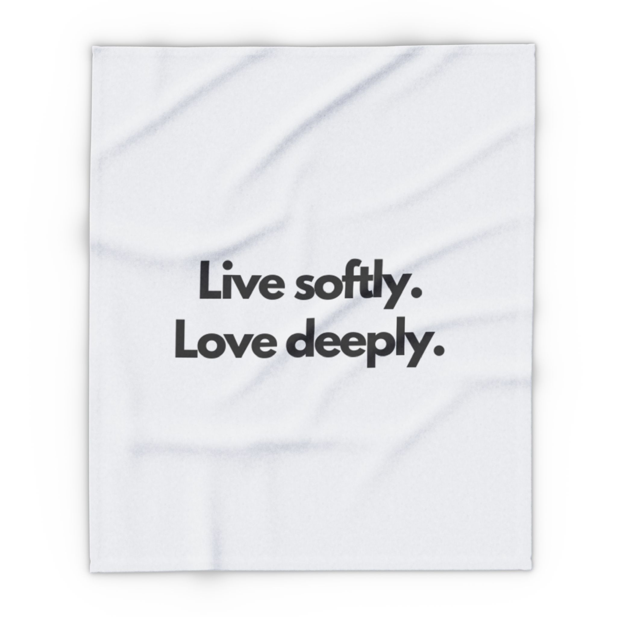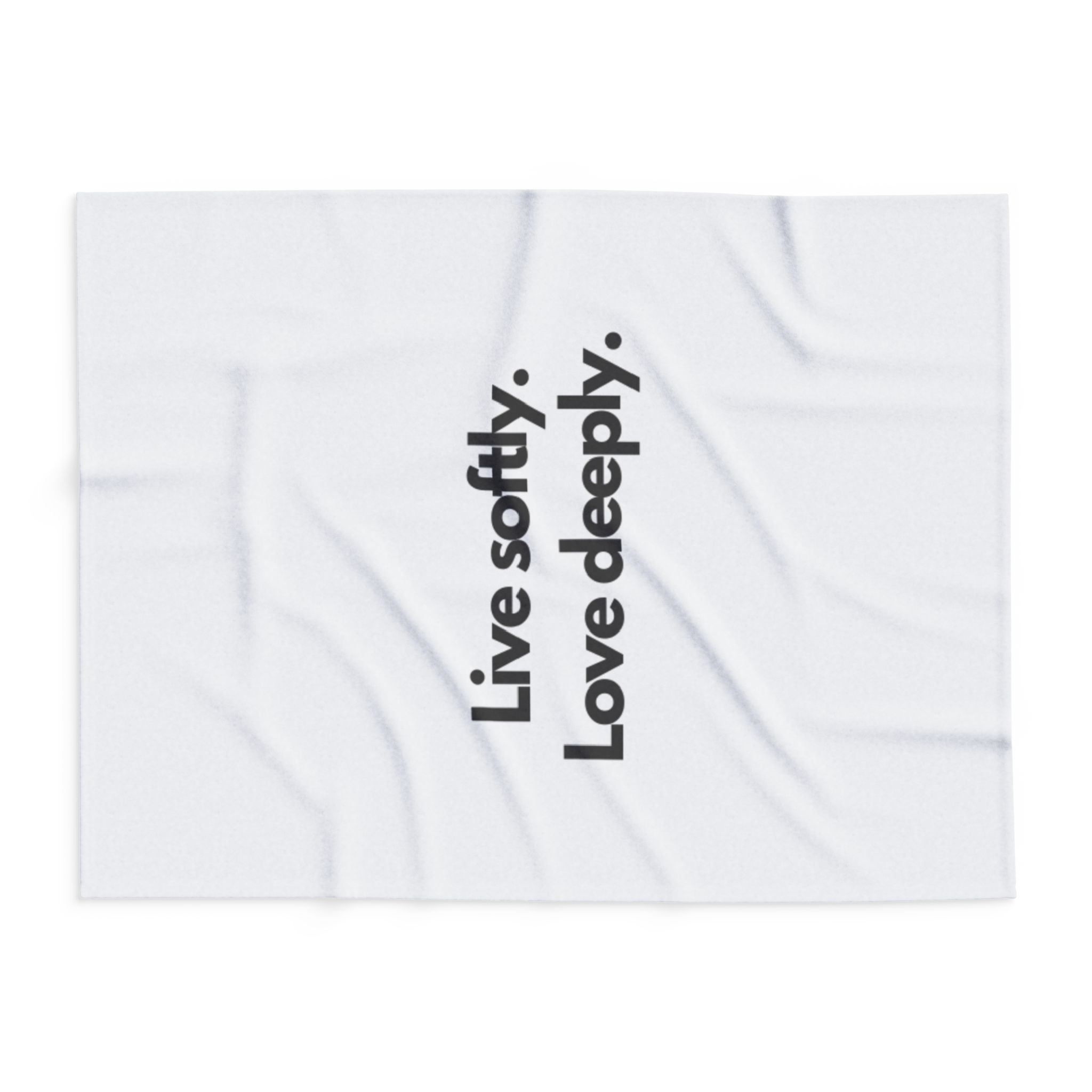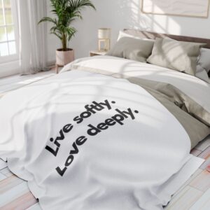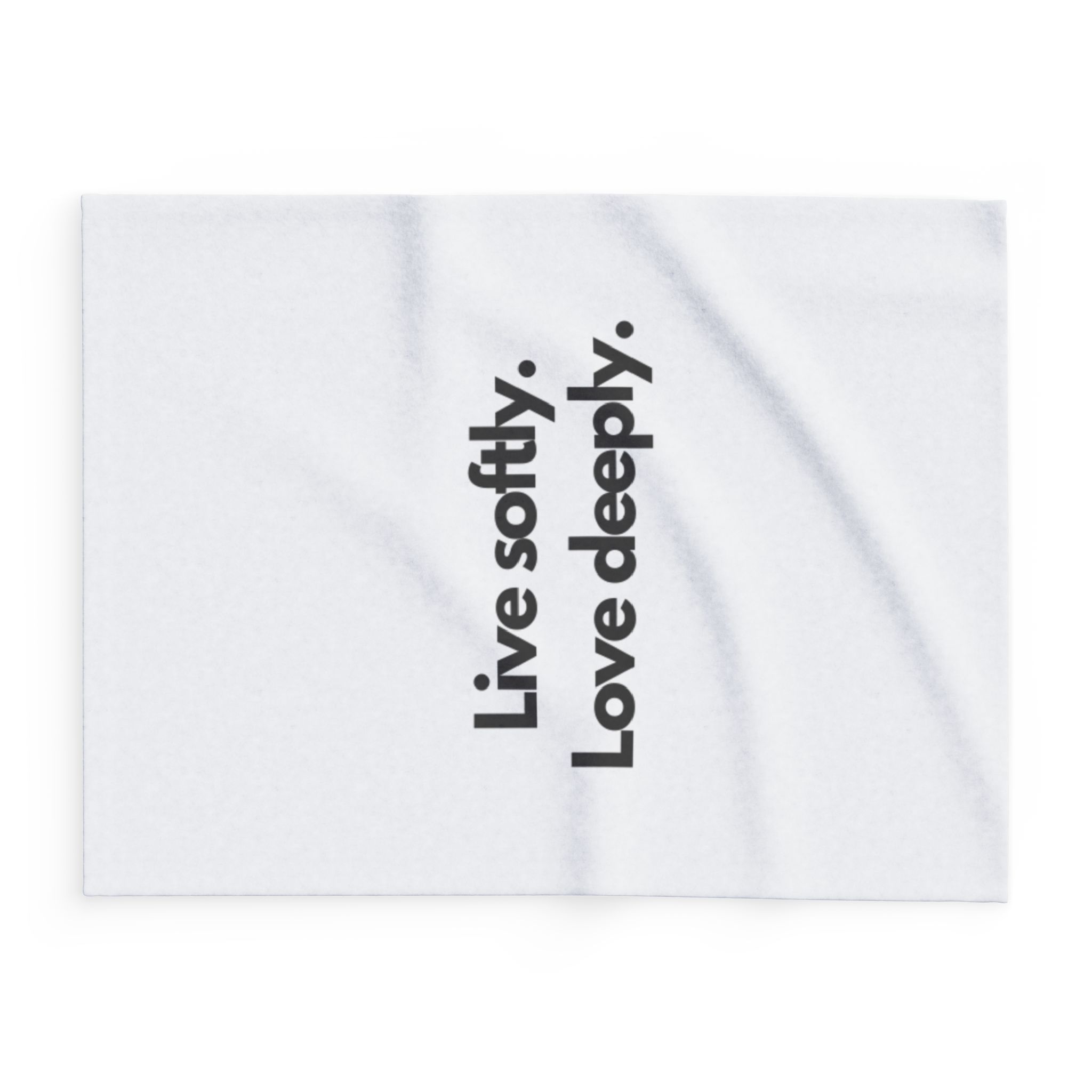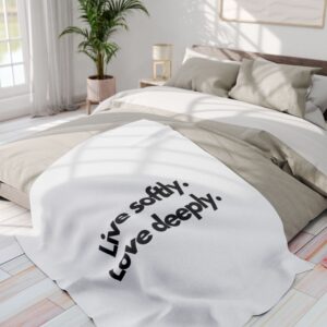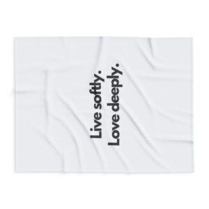A cozy fleece blanket that speaks in quiet, thoughtful words. Soft, plush polyester wraps you in gentle warmth while minimalist black text — “Live softly. Love deeply.” — settles like a calm reminder across a pale, whispering background. It’s the kind of throw you reach for on slow mornings with a mug, the line you read again while tucking in on the couch, and the gentle note left folded on a loved one’s chair. Designed for adults who appreciate subtle, sentimental style, it blends Scandinavian restraint with tactile comfort and bright, lasting print.