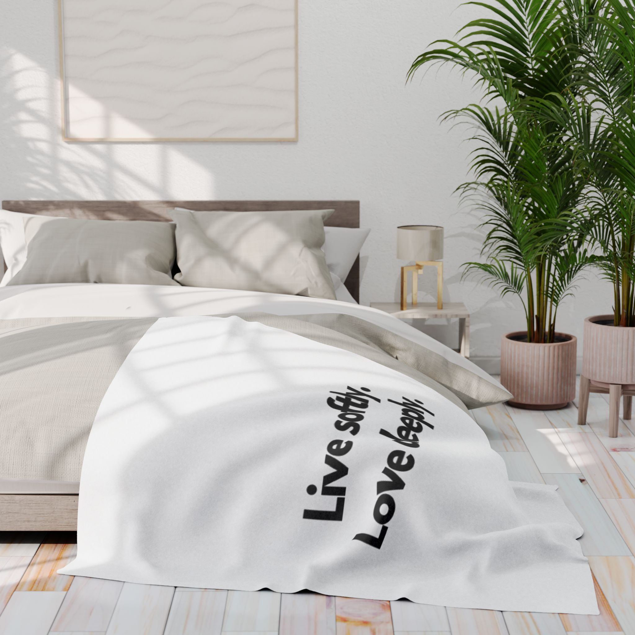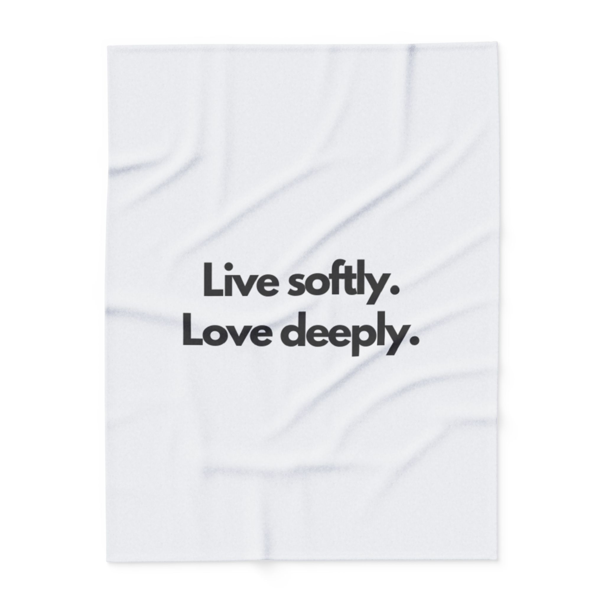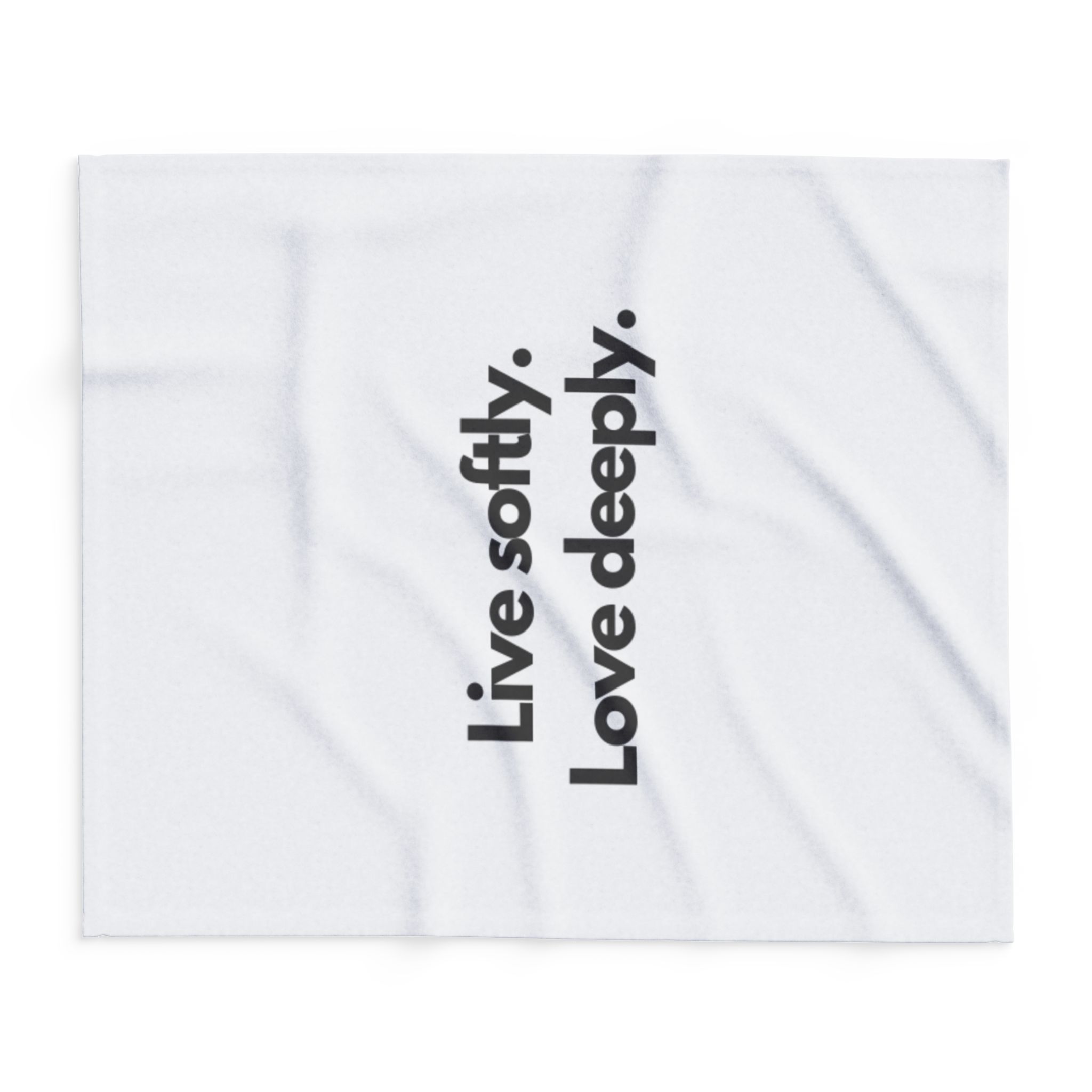 A cozy fleece blanket that speaks in quiet, thoughtful words. Soft, plush polyester wraps you in gentle warmth while minimalist black text — “Live softly. Love deeply.” — settles like a calm reminder across a pale, whispering background. It’s the kind of throw you reach for on slow mornings with a mug, the line you read again while tucking in on the couch, and the gentle note left folded on a loved one’s chair. Designed for adults who appreciate subtle, sentimental style, it blends Scandinavian restraint with tactile comfort and bright, lasting print.