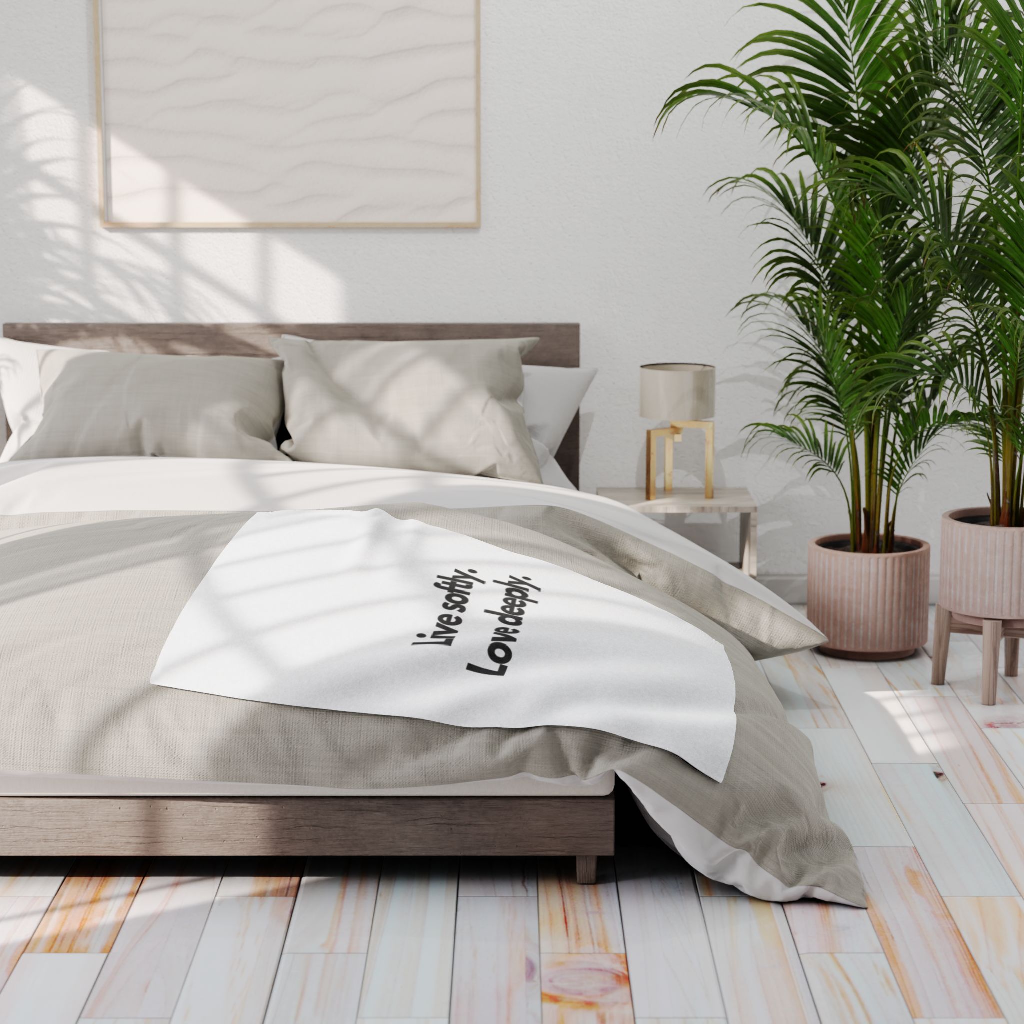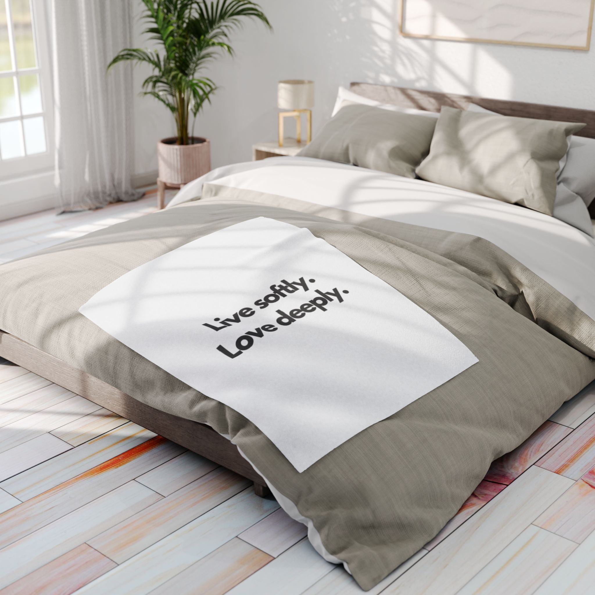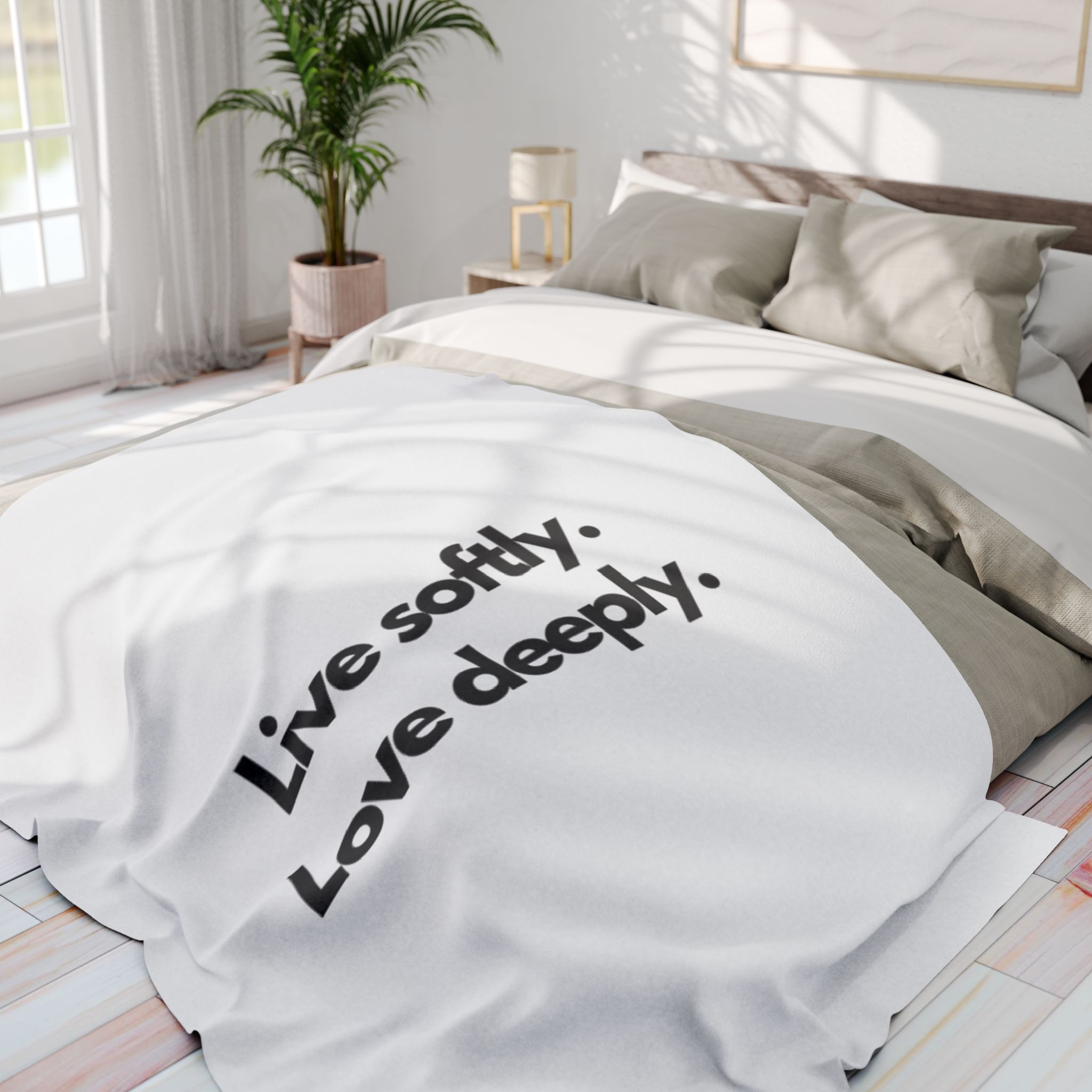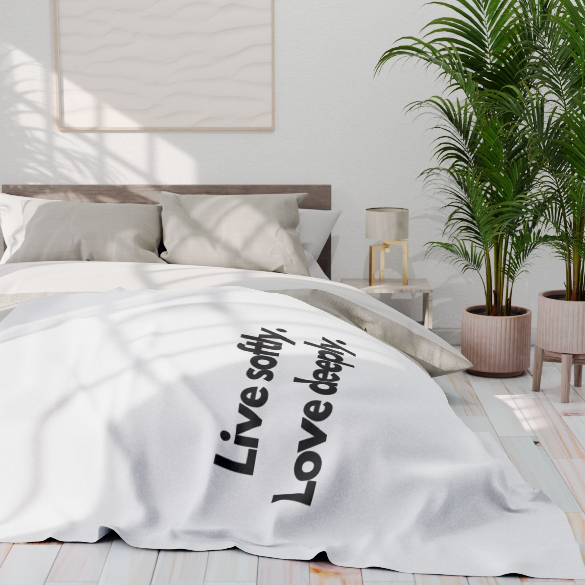 A cozy fleece blanket that speaks in quiet, thoughtful words. Soft, plush polyester wraps you in gentle warmth while minimalist black text — “Live softly. Love deeply.” — settles like a calm reminder across a pale, whispering background. It’s the kind of throw you reach for on slow mornings with a mug, the line you read again while tucking in on the couch, and the gentle note left folded on a loved one’s chair. Designed for adults who appreciate subtle, sentimental style, it blends Scandinavian restraint with tactile comfort and bright, lasting print.