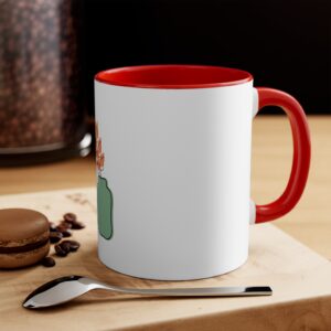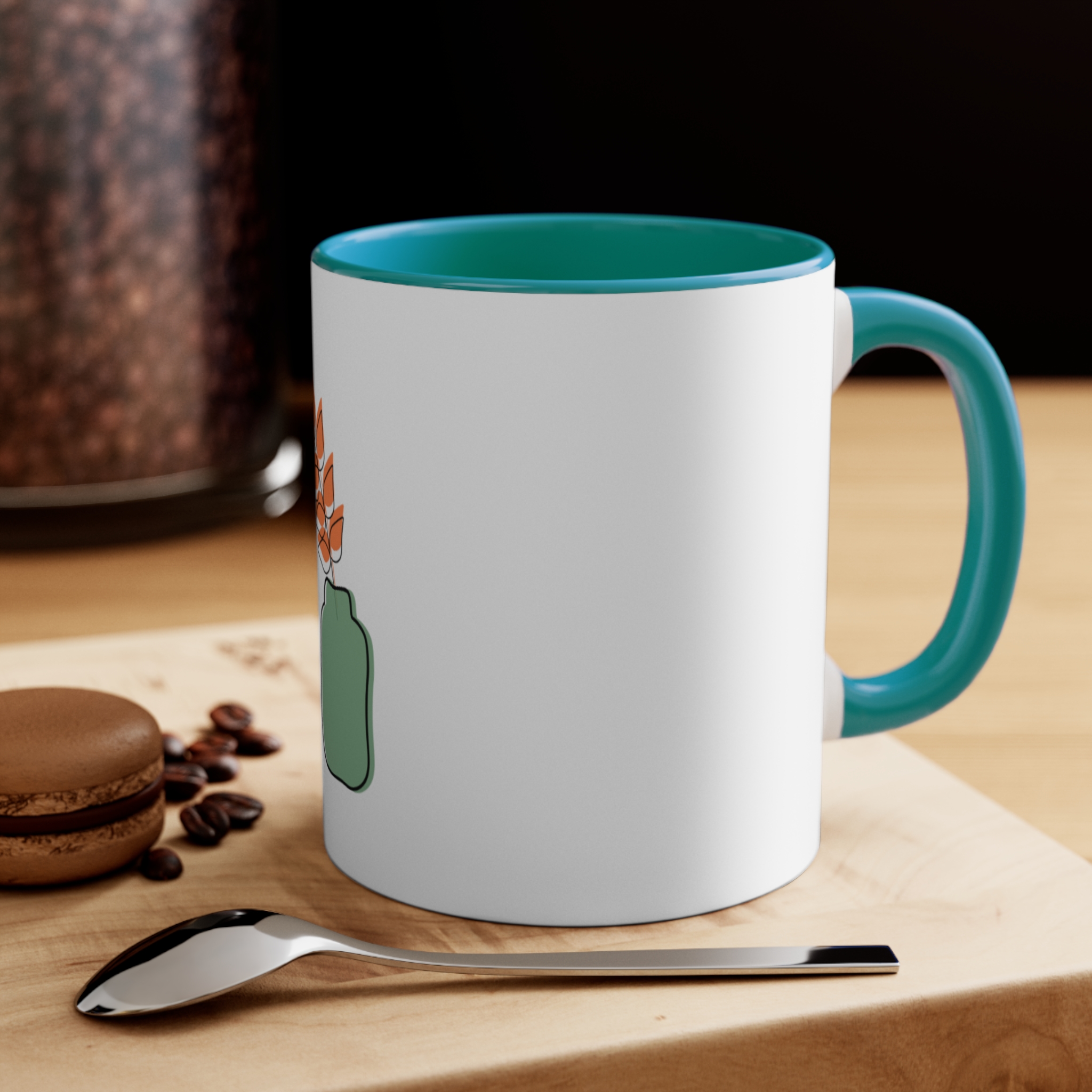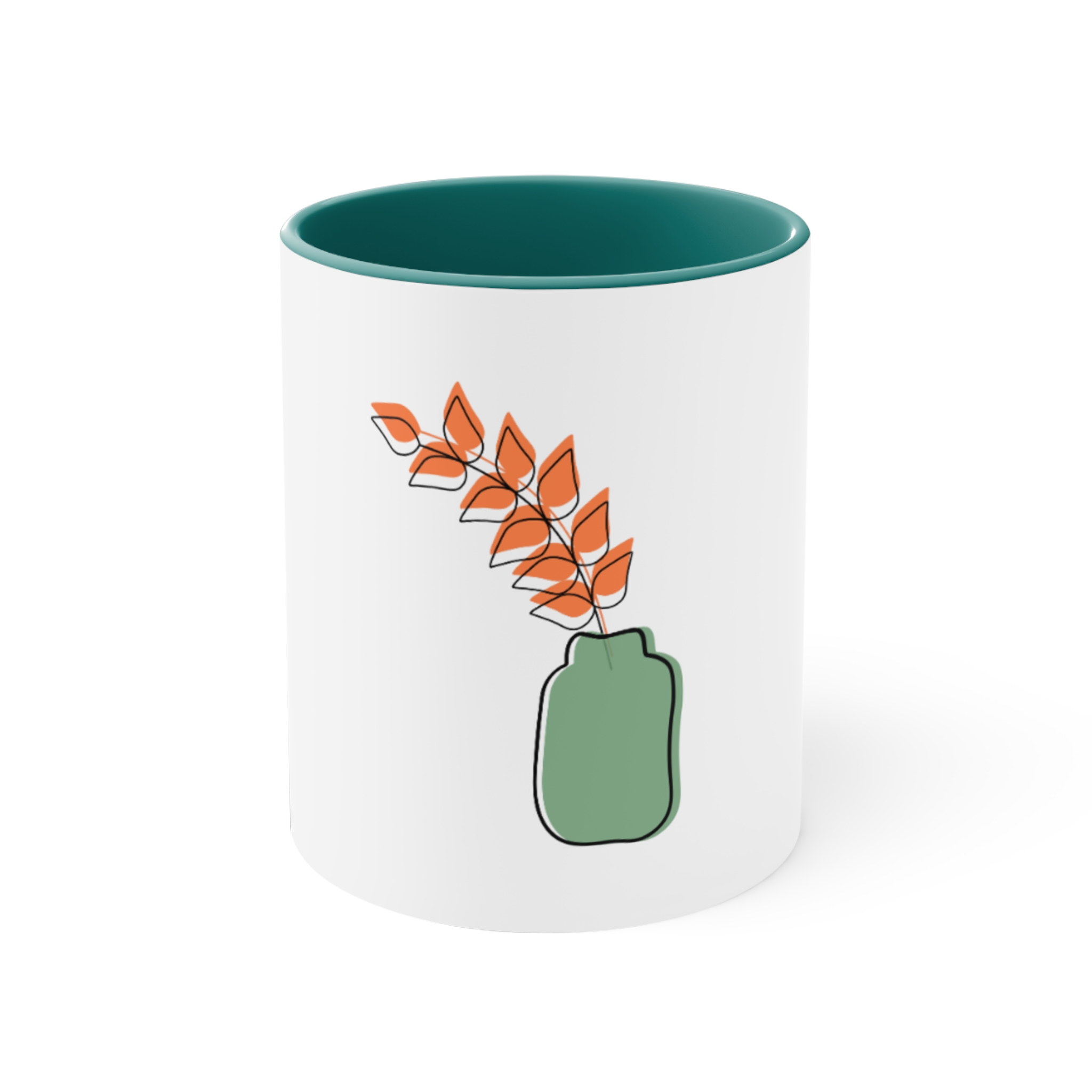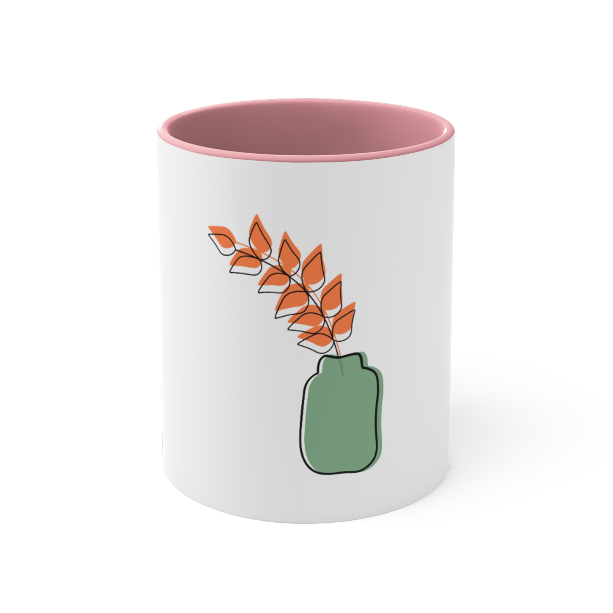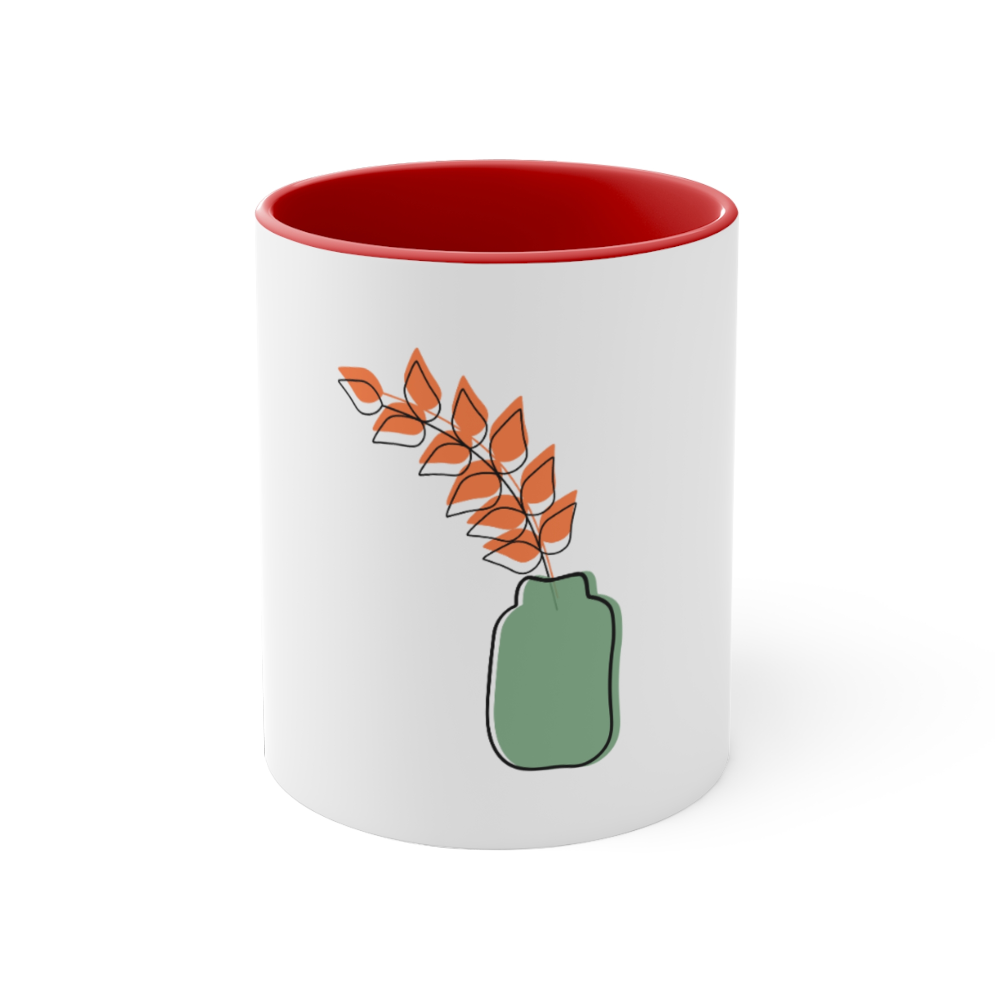 A warm, simple ceramic mug that brings a quiet, cozy moment to morning routines. The white exterior showcases a minimalist illustration of a green vase holding a sprig of orange leaves, while the colored interior and handle add a cheerful pop. The design feels like a tiny still life on your countertop—subtle, homey, and thoughtful—perfect for sitting with coffee, tea, or a moment of pause. It’s made to handle everyday use, keeping its crisp colors through washes and quick reheats in the microwave.