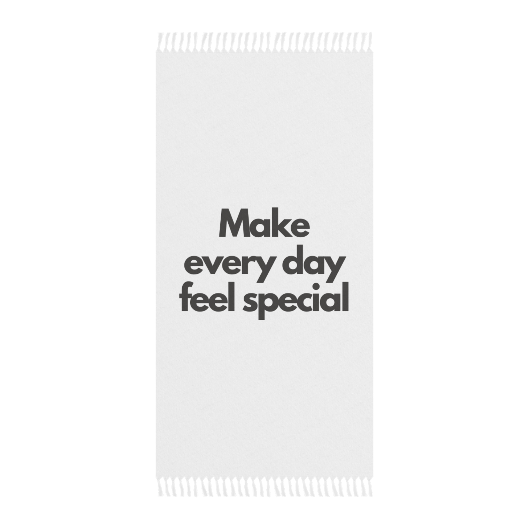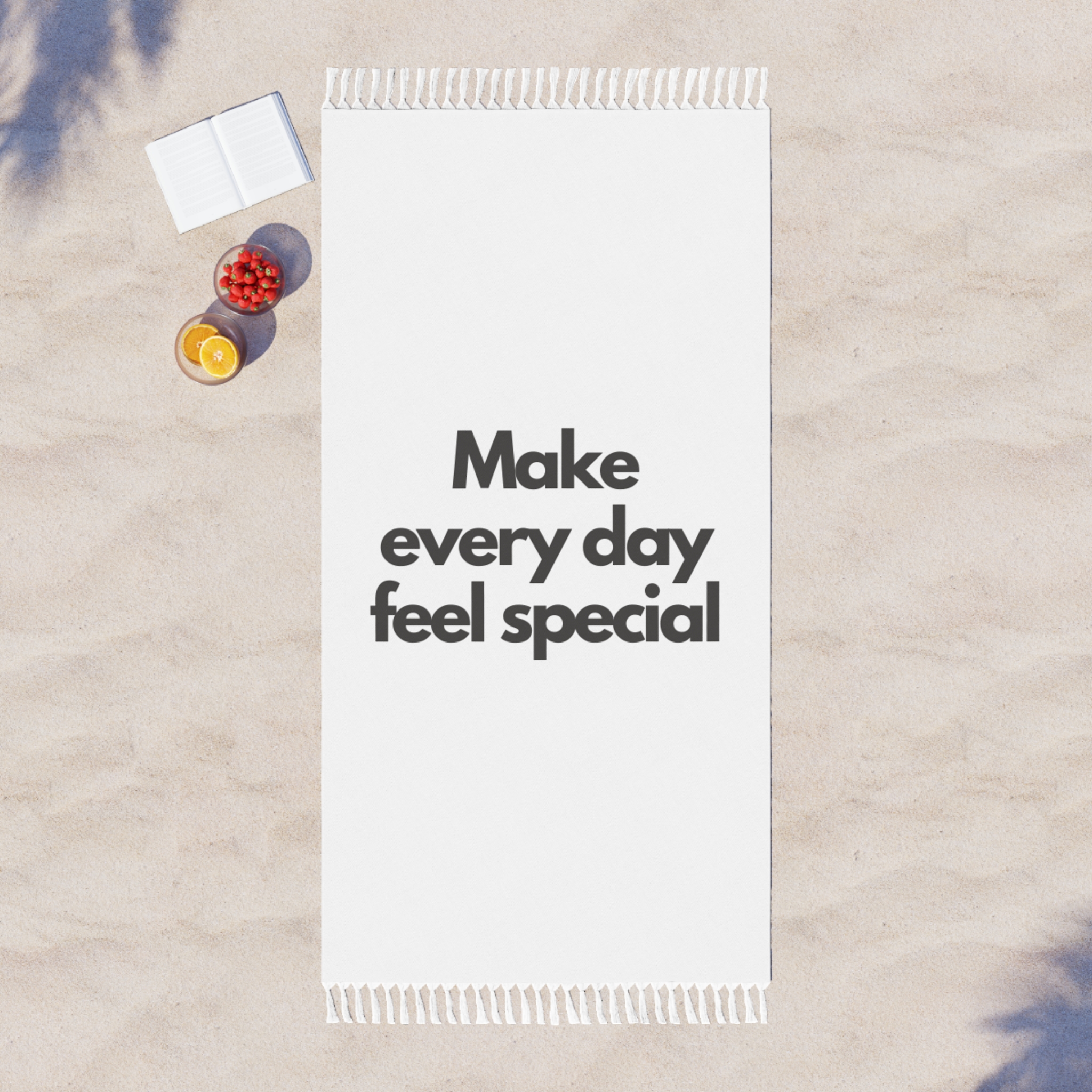 A lightweight, bohemian beach cloth that brings calm and intention to lazy shore days and spontaneous getaways. The large, single-sided print reads a gentle reminder in bold type, making it feel like a little ritual: lay it out, slow down, and let the sun or sea breeze do the rest. Soft-feeling polyester that dries fast and resists stretching keeps the colors bright through travel and repeated use. Knotted tassels along the short edges add tactile charm and a handmade look that suits a laid-back, creative vibe. Fold it into a compact bundle for hikes, toss it in a beach bag for sunny afternoons, or spread it under a picnic blanket when you want a quiet moment by the water.