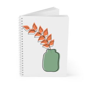 A light, thoughtfully designed spiral notebook that brings a quiet moment of creativity to your day. The semi-gloss laminated cover features a hand-drawn vase and foliage in warm orange and soft green — simple, modern, and calm. Inside, 128 ruled pages of smooth 90gsm paper welcome lists, sketches, journal entries, and plans without bleed or fuzz. The white metal spiral lies flat for easy writing and allows pages to be removed cleanly. Bright, crisp printing on both front and back keeps the artwork vivid through everyday use. Carry it to a café, tuck it in a tote, or keep it on your bedside table as a small, steady companion for ideas and intentions.