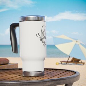 Light and airy, this 14 oz stainless steel travel mug carries a quiet kind of joy. Its simple continuous-line butterfly design rests on a glossy white enamel canvas, so every sip feels like a small, calm pause. The comfortable handle and spill-resistant snap-on cap keep your drink close and steady during short commutes, studio sessions, or walks between meetings. It holds warmth without shouting about it — just reliable insulation and bright, lasting color that matches a minimalist, nature-minded rhythm.