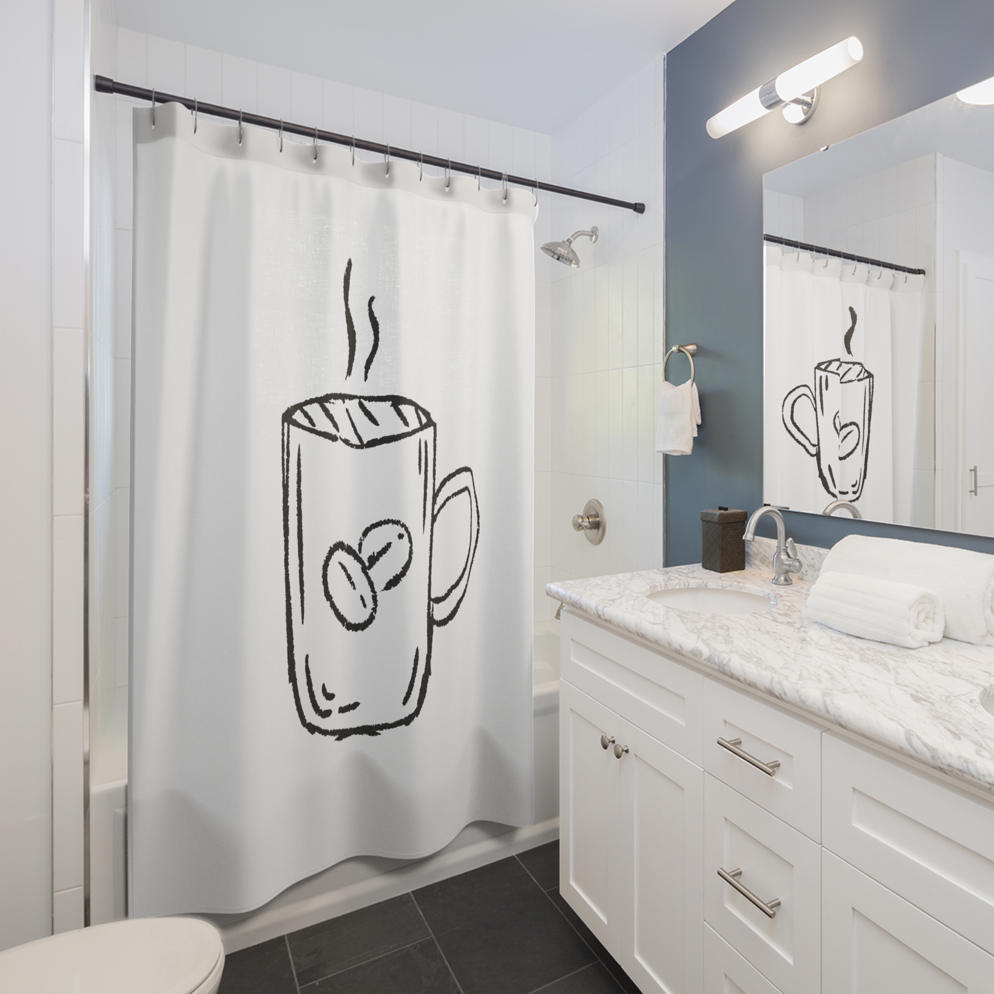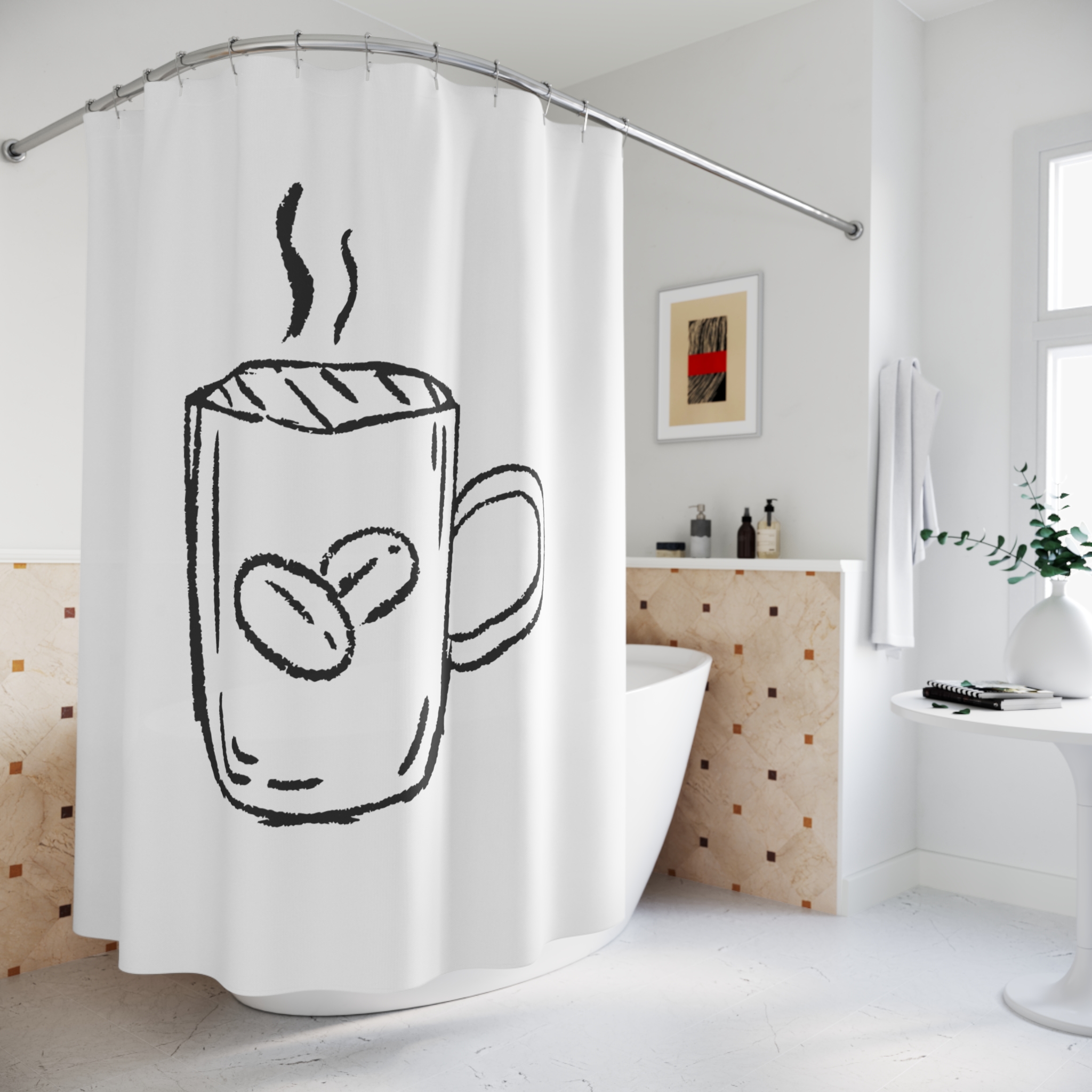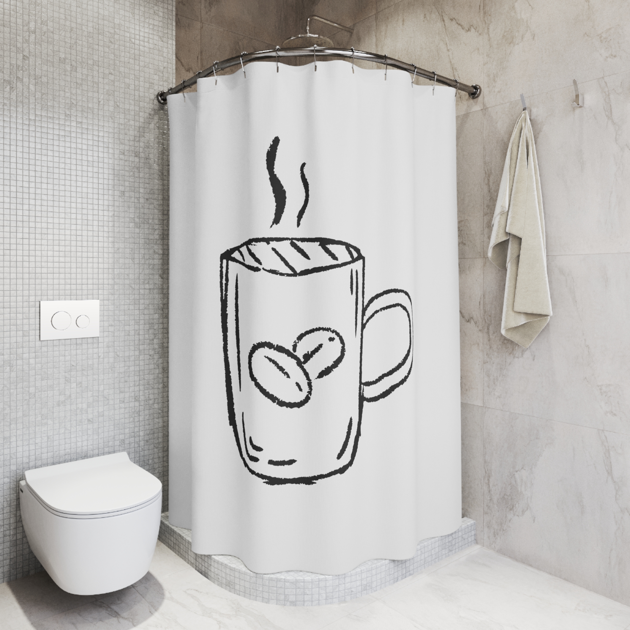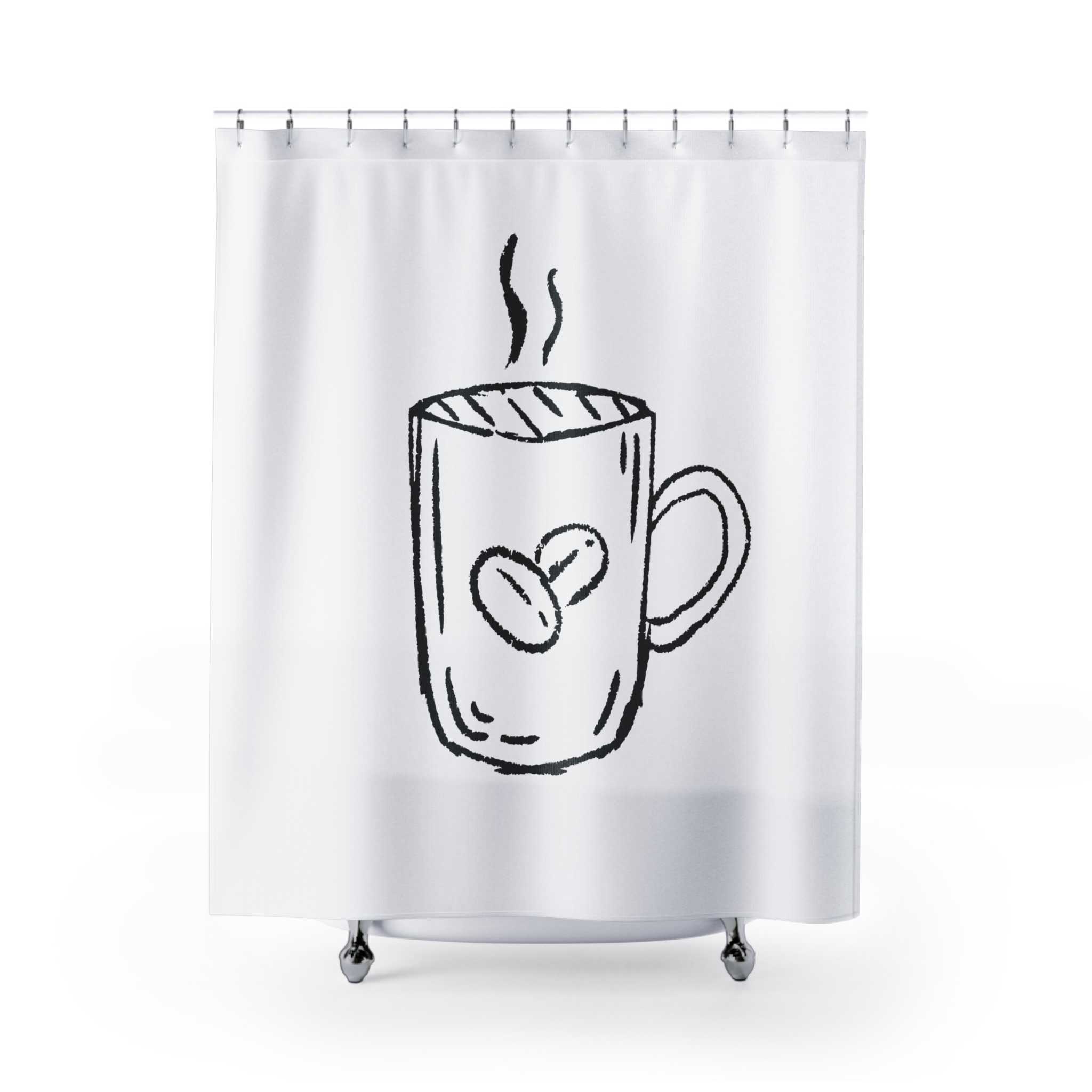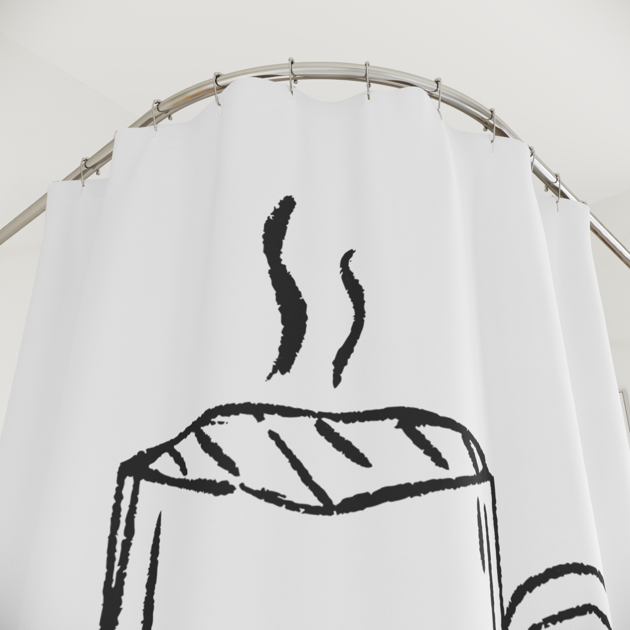 Wake up your bathroom with a simple, hand-sketched vibe. This polyester shower curtain features a loose, charcoal-style illustration of a steaming coffee mug—soft, imperfect lines that feel like a quick morning doodle. It hangs with twelve reinforced buttonholes for standard hooks (hooks not included) and offers one-sided printing on a bright white backdrop that keeps the design airy and uncluttered. The fabric resists wrinkles and dries quickly, making it an effortless, low-maintenance choice for a lived-in, cozy space. It brings a quiet, everyday warmth to morning routines and small moments of comfort.