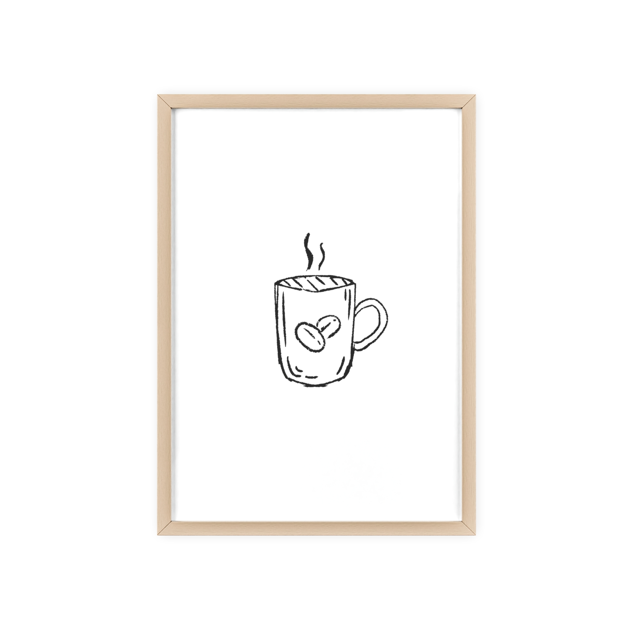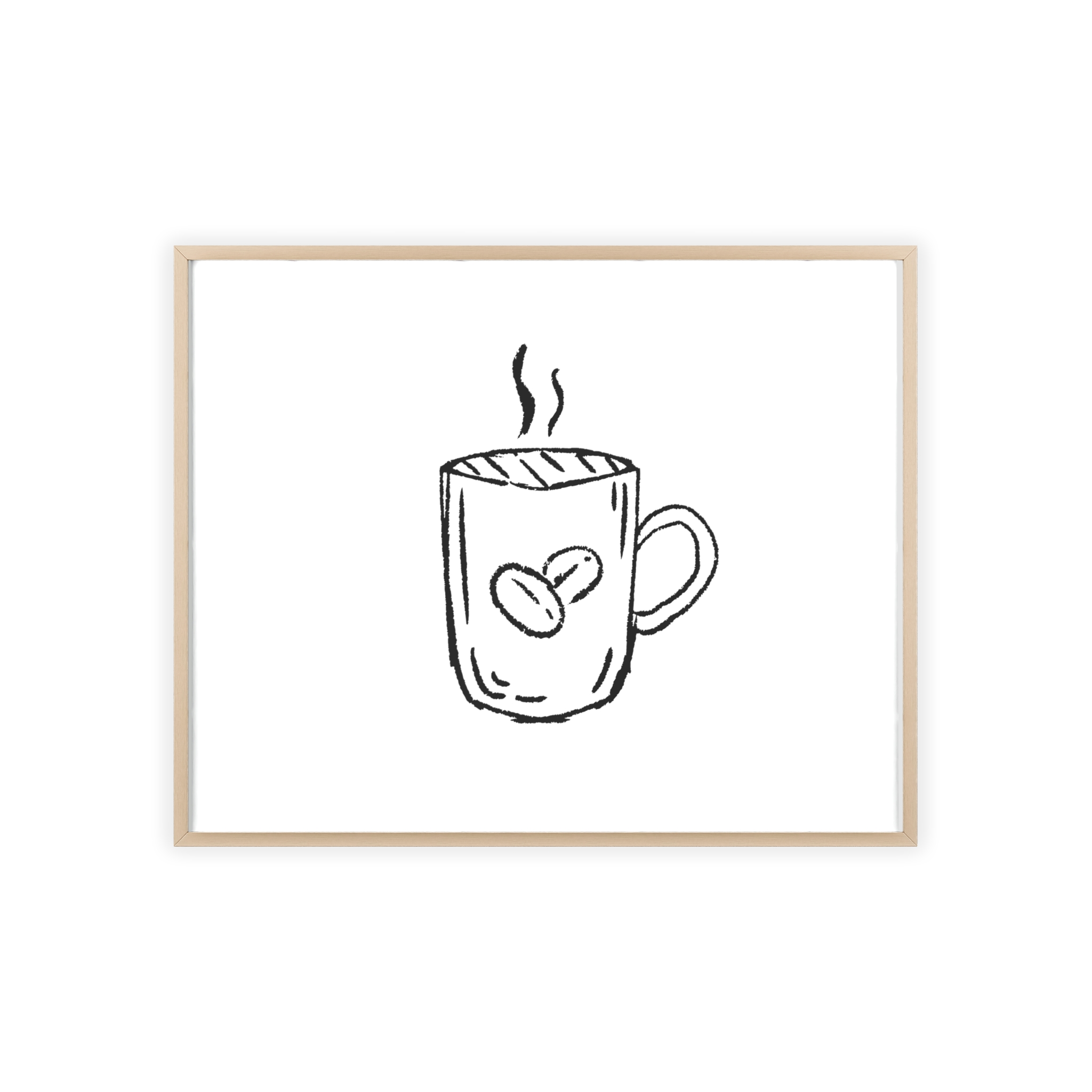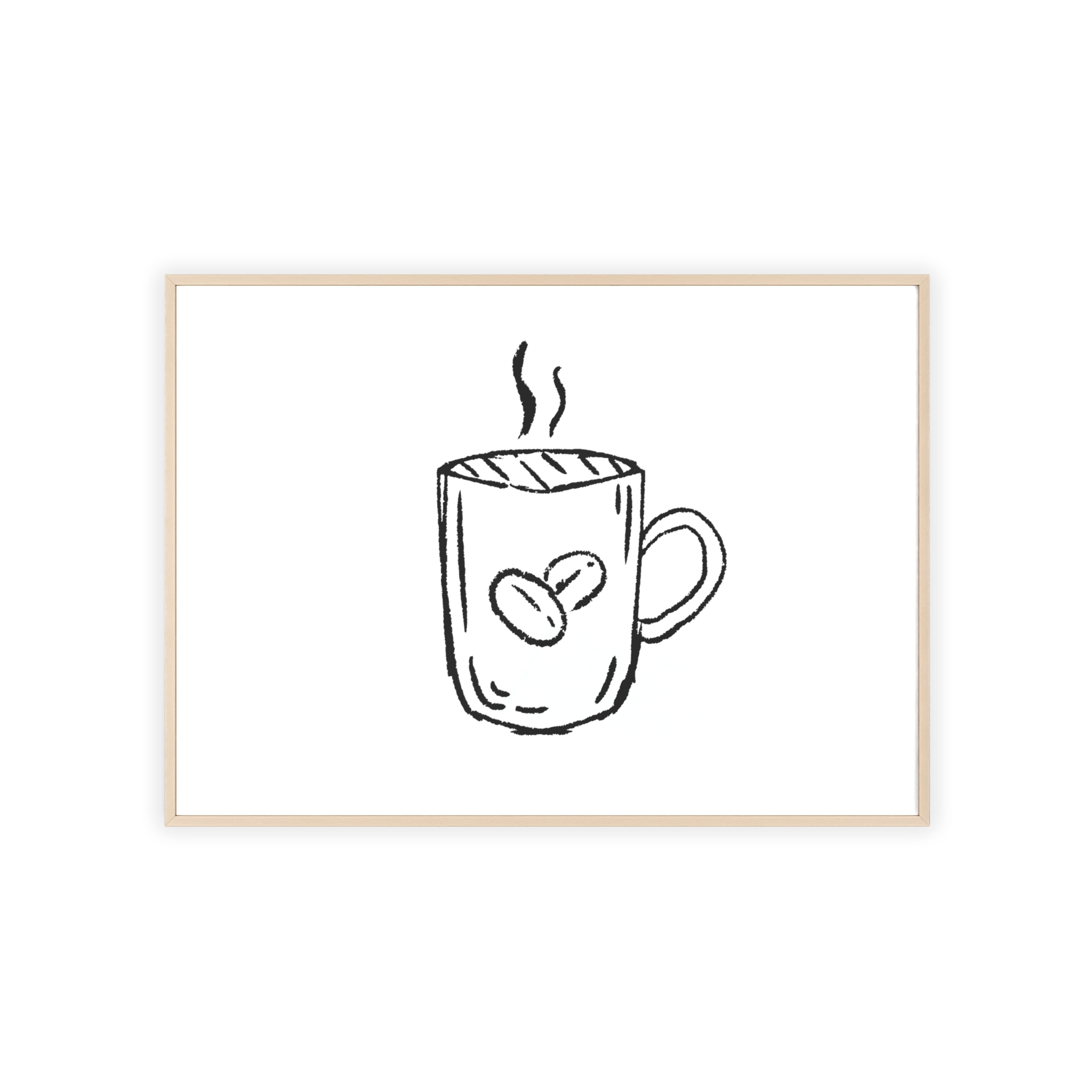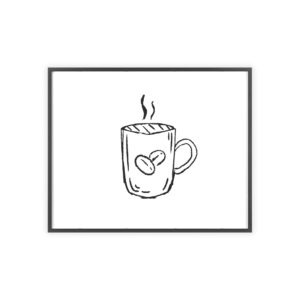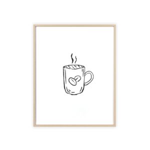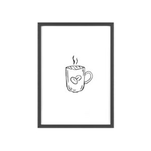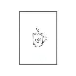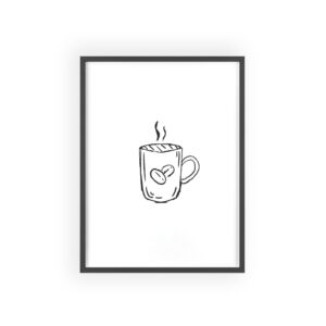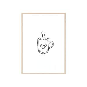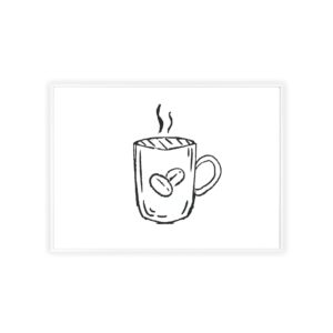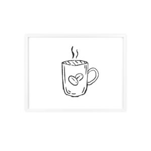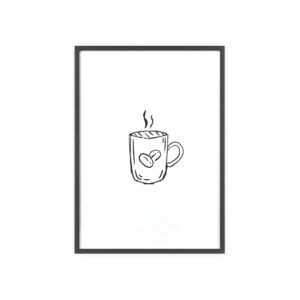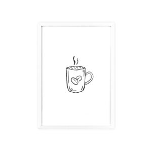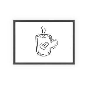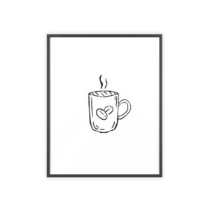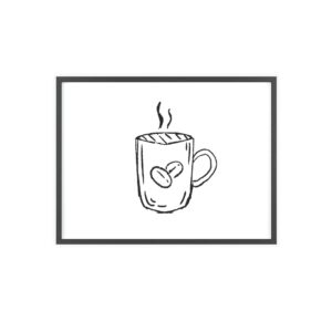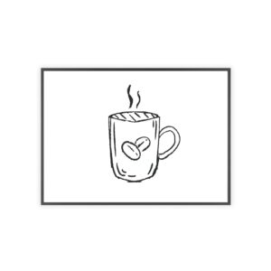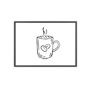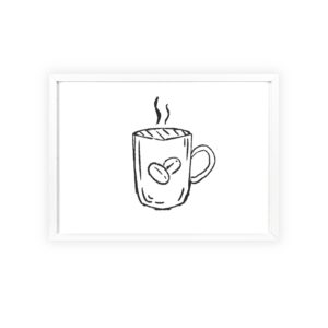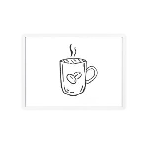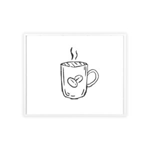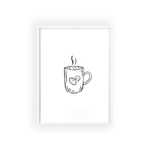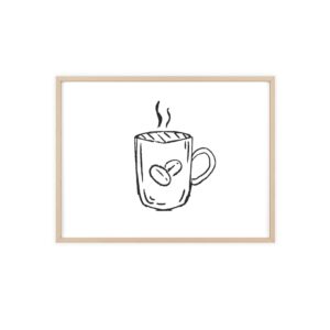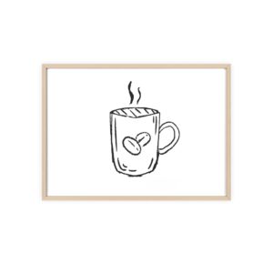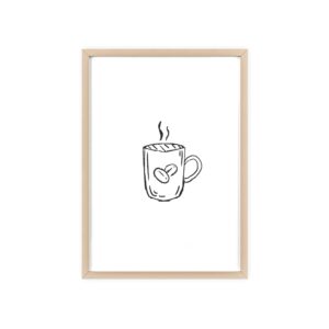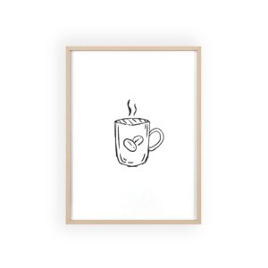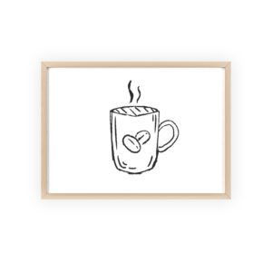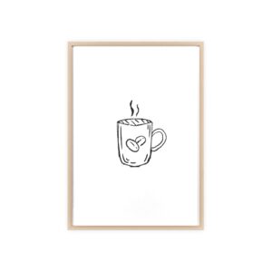 A minimalist framed poster that brings quiet, cozy energy to kitchen nooks and coffee corners. The hand-drawn coffee mug illustration sits on clean white paper, framed in a slim pinewood border available in Natural, Black, or White. The satin or matte photographic paper keeps lines crisp while the protective acrylic glass preserves the soft, sketch-like character. Hung horizontally or vertically, this piece feels like a gentle morning ritual—simple, warm, and thoughtfully finished for immediate display.