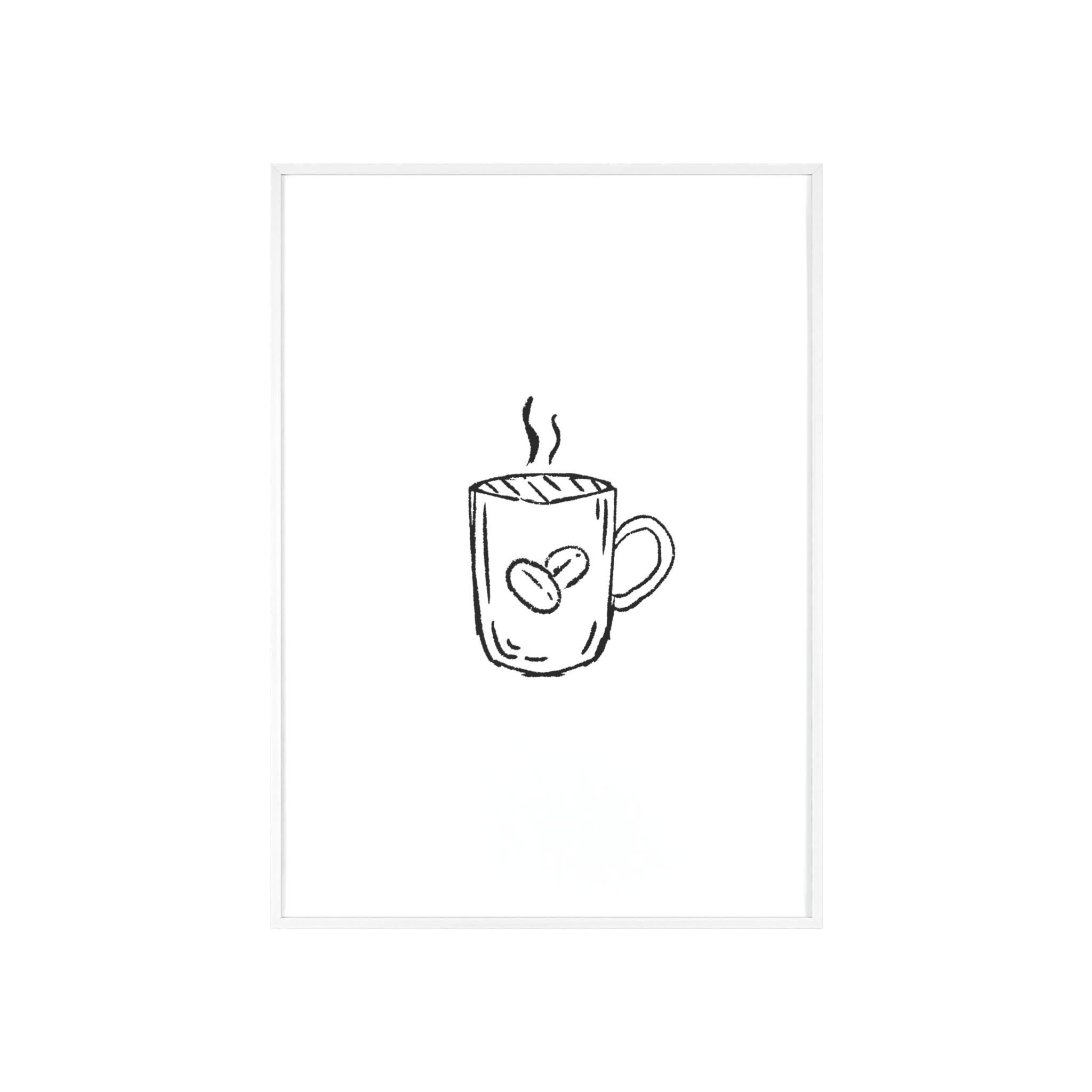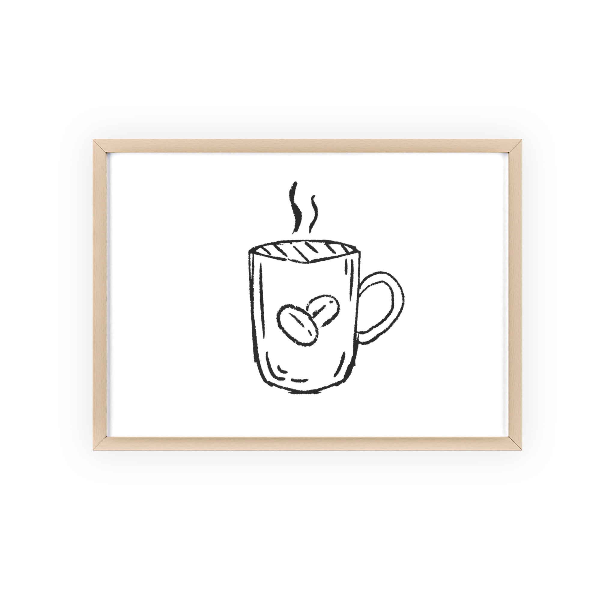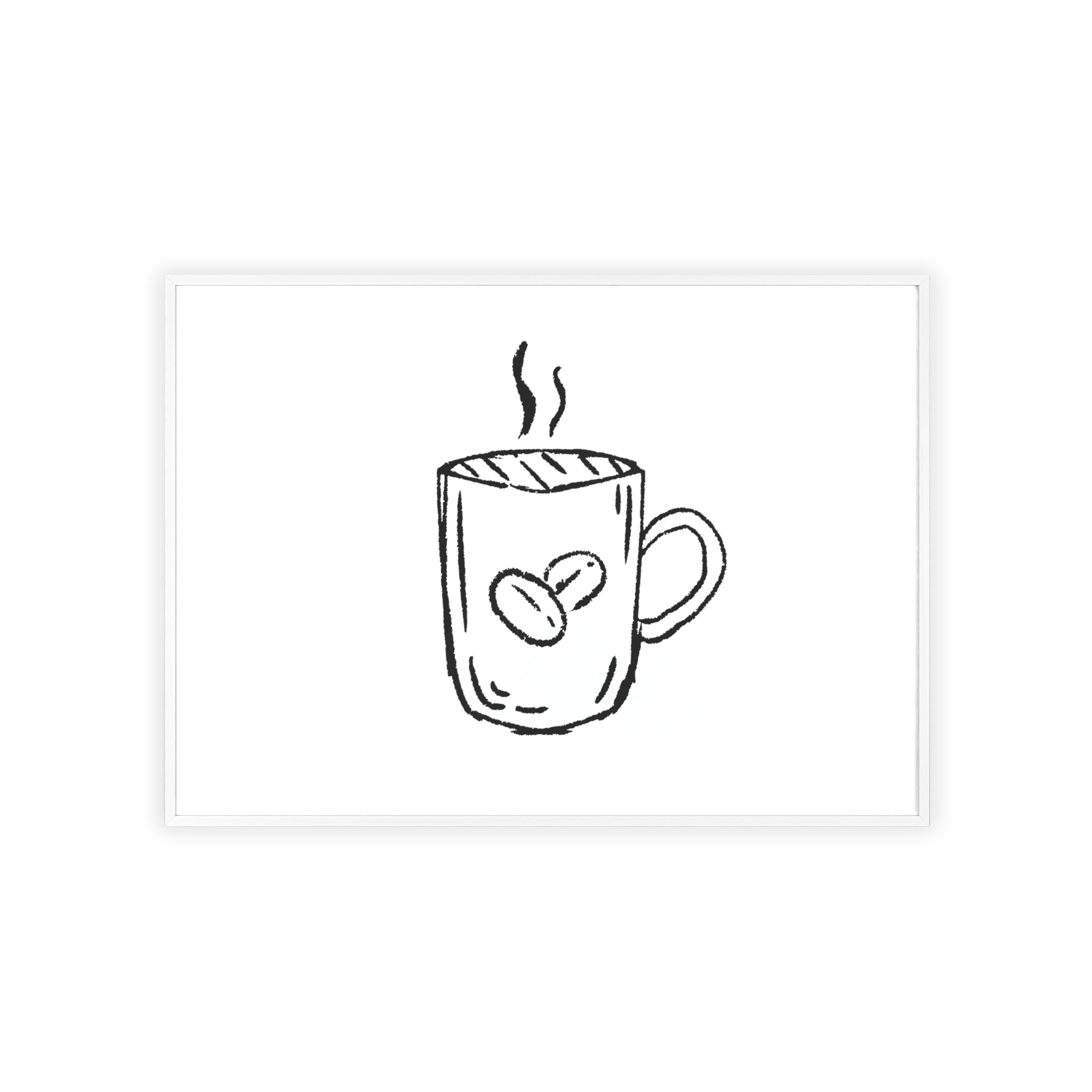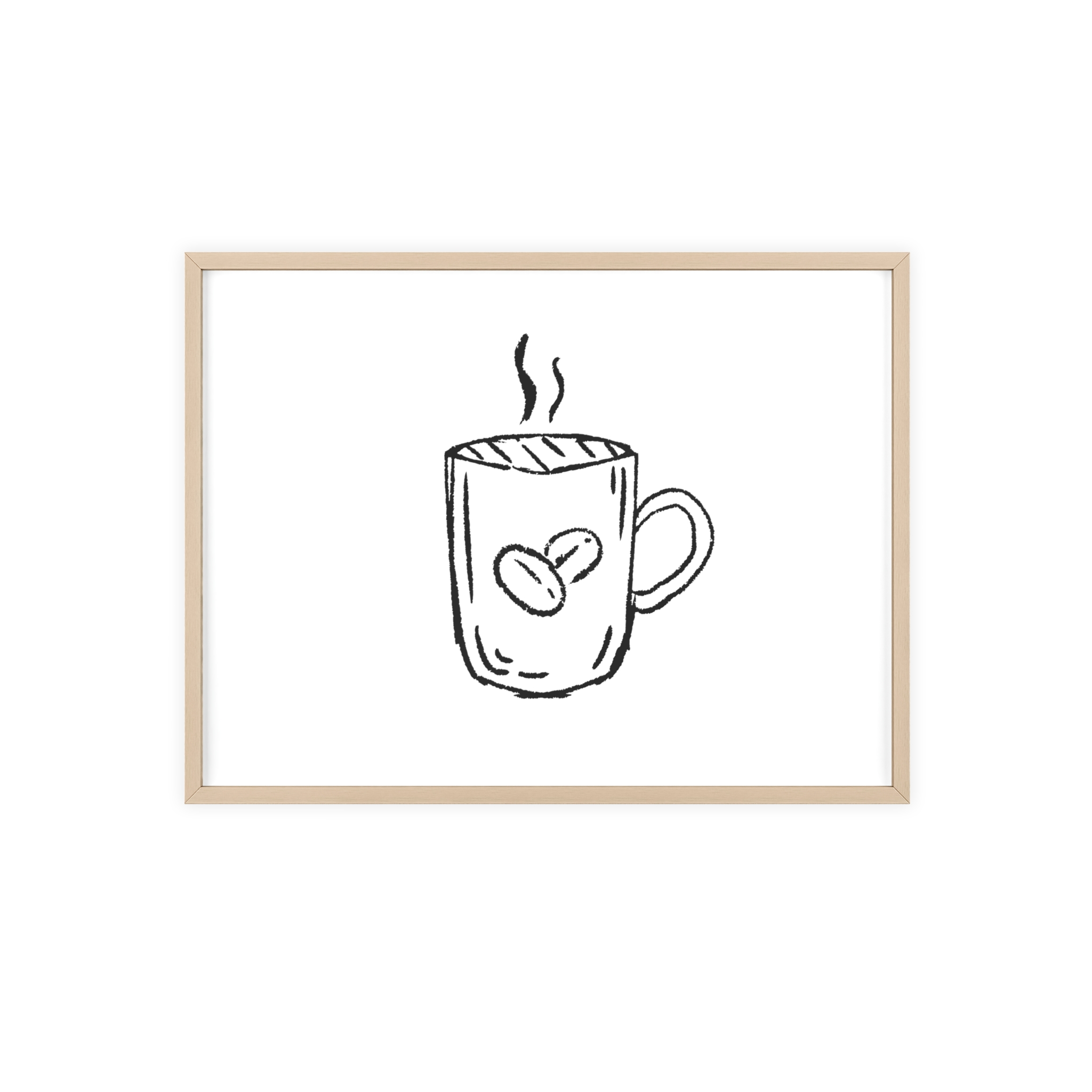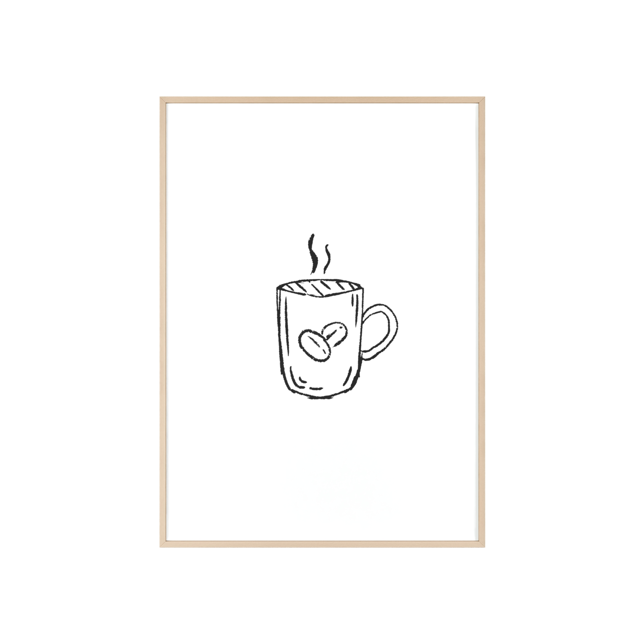 A minimalist framed poster that brings quiet, cozy energy to kitchen nooks and coffee corners. The hand-drawn coffee mug illustration sits on clean white paper, framed in a slim pinewood border available in Natural, Black, or White. The satin or matte photographic paper keeps lines crisp while the protective acrylic glass preserves the soft, sketch-like character. Hung horizontally or vertically, this piece feels like a gentle morning ritual—simple, warm, and thoughtfully finished for immediate display.