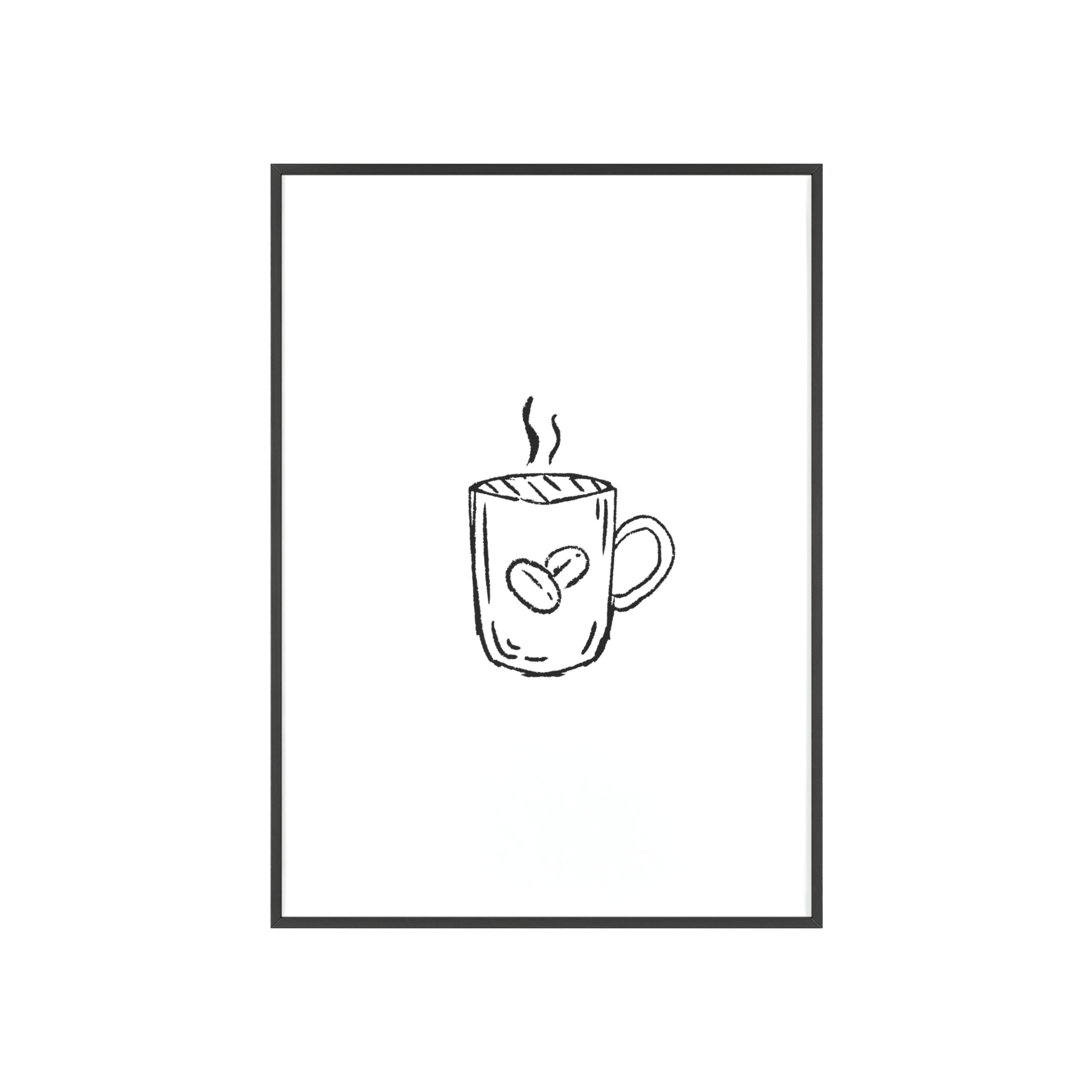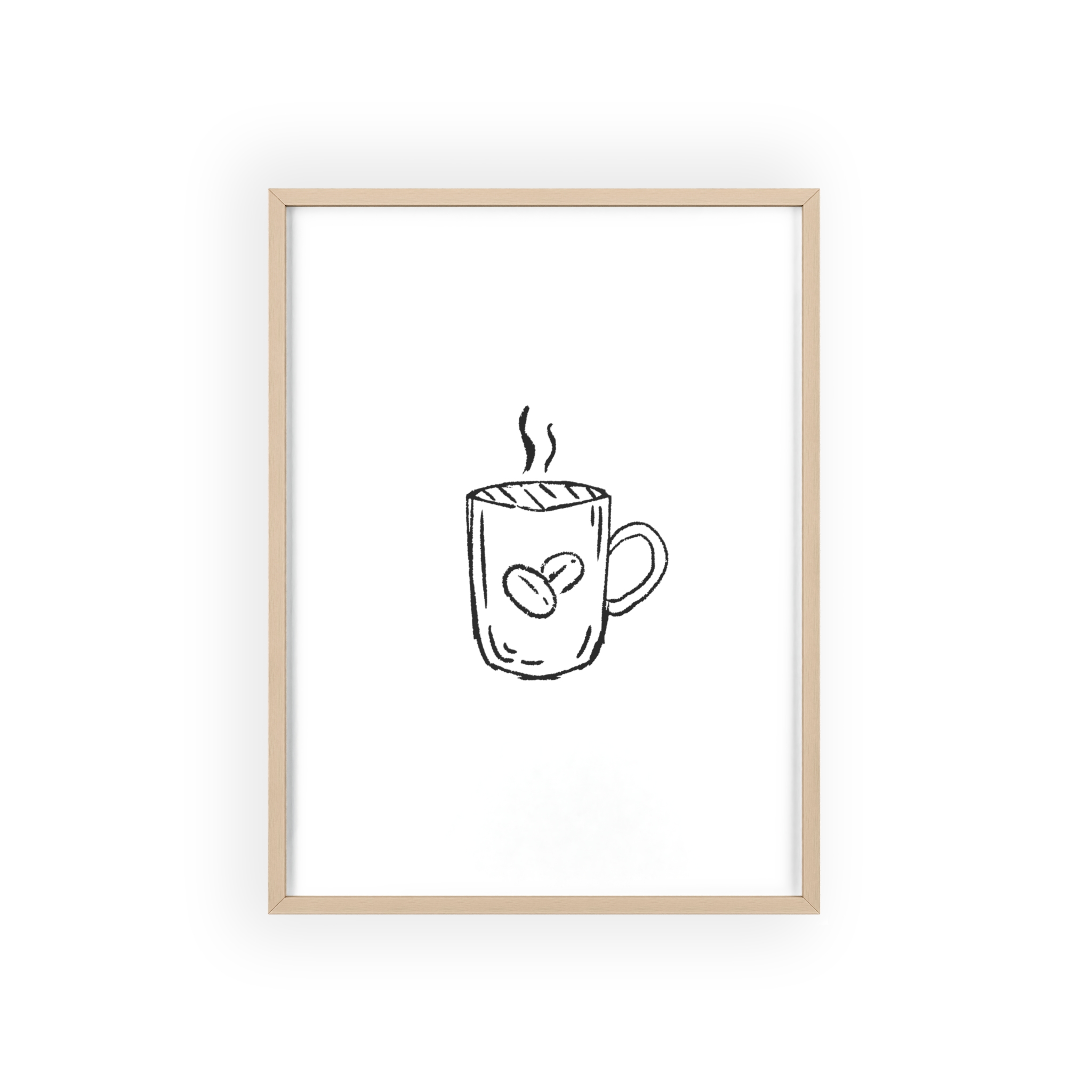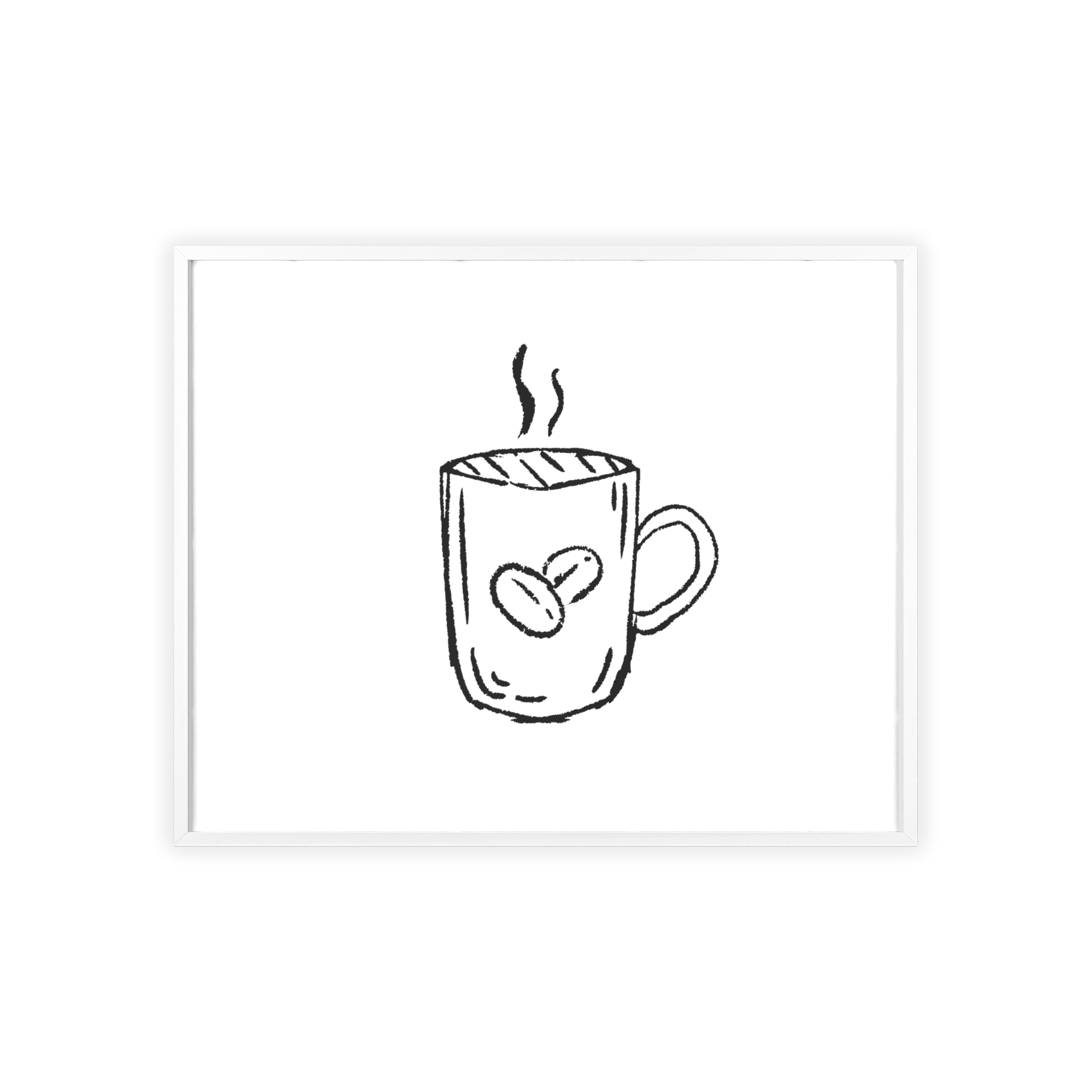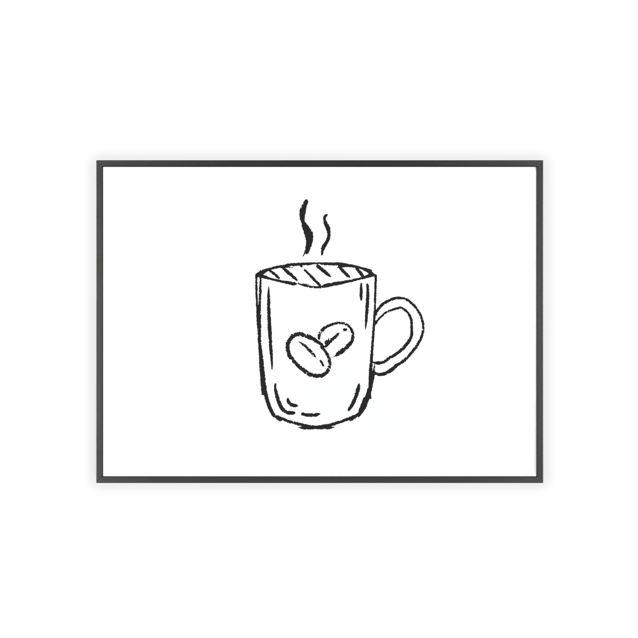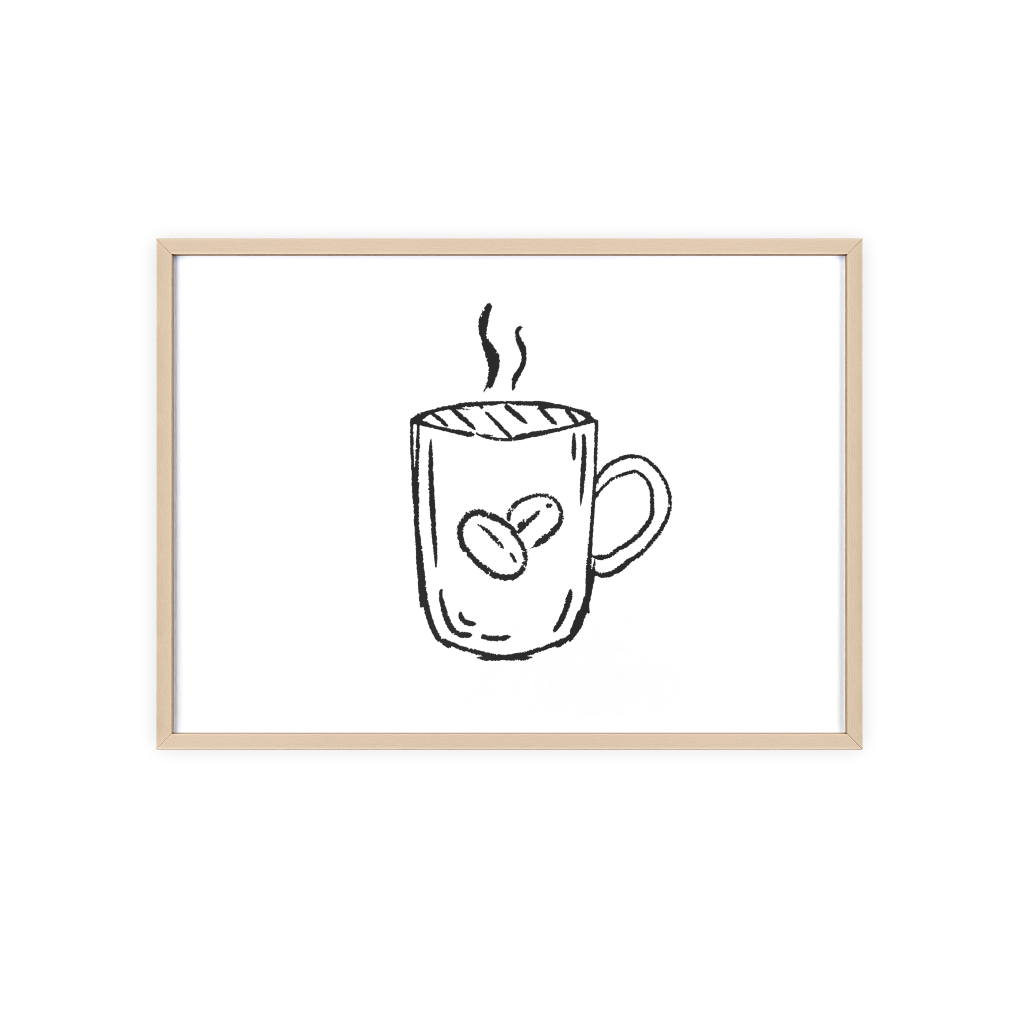 A minimalist framed poster that brings quiet, cozy energy to kitchen nooks and coffee corners. The hand-drawn coffee mug illustration sits on clean white paper, framed in a slim pinewood border available in Natural, Black, or White. The satin or matte photographic paper keeps lines crisp while the protective acrylic glass preserves the soft, sketch-like character. Hung horizontally or vertically, this piece feels like a gentle morning ritual—simple, warm, and thoughtfully finished for immediate display.