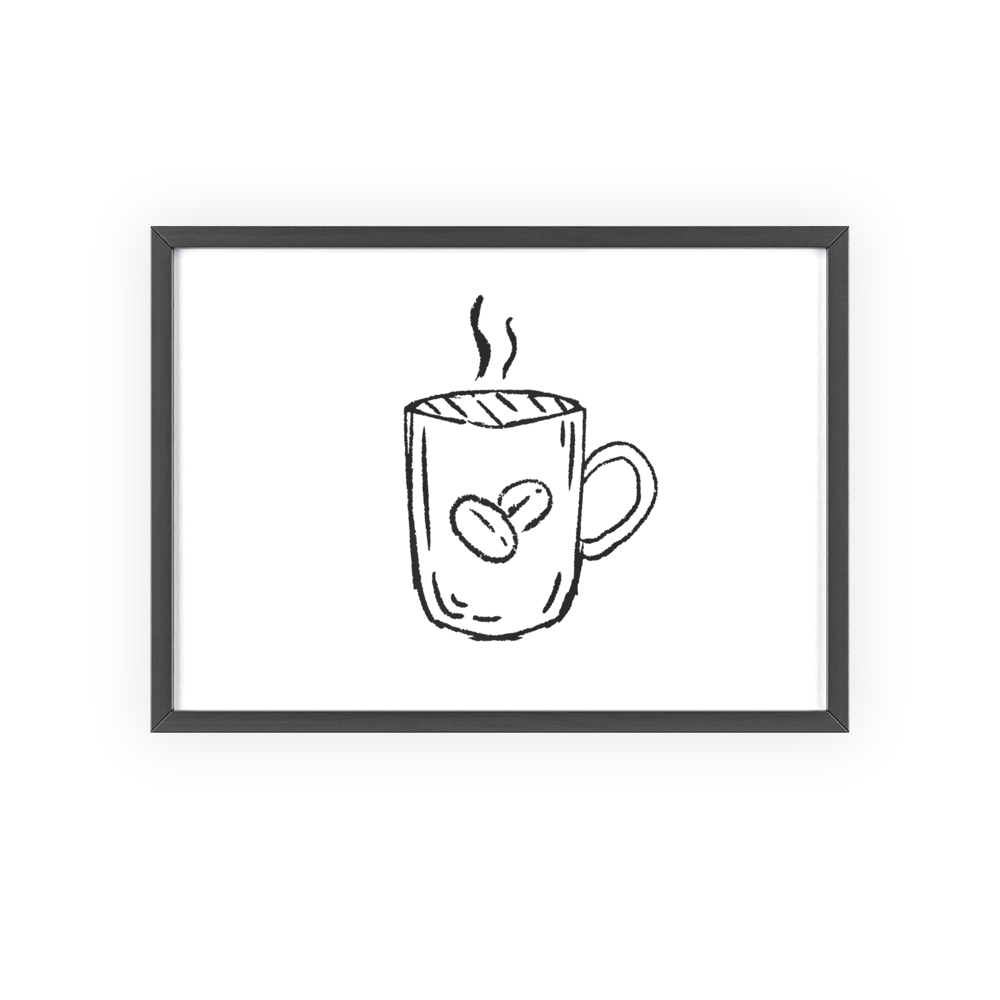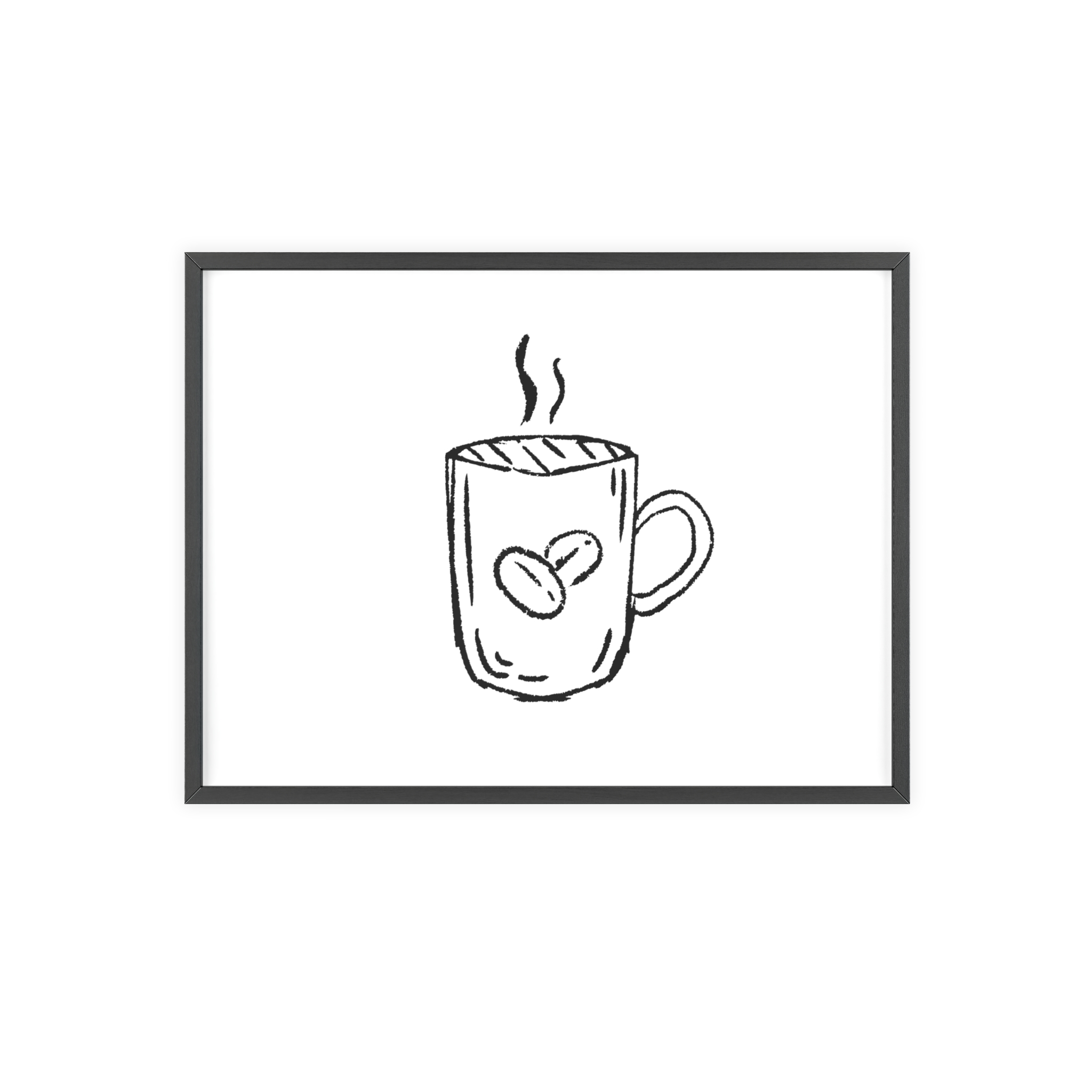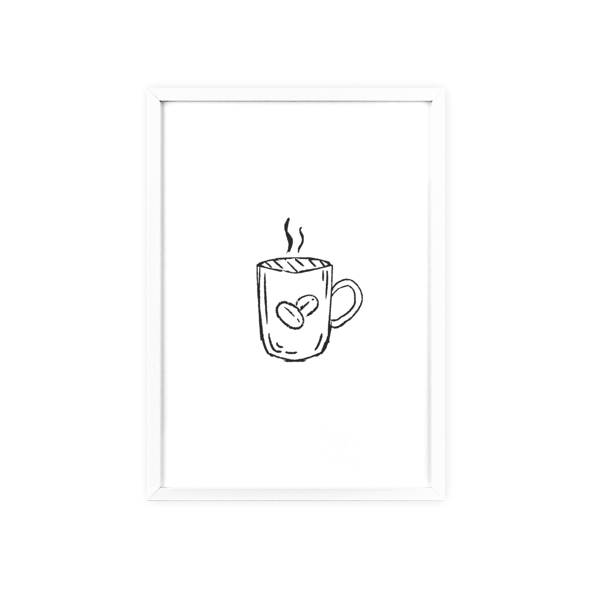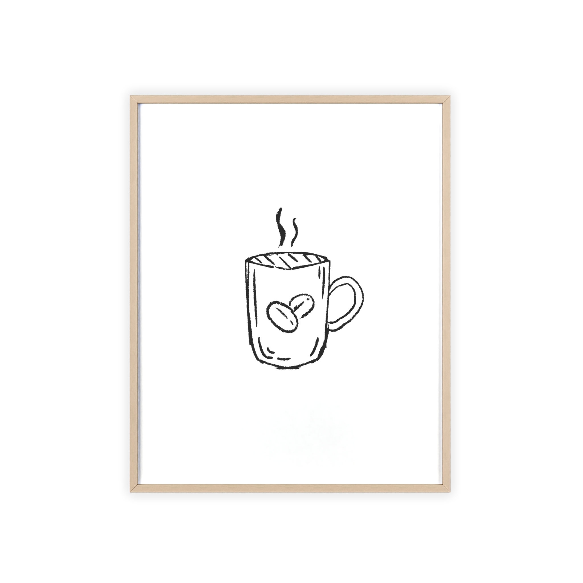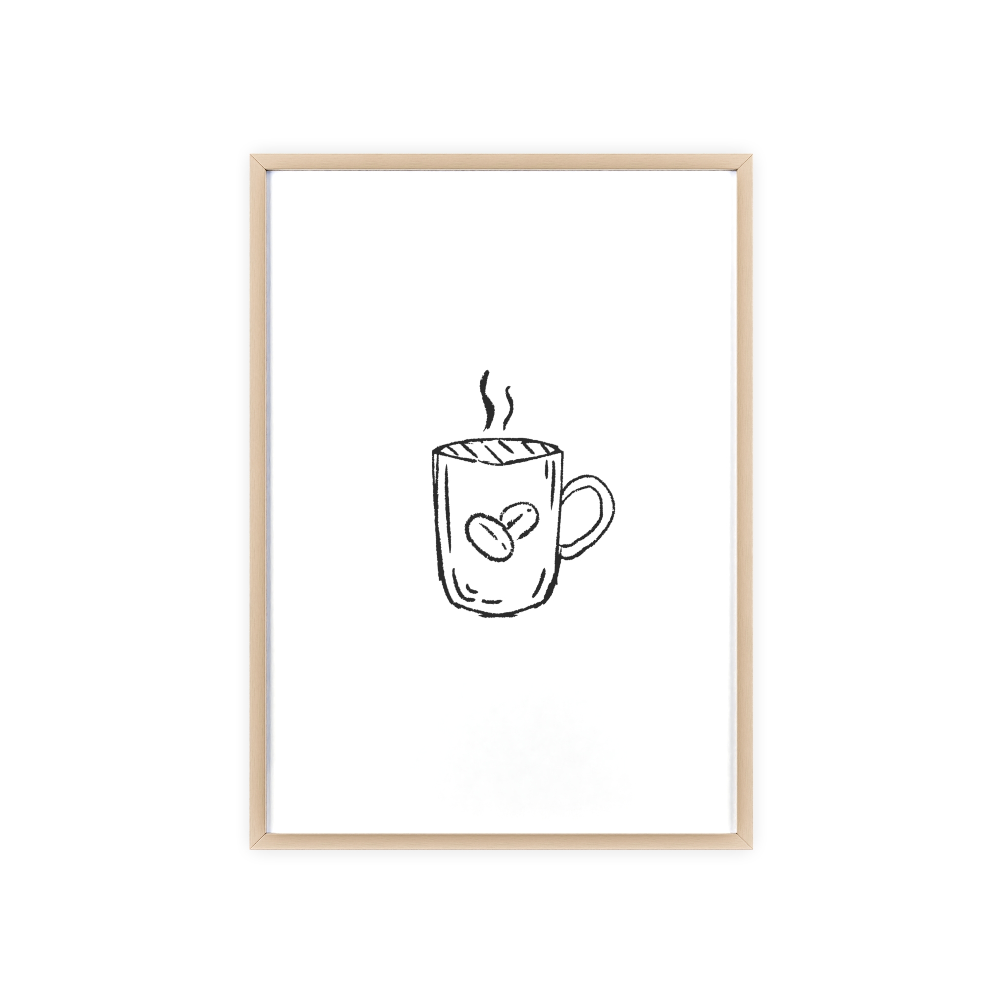 A minimalist framed poster that brings quiet, cozy energy to kitchen nooks and coffee corners. The hand-drawn coffee mug illustration sits on clean white paper, framed in a slim pinewood border available in Natural, Black, or White. The satin or matte photographic paper keeps lines crisp while the protective acrylic glass preserves the soft, sketch-like character. Hung horizontally or vertically, this piece feels like a gentle morning ritual—simple, warm, and thoughtfully finished for immediate display.