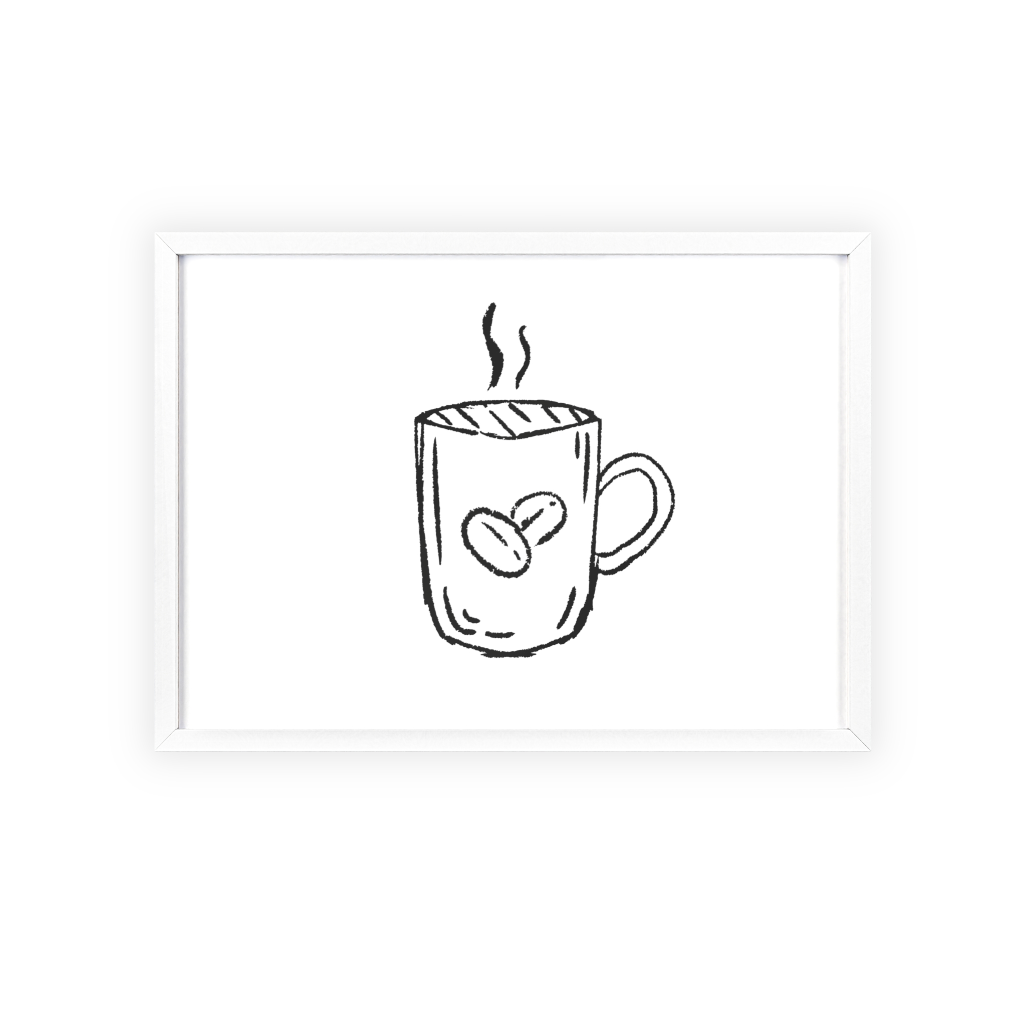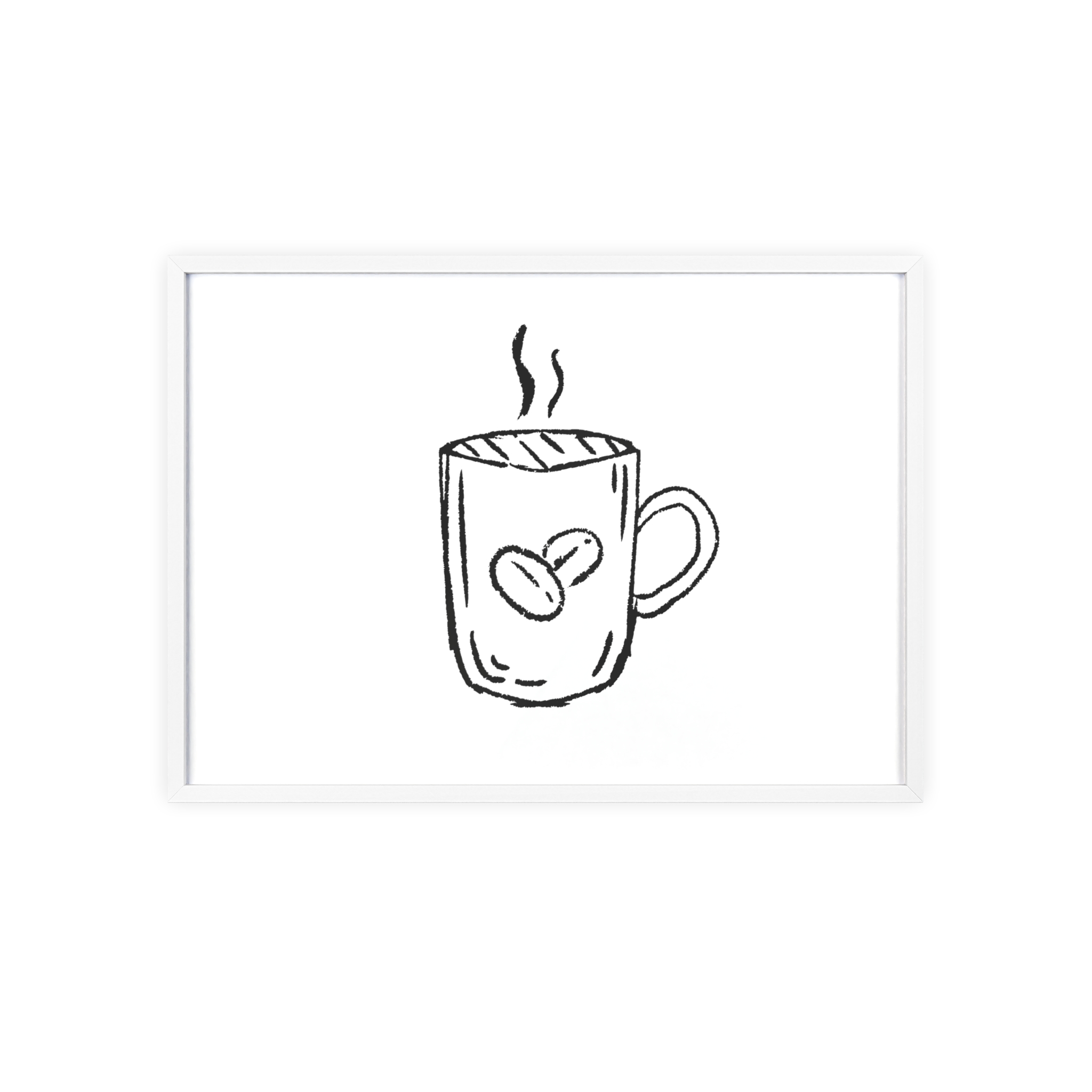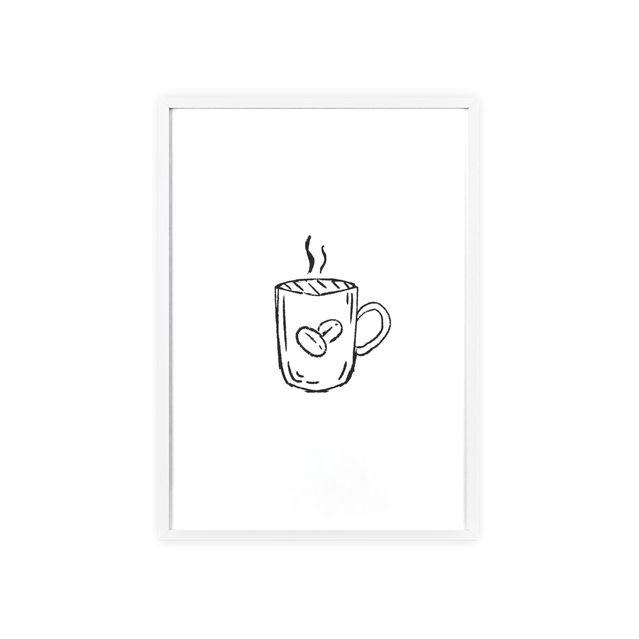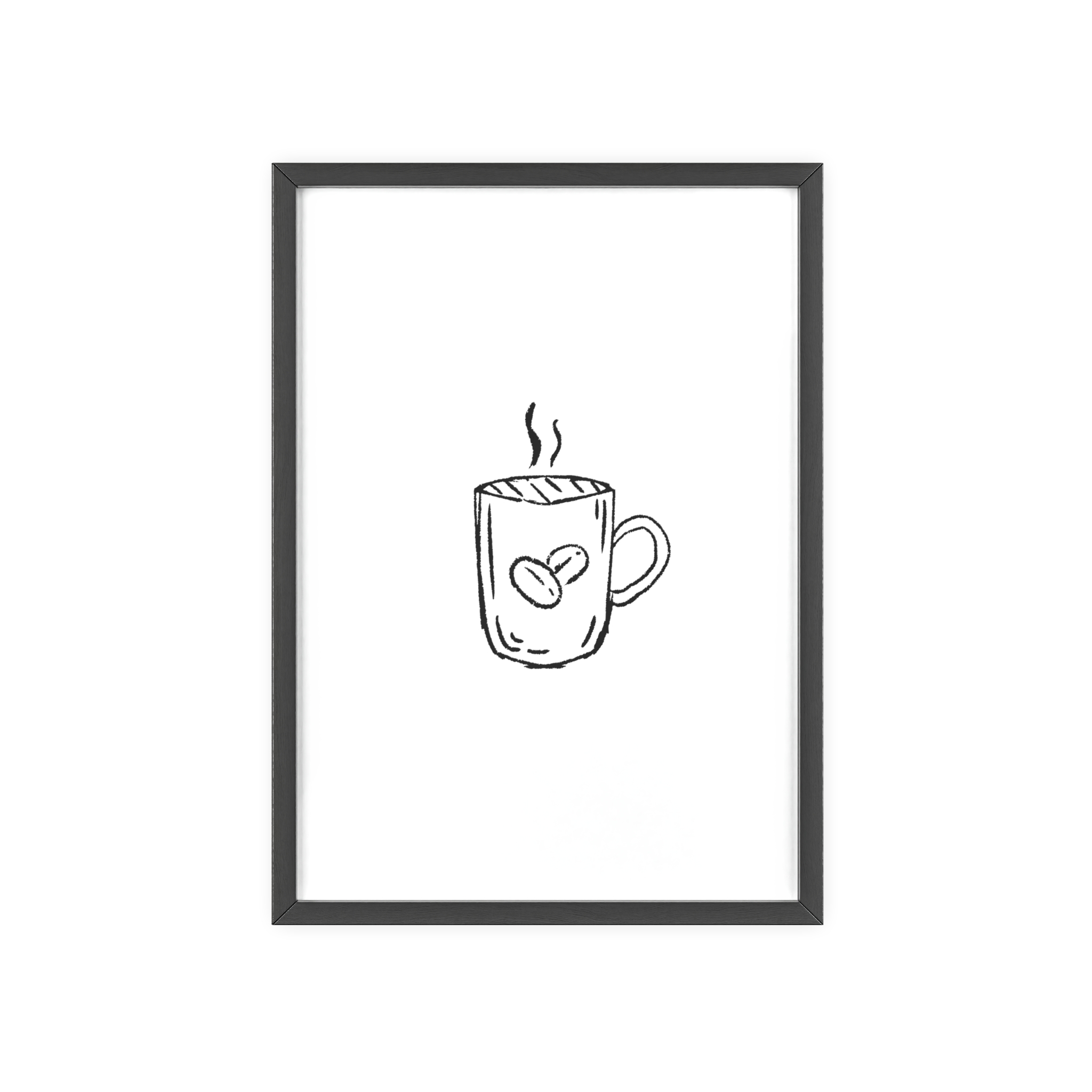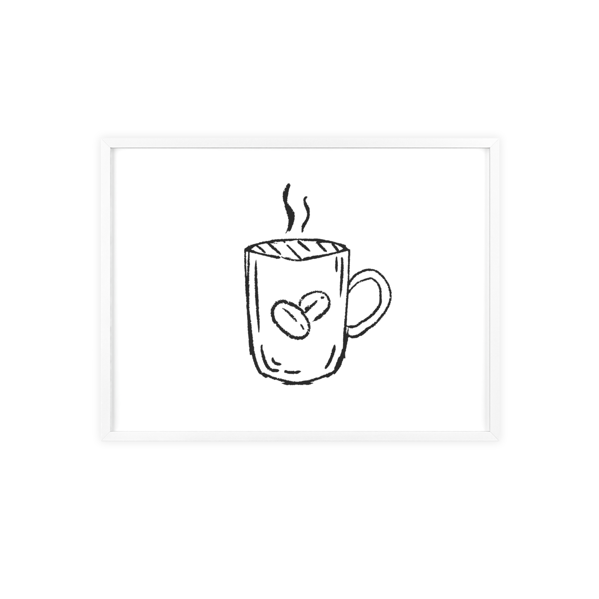 A minimalist framed poster that brings quiet, cozy energy to kitchen nooks and coffee corners. The hand-drawn coffee mug illustration sits on clean white paper, framed in a slim pinewood border available in Natural, Black, or White. The satin or matte photographic paper keeps lines crisp while the protective acrylic glass preserves the soft, sketch-like character. Hung horizontally or vertically, this piece feels like a gentle morning ritual—simple, warm, and thoughtfully finished for immediate display.