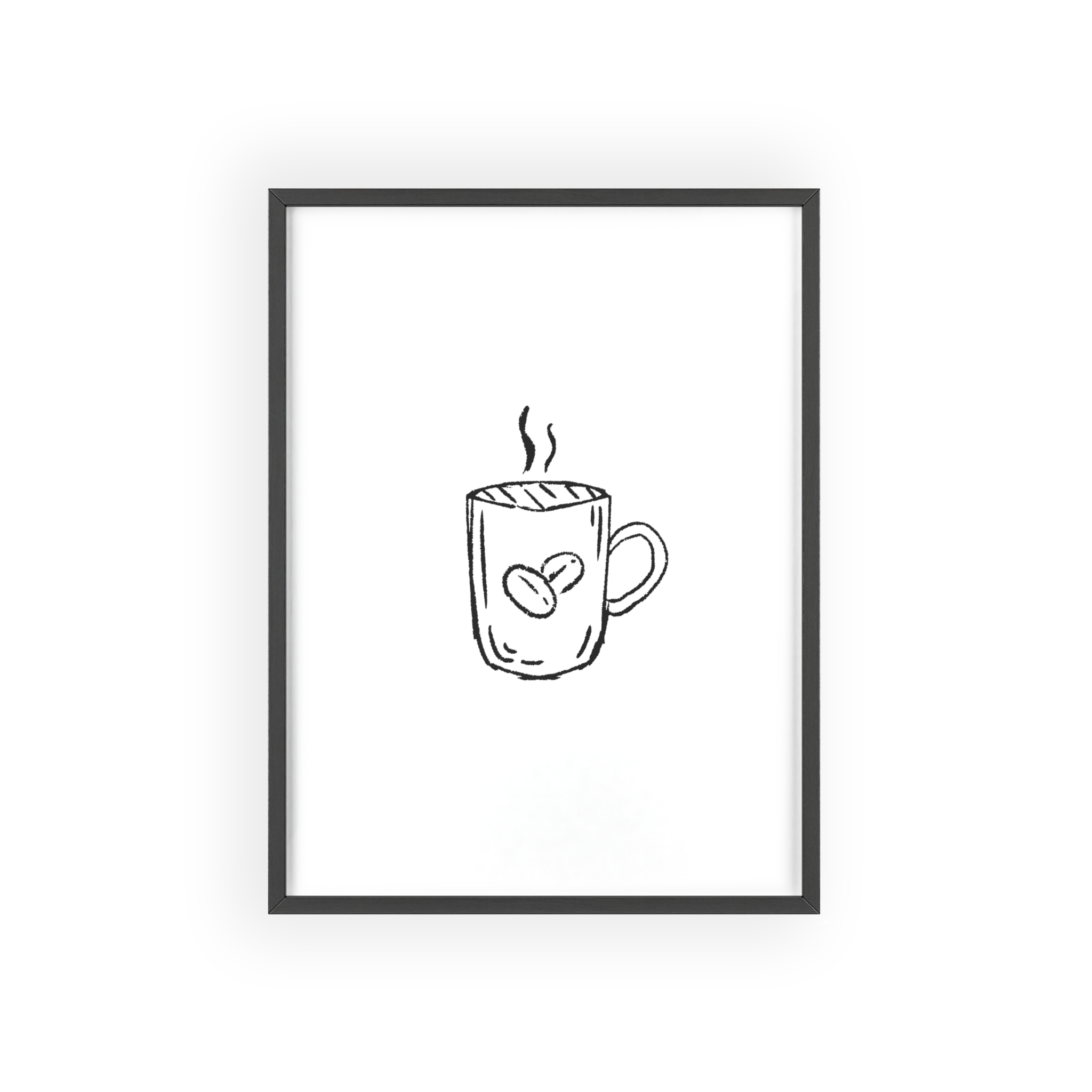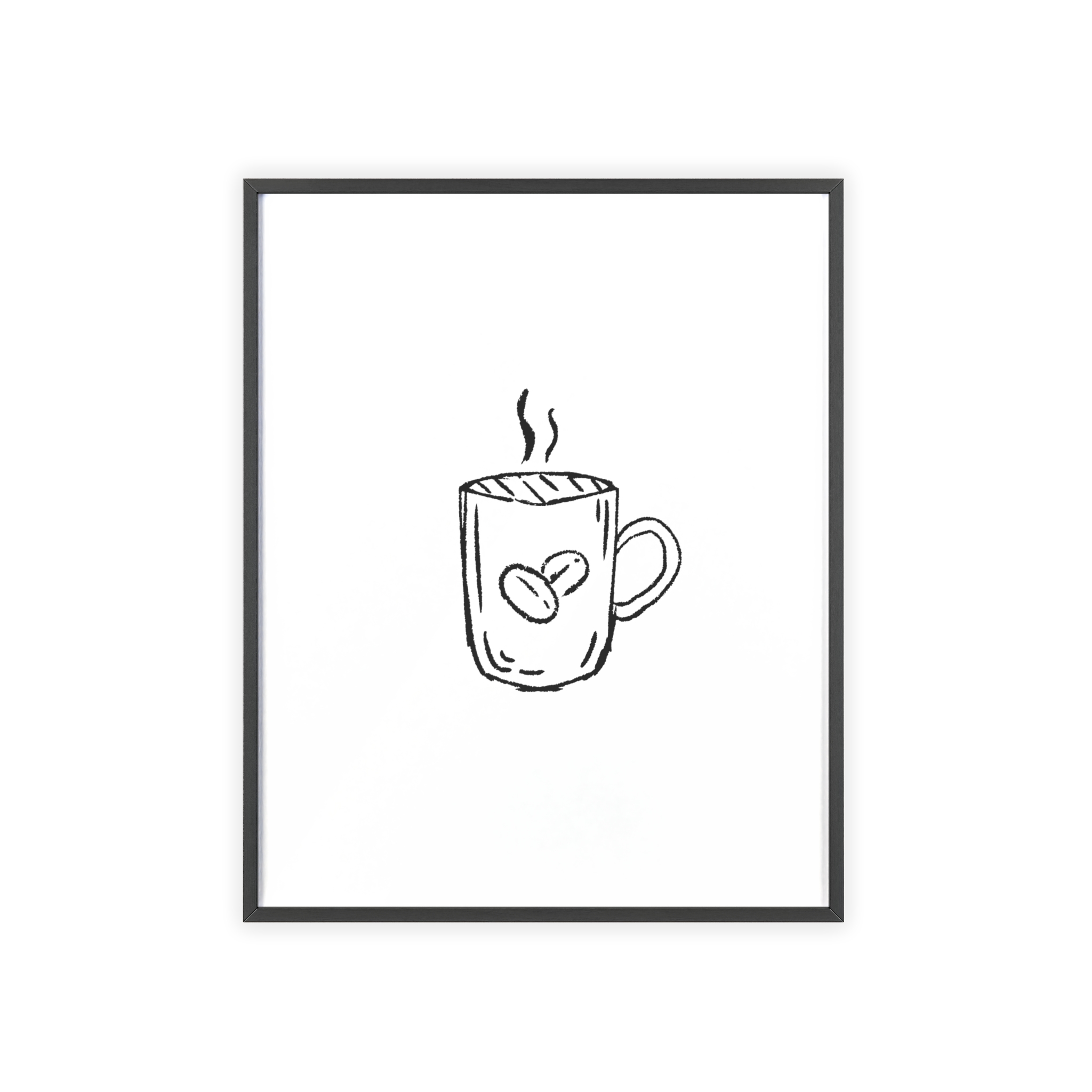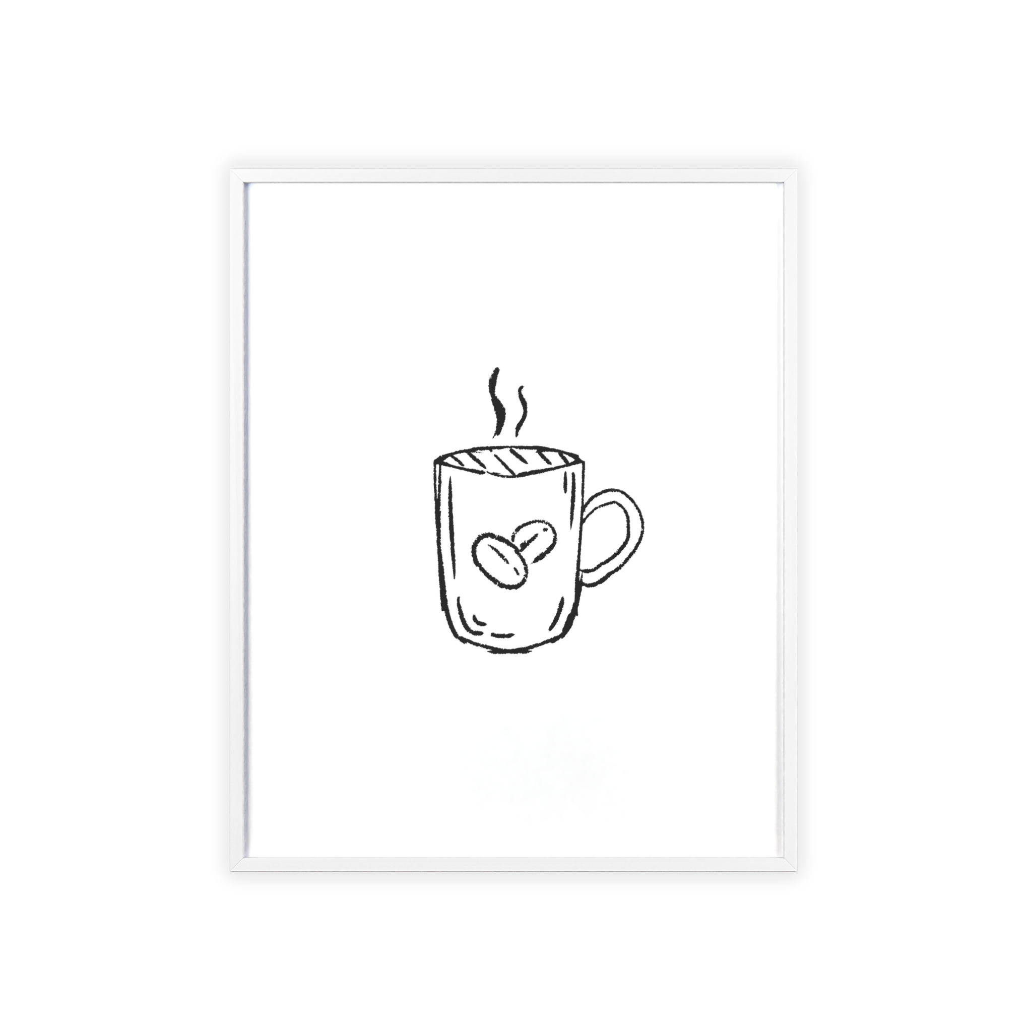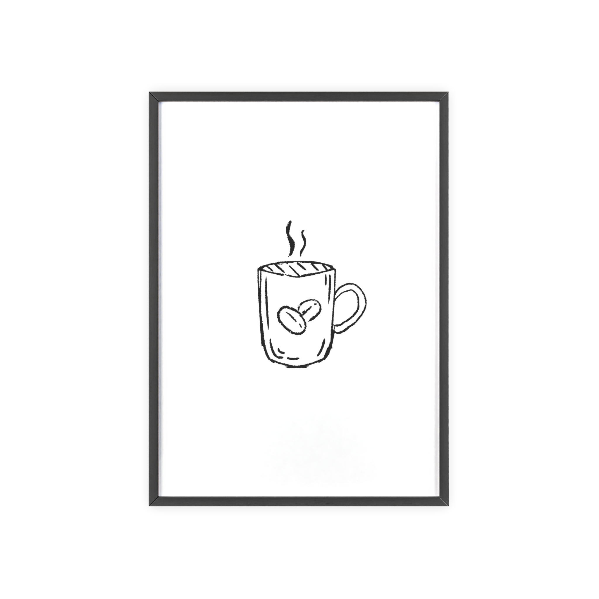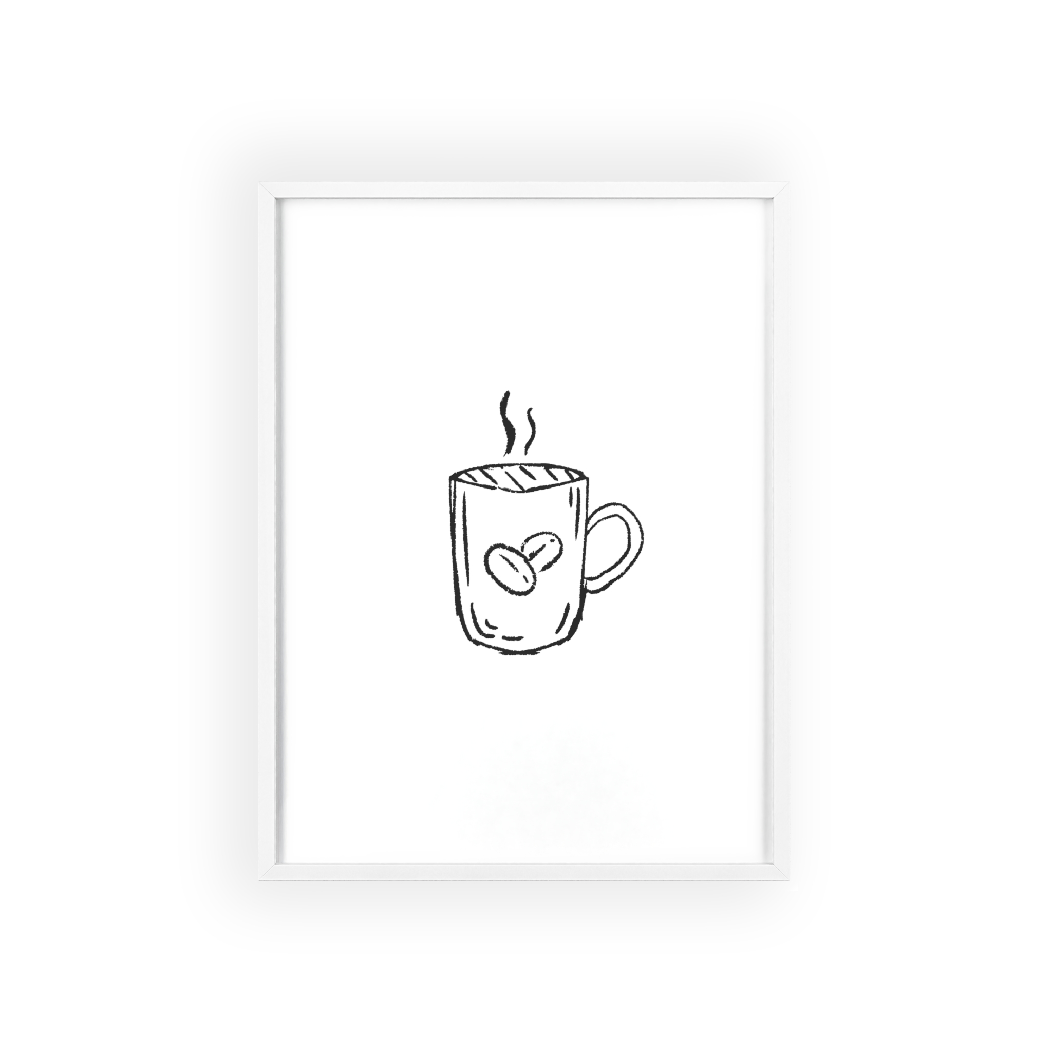 A minimalist framed poster that brings quiet, cozy energy to kitchen nooks and coffee corners. The hand-drawn coffee mug illustration sits on clean white paper, framed in a slim pinewood border available in Natural, Black, or White. The satin or matte photographic paper keeps lines crisp while the protective acrylic glass preserves the soft, sketch-like character. Hung horizontally or vertically, this piece feels like a gentle morning ritual—simple, warm, and thoughtfully finished for immediate display.