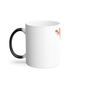 A small, heat-reactive ceramic mug that brings a quiet, playful moment to everyday coffee or tea rituals. At room temperature the design rests softly—subtle lines and muted color hint at the artwork. Pour in a hot drink and the image blooms, revealing warm orange leaves nesting in a soft green vase against a clean white background and a contrasting black handle. Lightweight and glossy, it adds a gentle, handmade feeling to a morning routine or a slow afternoon pause.