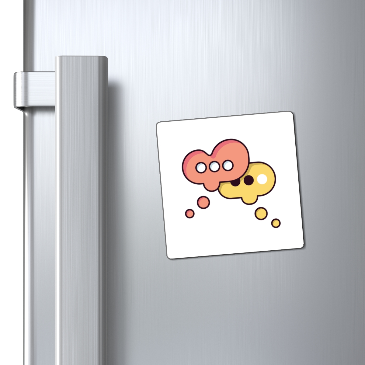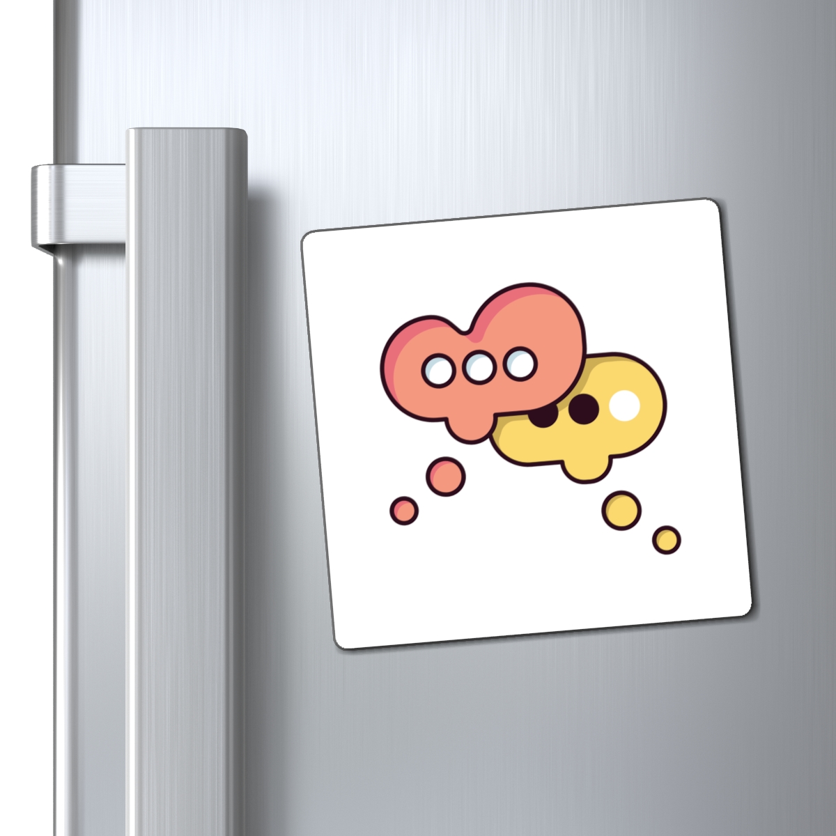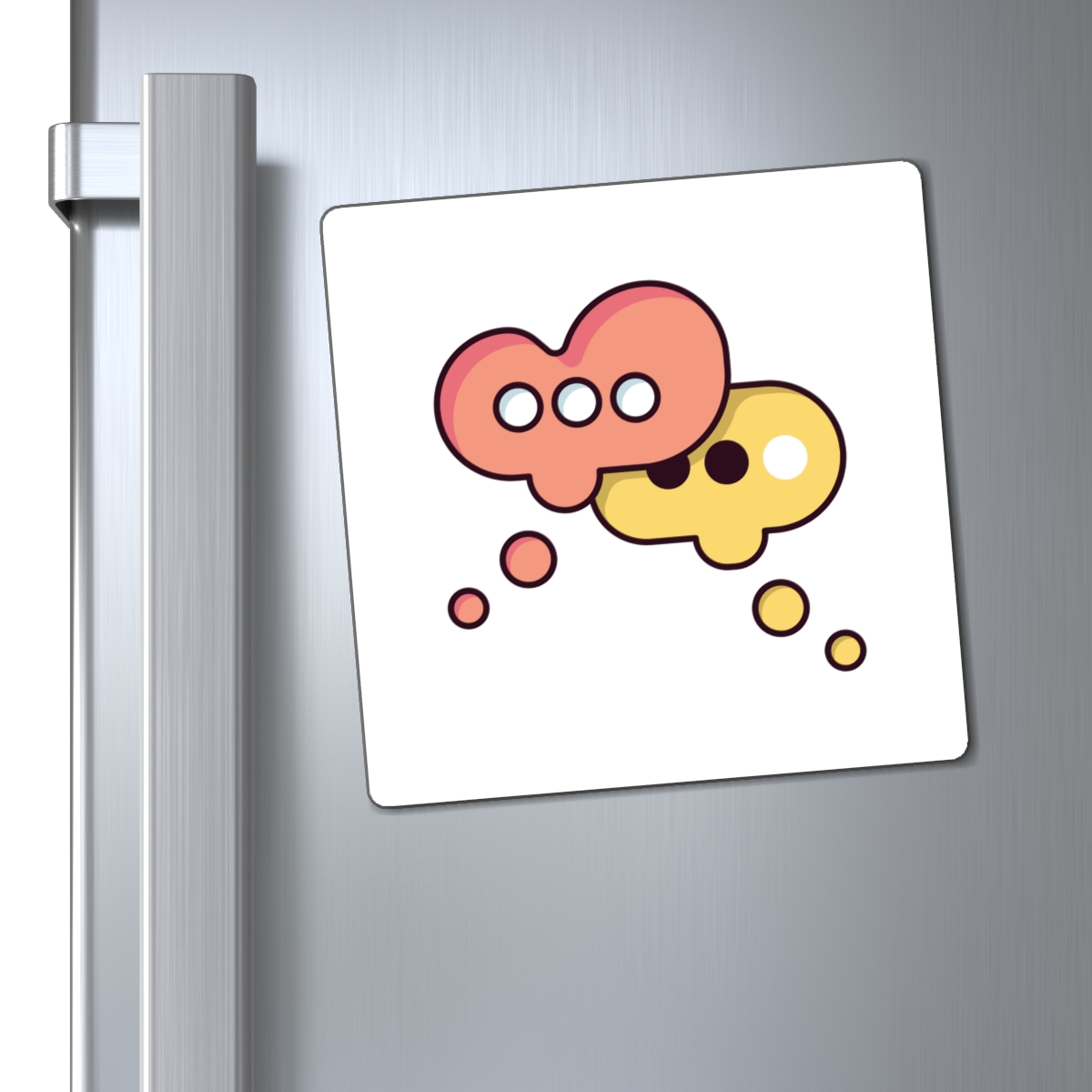 Bright, playful magnets that bring a little conversation to your kitchen, office, or locker. The design features two overlapping speech-bubble shapes in warm coral and sunny yellow, outlined with a soft black stroke for a cheerful, modern look. Lightweight and thin, these vinyl magnets sit close to the surface while their laminated matte finish keeps colors vivid and glare-free. They stick securely to any indoor metal surface — fridge doors, filing cabinets, whiteboards — and add a friendly pop of color to everyday spaces. Use them to hold notes, photos, shopping lists, or simply as a small, joyful accent that starts conversations.