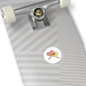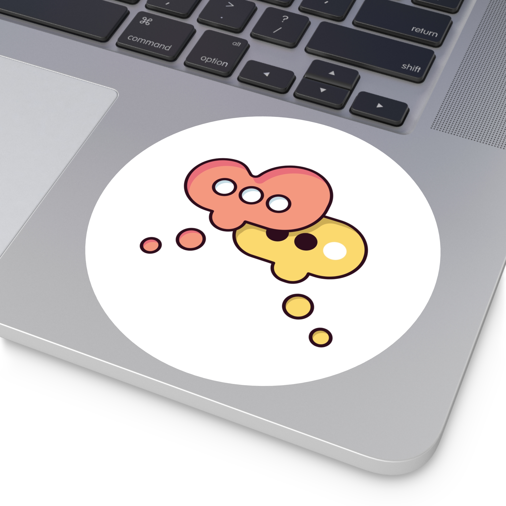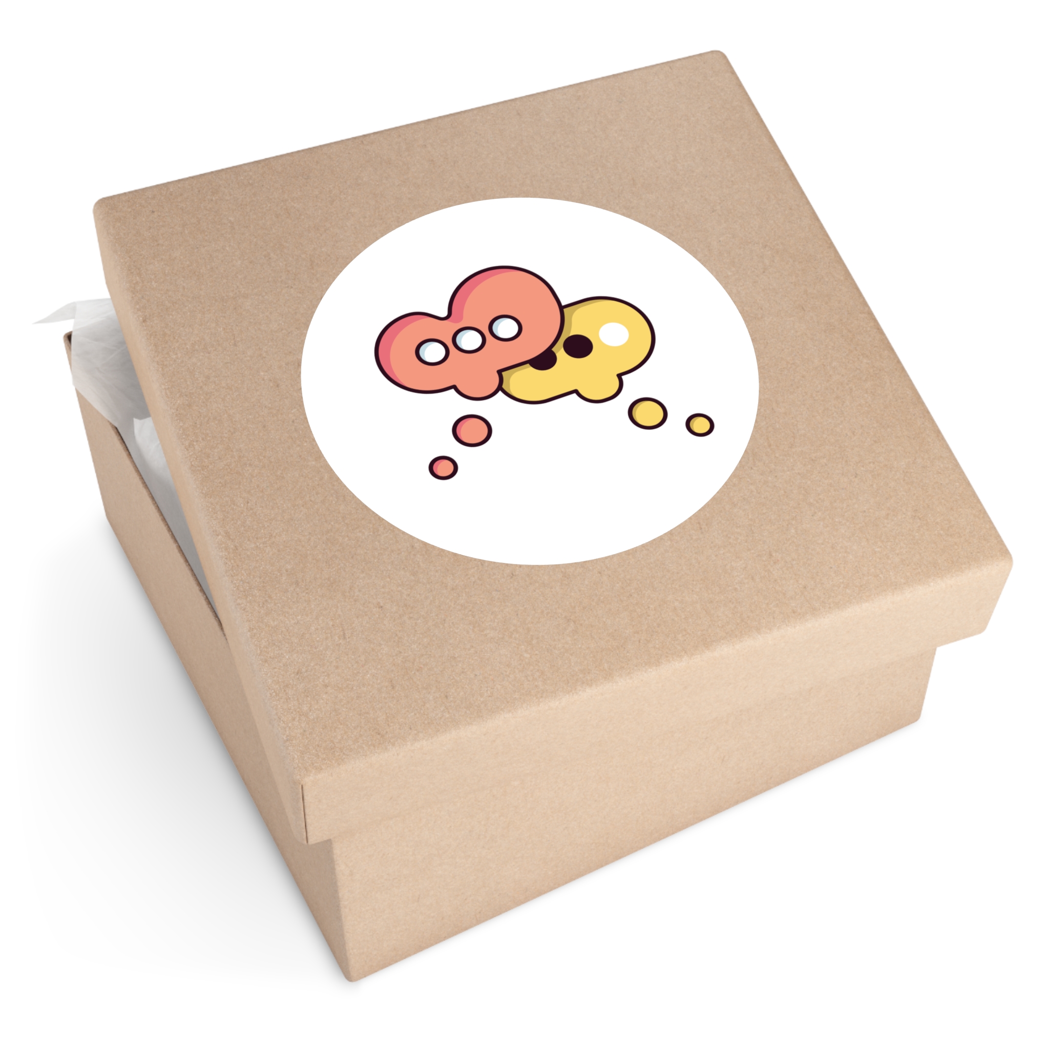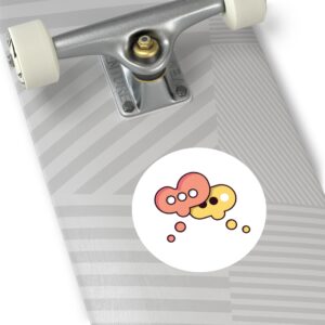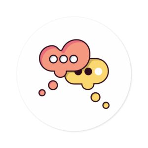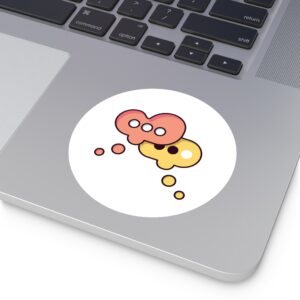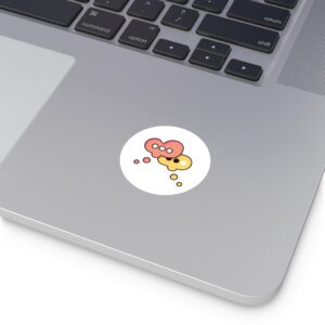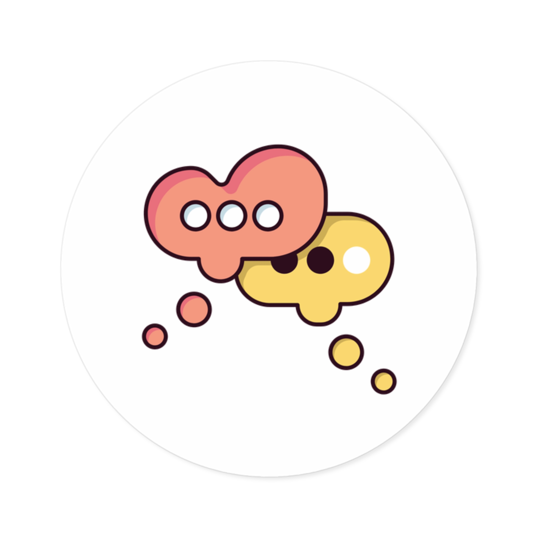 A playful round vinyl sticker that adds a spark of conversation to laptops, water bottles, journals, and more. Warm coral and honey tones form two overlapping speech-bubble shapes, each with simple dot accents that feel both modern and friendly. The smooth white background keeps the artwork crisp and readable, while the protective laminate helps the colors stay vivid through daily wear. Stick it where you want a little personality — a subtle nod to connection and creative chatter.