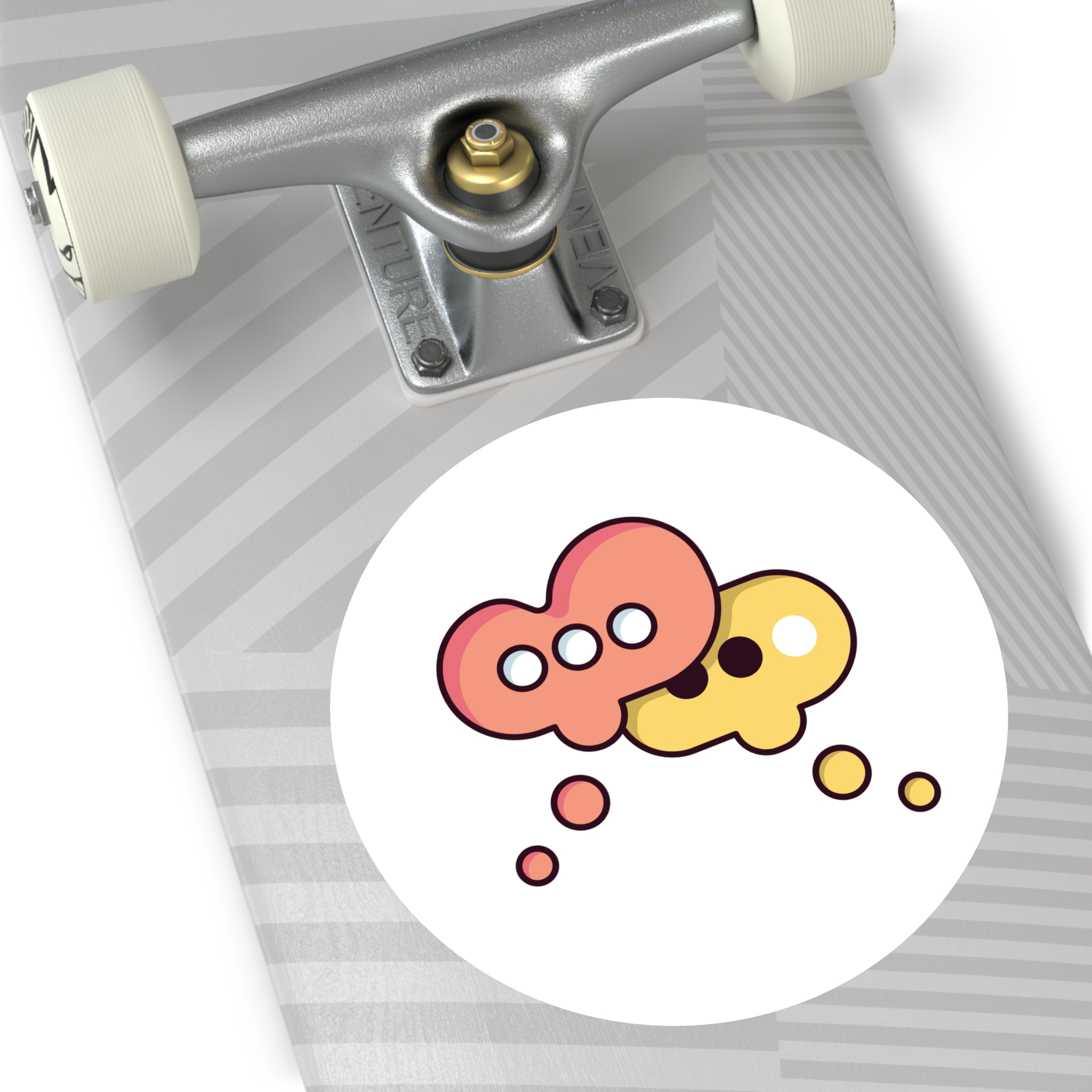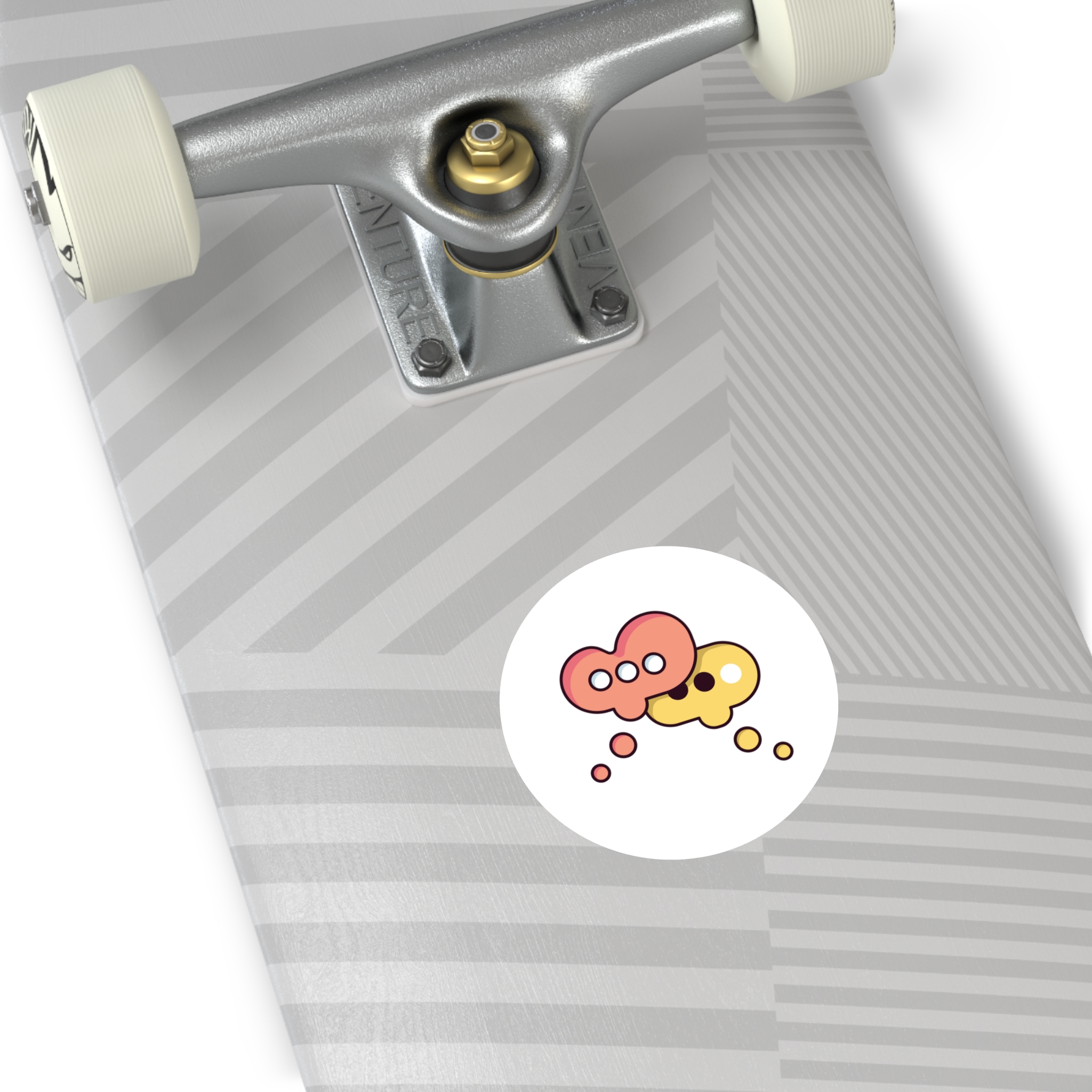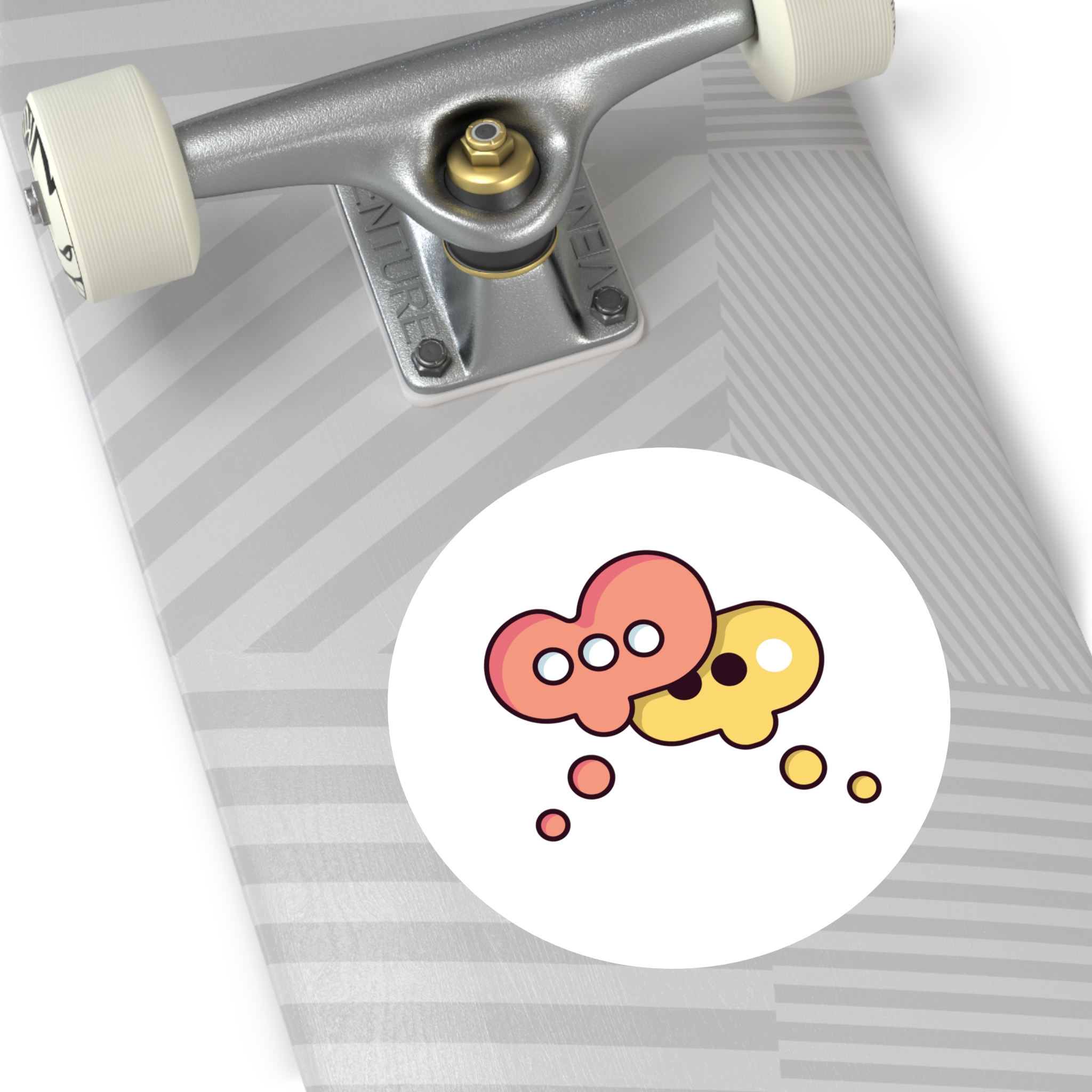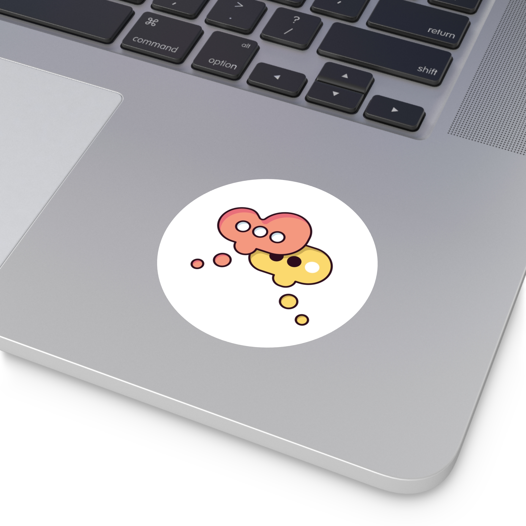 A playful round vinyl sticker that adds a spark of conversation to laptops, water bottles, journals, and more. Warm coral and honey tones form two overlapping speech-bubble shapes, each with simple dot accents that feel both modern and friendly. The smooth white background keeps the artwork crisp and readable, while the protective laminate helps the colors stay vivid through daily wear. Stick it where you want a little personality — a subtle nod to connection and creative chatter.