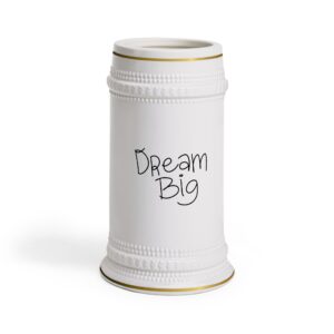 This classic beer stein brings together old-world charm and contemporary durability. The tall 22 oz ceramic mug feels weighty and ritualistic in the hand, with sculpted ridges and a broad handle that makes lifting steady and confident. Thin gold-colored trim at the rim and base adds an elegant accent, while the ORCA-coated surface preserves a bright, long-lasting print. It’s dishwasher-safe for easy cleanup (not for microwave use), and built to be an everyday companion for slow-sipped lagers, celebratory toasts, or quiet evenings at the table.