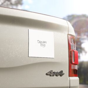 A compact, weather-ready car magnet that carries a simple, uplifting message — “Dream Big” in hand-lettered script on a clean white matte background. The lightweight vinyl face resists rain and sun, while the strong black magnetic backing keeps it snug on doors or trunks without damaging paint. Its minimal aesthetic blends with city sedans or weekend vans, giving a quiet reminder to keep reaching while you run errands, commute, or head out on a road trip.