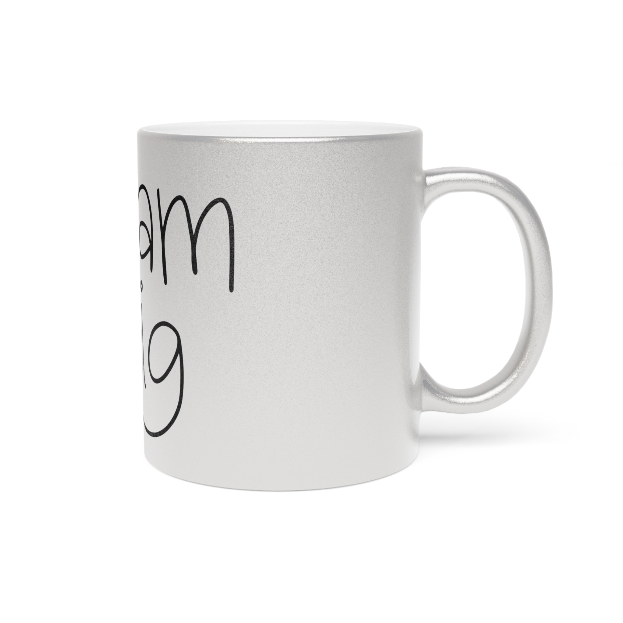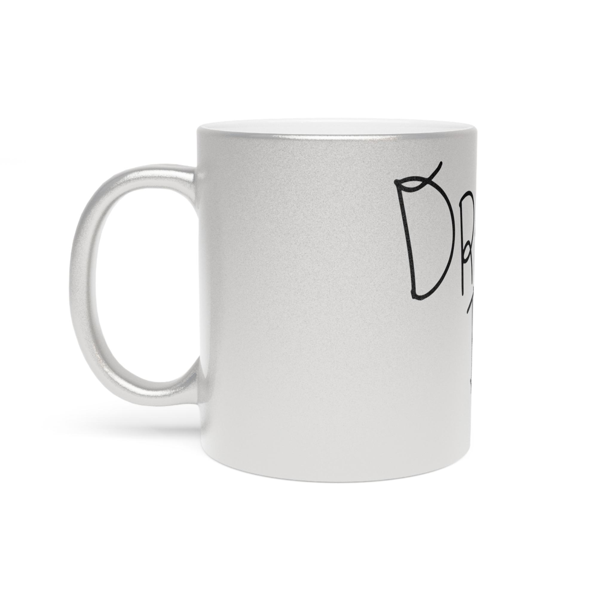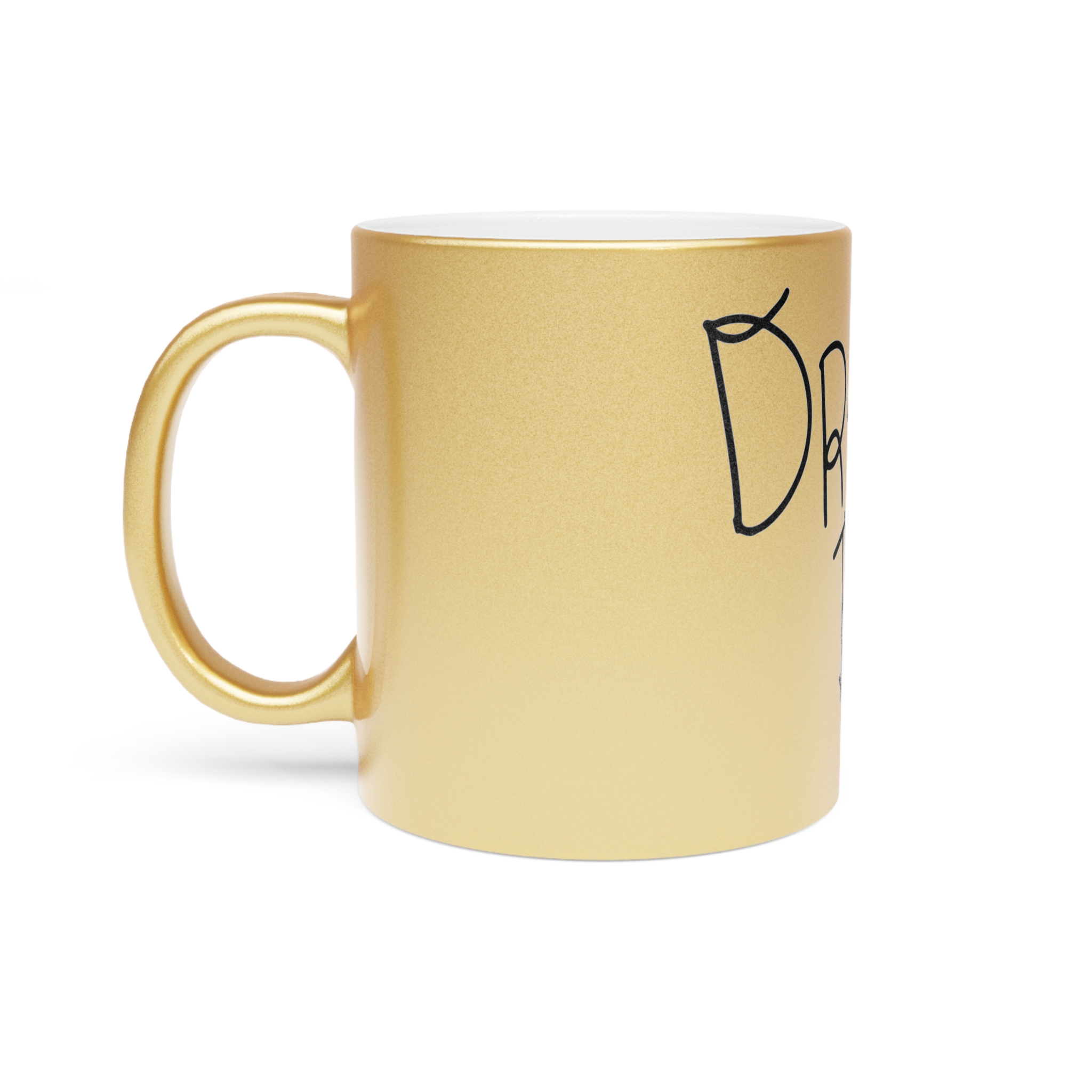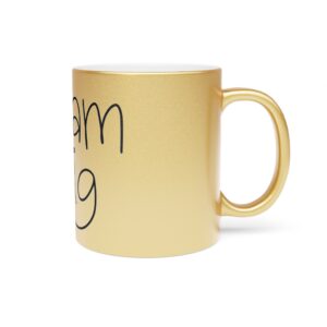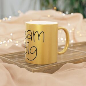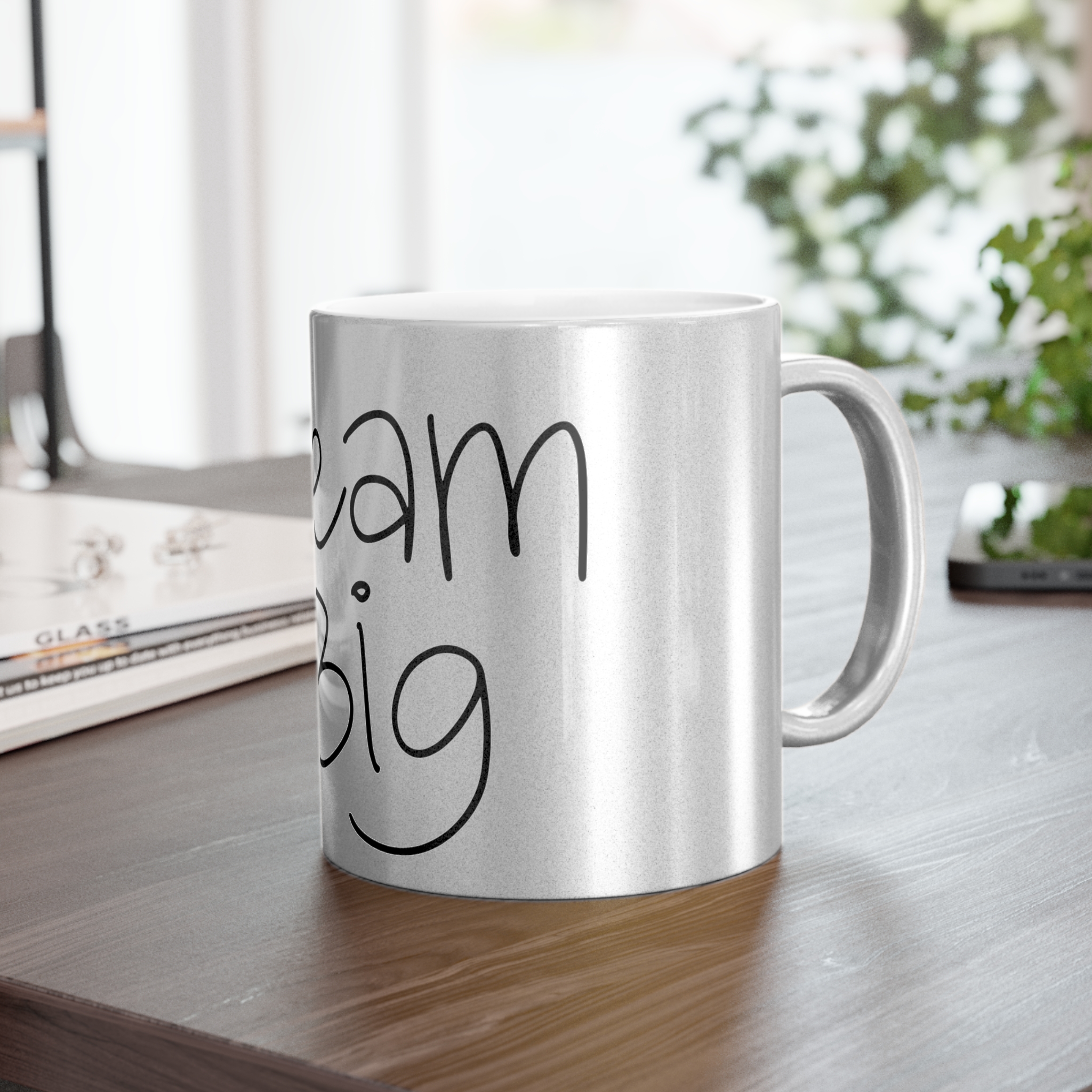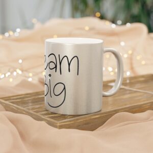 A shimmering 11oz metallic mug that brings a quiet, uplifting moment to daily routines. The ceramic base wears a silver or gold metallic finish that catches light and softens handwritten designs — here, a handwritten “Dream Big” wraps gently around the cup. Hold it in the C-handle as morning steam rises and the metallic surface reflects the room in a subtle, warm glow. This is for people who cherish small rituals: early risers sketching plans, late-night writers chasing ideas, or anyone who likes a little reflective sparkle with their coffee or tea. Because of the metallic coating, lighter ink colors will appear more translucent, so darker artwork keeps your message bold and readable. Hand wash only to preserve the finish; the mug is free of BPA, lead, and cadmium.