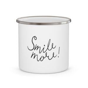 A cheerful enamel camping mug that brings a pocket of joy to mornings on the trail or quiet moments at home. Its classic white enamel surface is stamped with a breezy handwritten message that feels like a friend nudging you to breathe and smile. Lightweight and sturdy, this 12 oz mug stacks into backpacks and slips into cabin cupboards with ease. The rounded rim and polished stainless-steel lip add a touch of vintage camp style while keeping drinks secure. Use it for coffee before dawn hikes, cocoa by the fire, or as a small keepsake on a windowsill that raises your spirits every time you pass by.