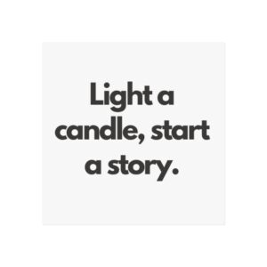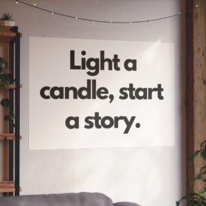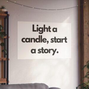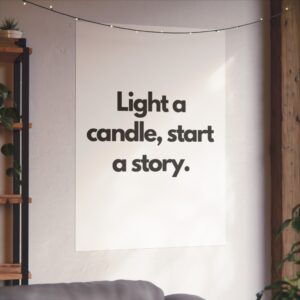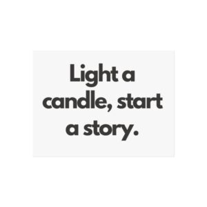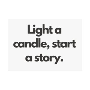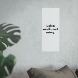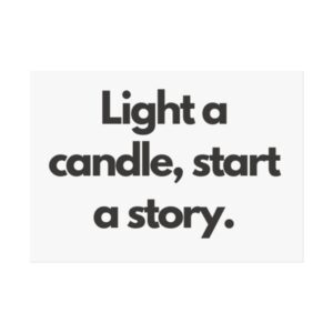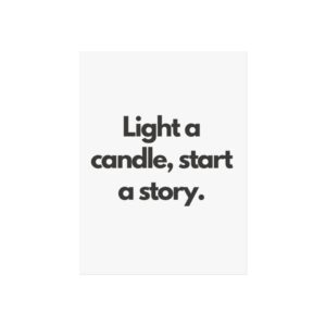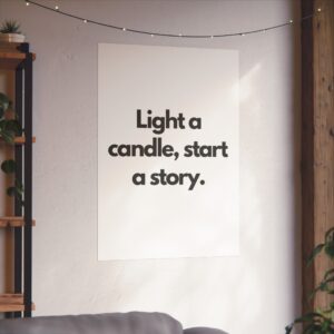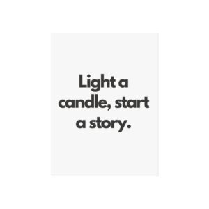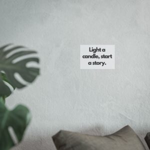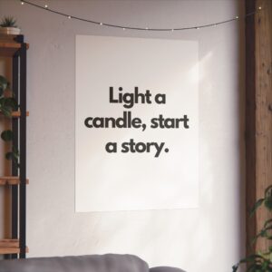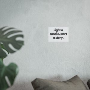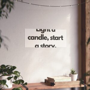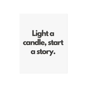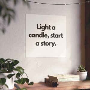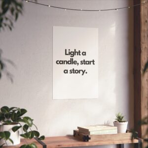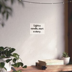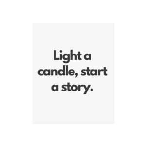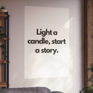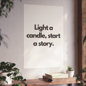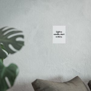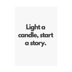A minimalist fine art poster with a quiet, literary voice: the simple black type reads “Light a candle, start a story.” Printed on gallery-grade 220gsm smooth, acid-free paper with giclée quality and a smooth matte finish, this vertical poster brings calm and intention to reading nooks, bedside walls, and cozy corners. The understated design draws the eye to the words — a tiny ritual captured in clean typography that invites lingering moments of reflection, reading, or evening rest. It pairs naturally with soft lighting, a stack of worn books, and textured walls to create a slow, thoughtful atmosphere for readers, writers, and anyone who treasures ritualized moments like candlelight and storytelling.
