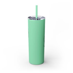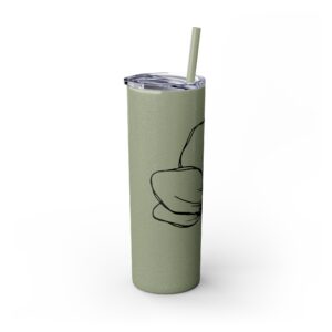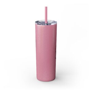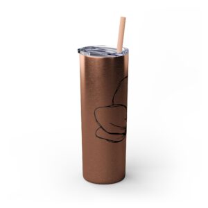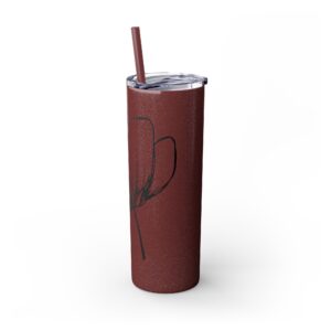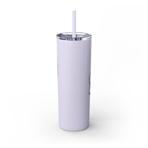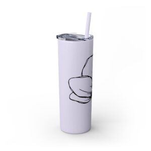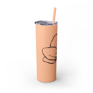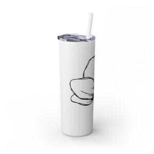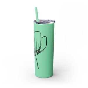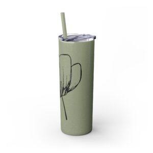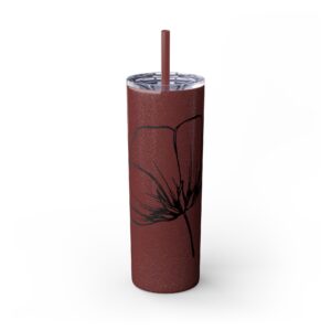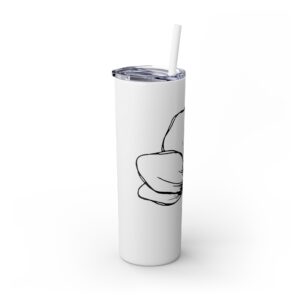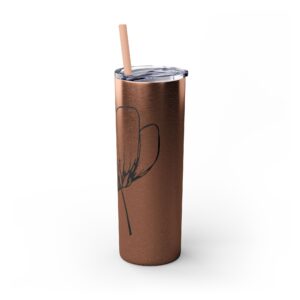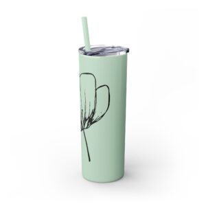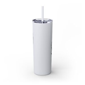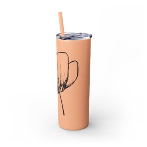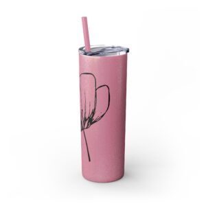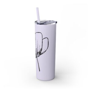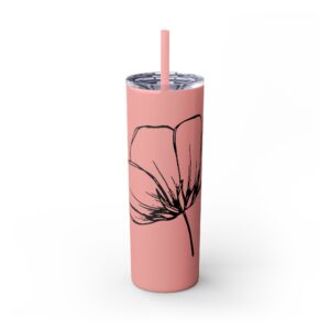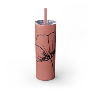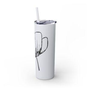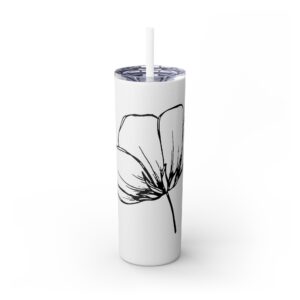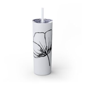 A slim, stainless steel 20oz skinny tumbler wrapped in a delicate black-and-white floral sketch. Its tapered silhouette slips into cup holders and backpacks, while the double-wall insulation keeps iced drinks chilled through long commutes or steamy lattes warm during crisp mornings. The clear press-on lid with matching straw makes sipping effortless on the go. The minimalist, hand-drawn blossom feels gentle and modern — it’s the kind of tumbler that quiets a busy day and pairs easily with a lined journal, a patchwork scarf, or a slow afternoon on a café patio.