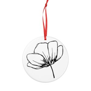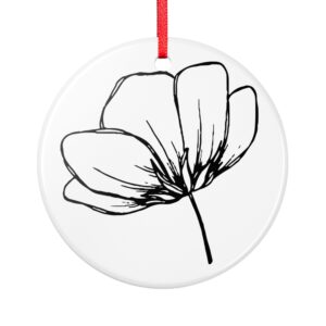 A simple, elegant ceramic ornament that brings a quiet, hand-drawn moment to your space. The delicate black ink flower floats on a clean white disk, printed on both sides so the sketch reads from every angle. The bright red hanging ribbon adds a soft, nostalgic pop of color against the minimal design. Hang it from a branch, a rearview mirror, or tucked into a seasonal display to introduce a calm, botanical accent that feels personal and thoughtfully placed.