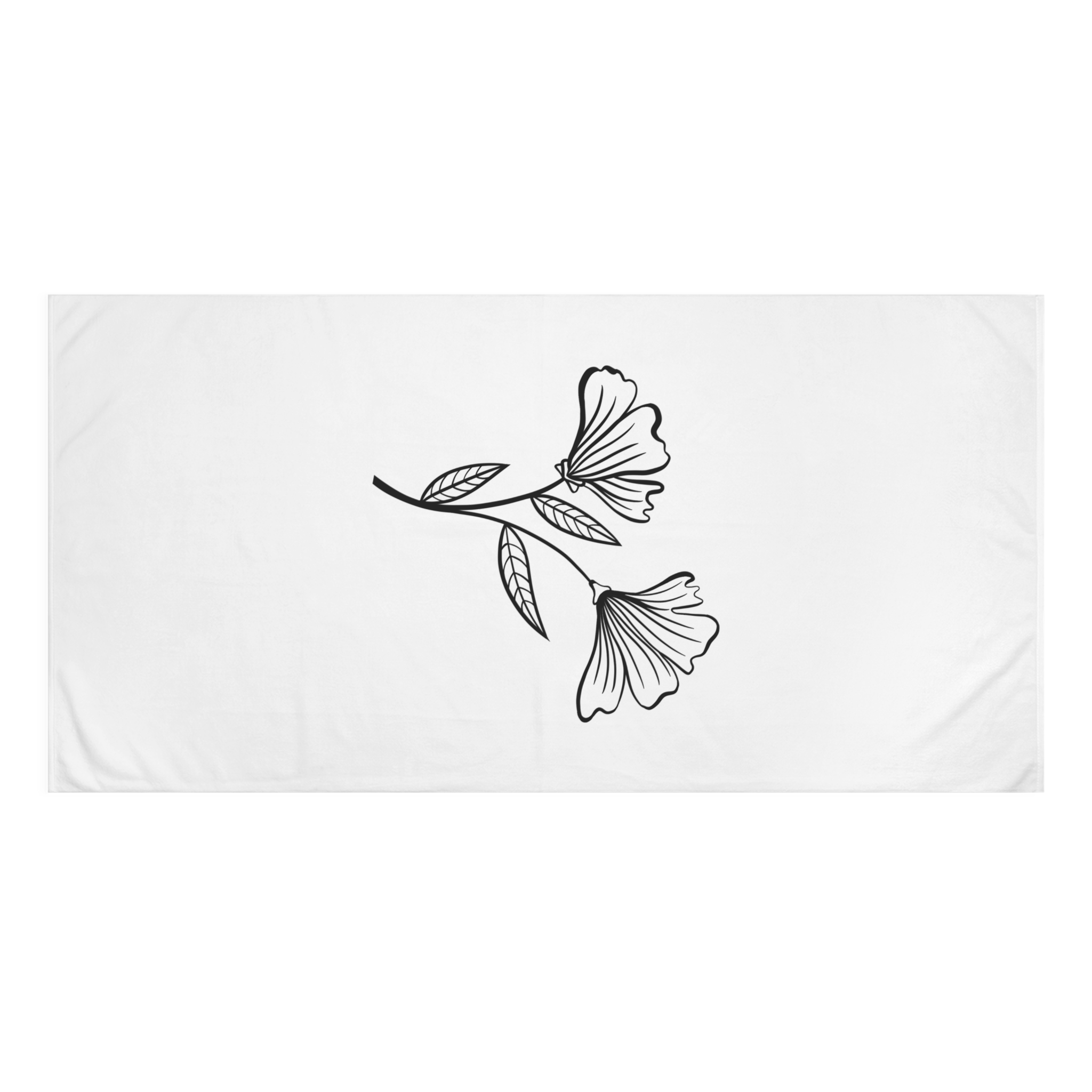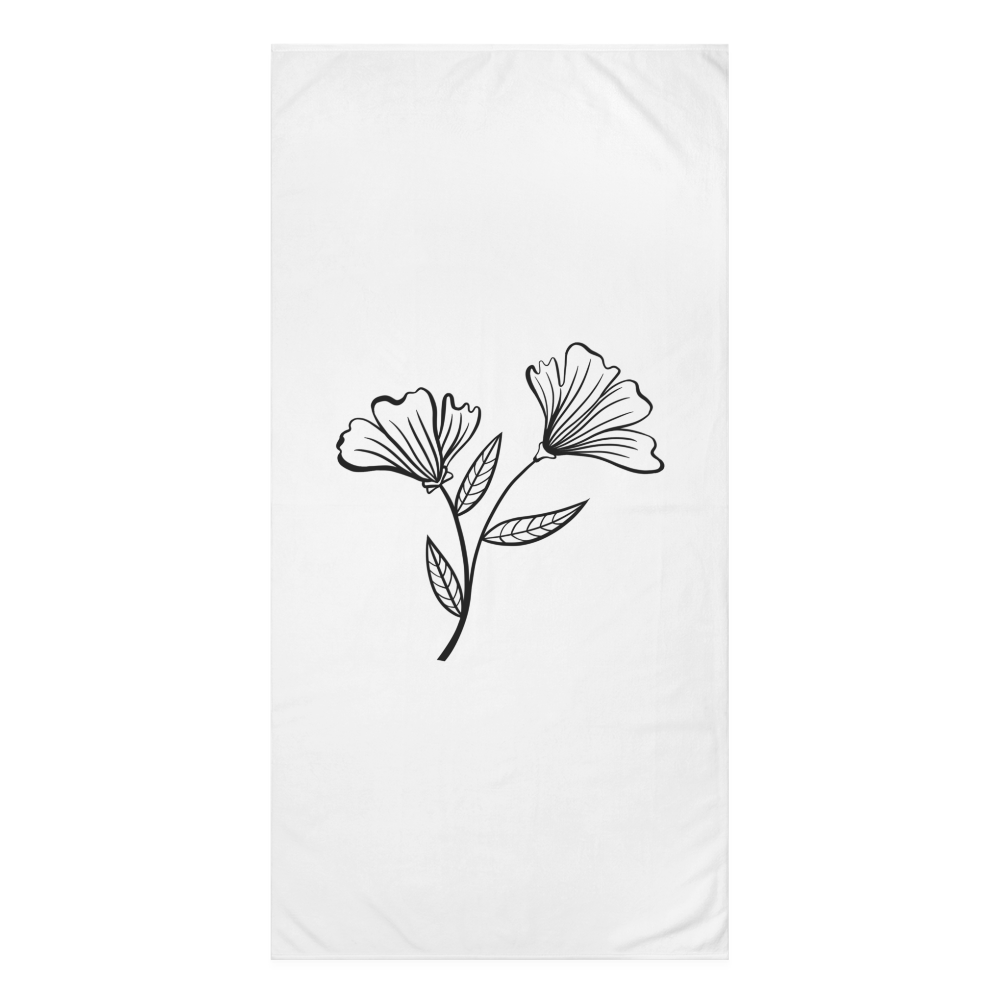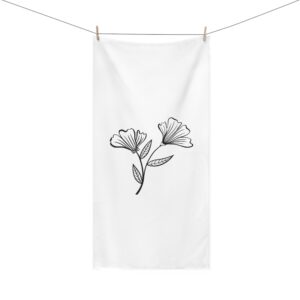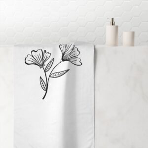 A soft, elegant towel that feels like a quiet breath of morning. The printed side shows a delicate, hand-drawn floral motif in crisp black lines on a clean white field — simple, modern, and calming. The reverse side is plush cotton that quickly soaks up water after a swim, a shower, or a day at the lake. At 30″ × 60″ it wraps easily around shoulders or folds neatly into a beach bag. This towel moves from campsite to bathroom with ease, bringing a subtle, botanical accent to everyday routines and slow adventures.