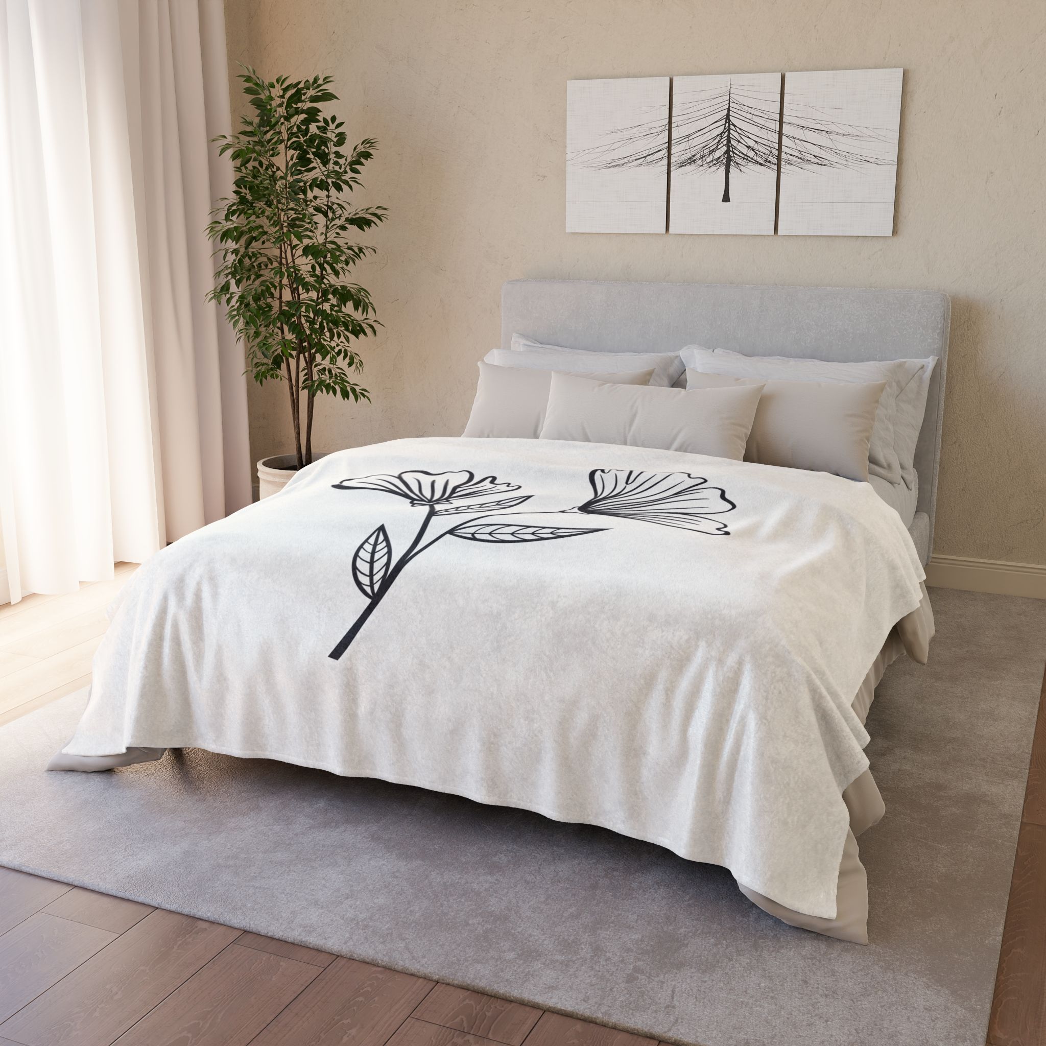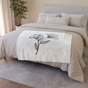 Soft, cozy fleece with a simple botanical line drawing that calms and centers. Lightweight warmth and a gentle drape make this blanket an easy layer for slow mornings, reading nooks, or evening tea on the couch. The monochrome floral sketch sits quietly against the creamy background, bringing an airy, minimalist touch to small apartments, studio bedrooms, or a home office. Reach for it when you want something soft against your skin and visually restful in the room — the kind of piece that quietly rounds out a lived-in space and makes everyday comfort feel intentional.