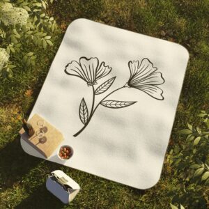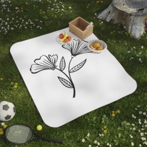 A lightweight, cozy picnic blanket printed with a delicate black floral sketch on a crisp white field. The fleece top feels soft under bare skin while vibrant printing keeps the linework sharp and true. Turn it over and a black, water-resistant oxford backing shields grass and damp ground. Sewn edges and a black carrying strap with buckles make it simple to roll, secure, and carry to the park, beach, or backyard. At 61″ × 51″ it fits two people lounging, a small picnic spread, or a quiet reading spot outdoors.