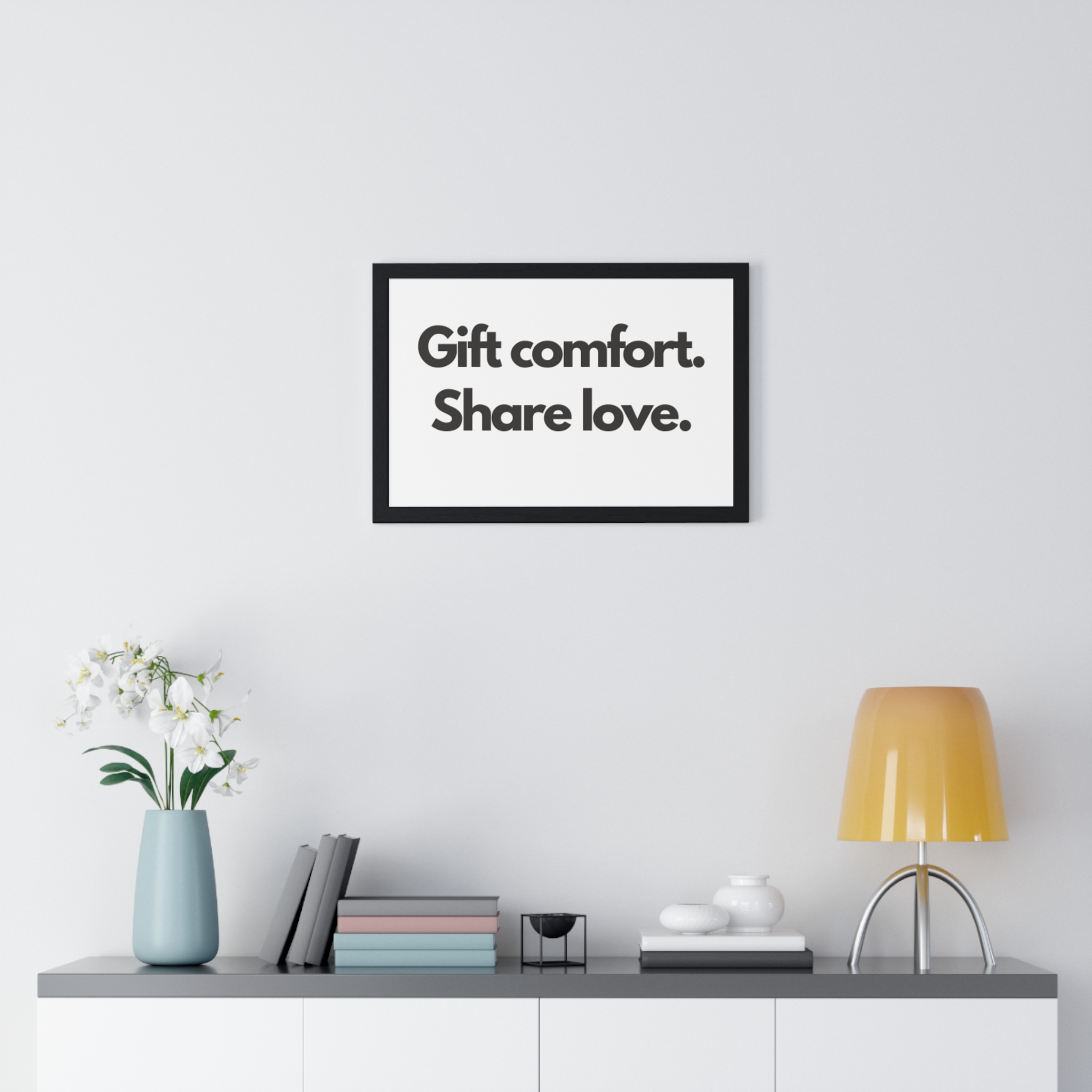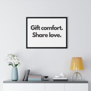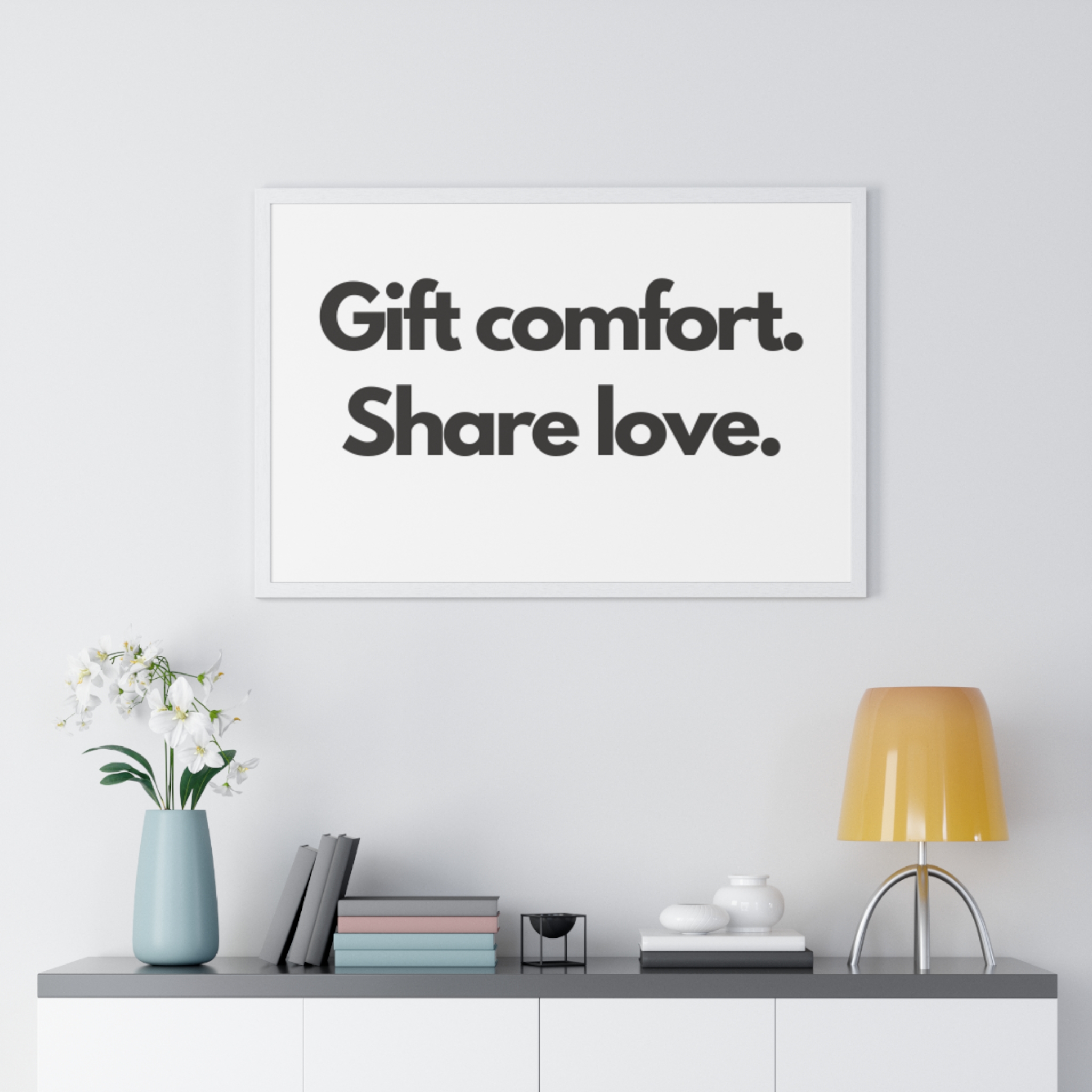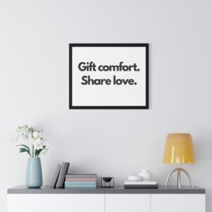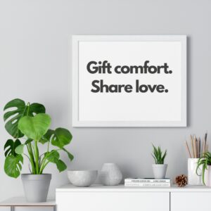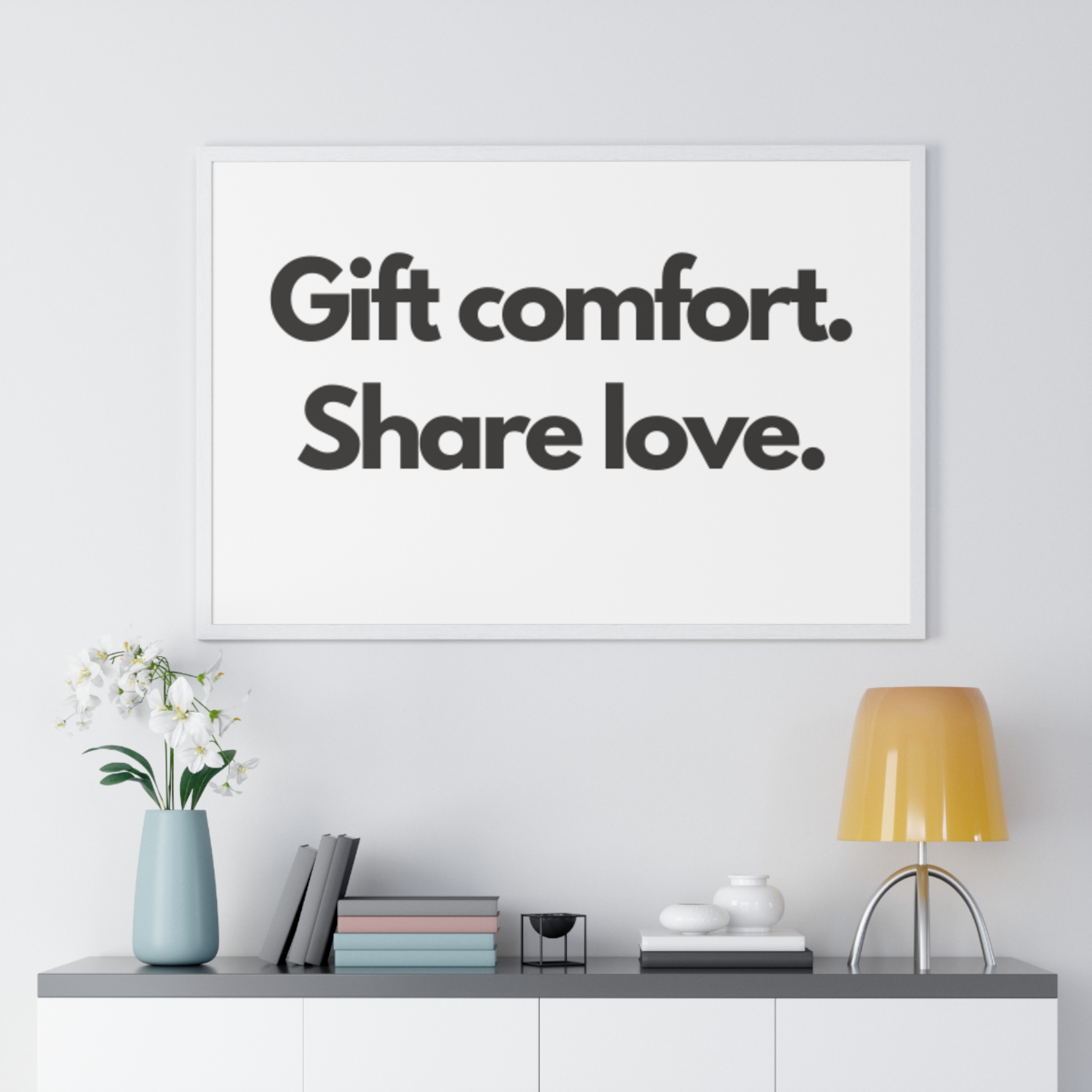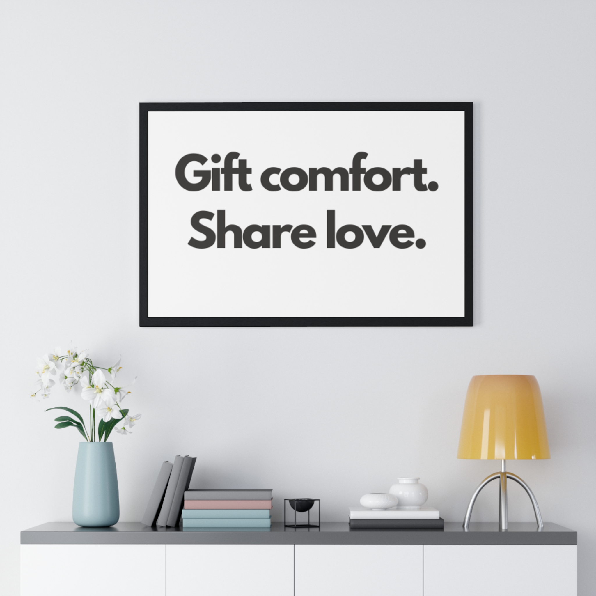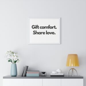 A clean, modern horizontal framed poster that speaks in quiet confidence. Bold, sans-serif text—”Gift comfort. Share love.”—rests on matte museum-grade paper, printed with vivid pigment inks that hold rich blacks and crisp edges. The slim wooden frame (choose black or white) and plexiglass front create a gallery-ready piece that hangs easily with pre-installed hardware. It brings a calm, thoughtful presence to living rooms, entryways, nurseries, or cozy reading nooks, and scales across multiple sizes to suit your wall and mood.