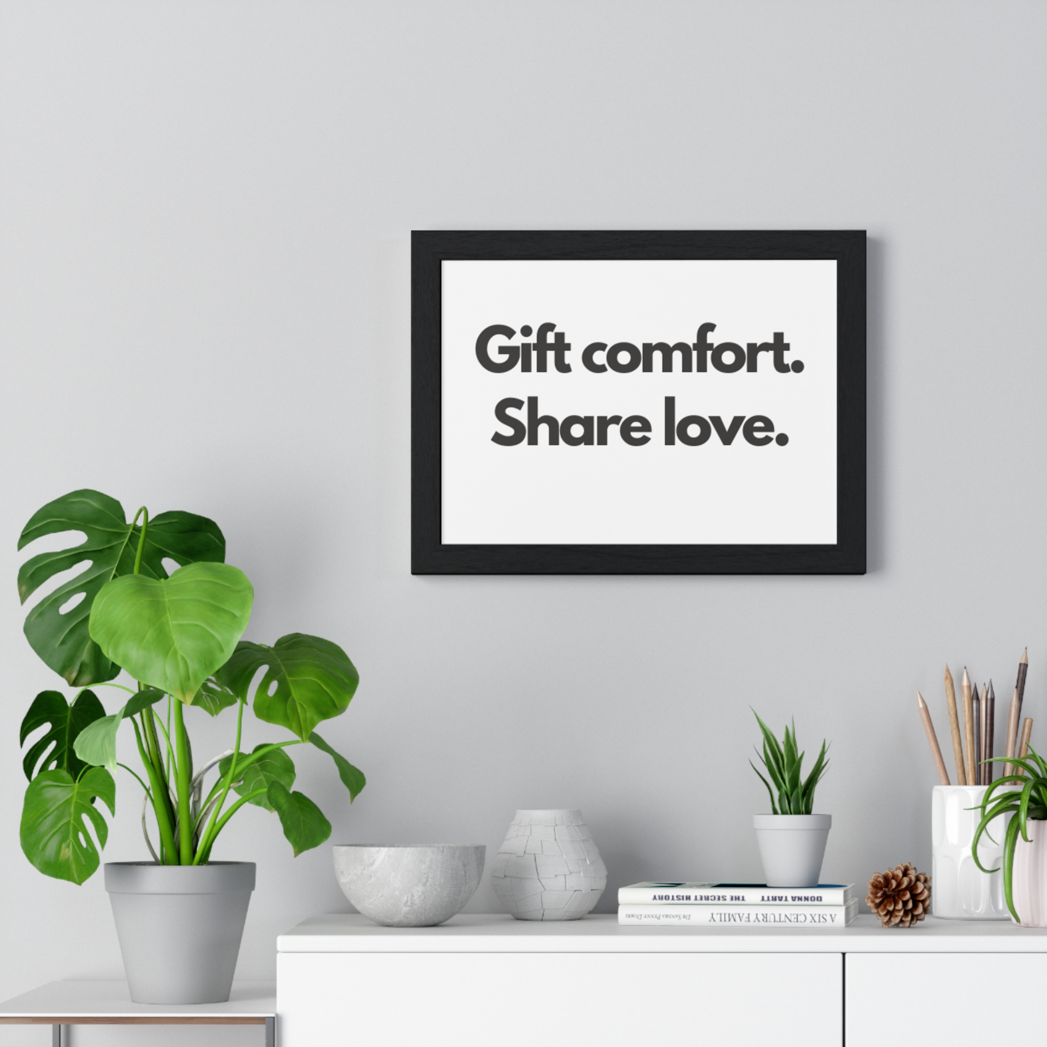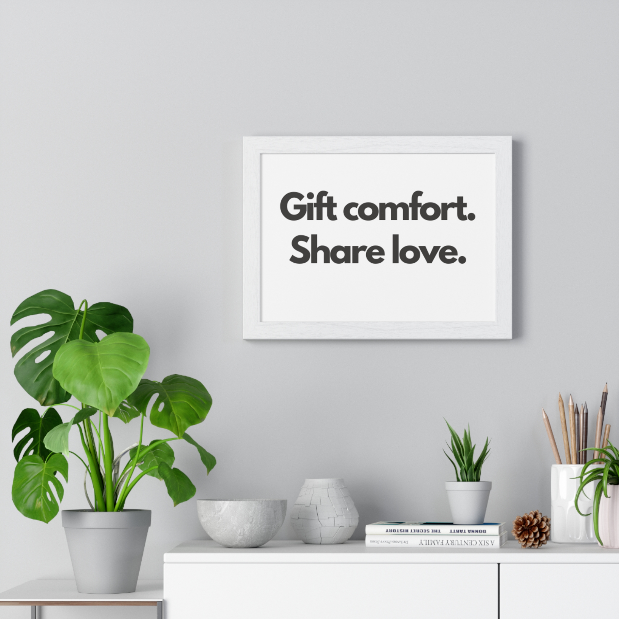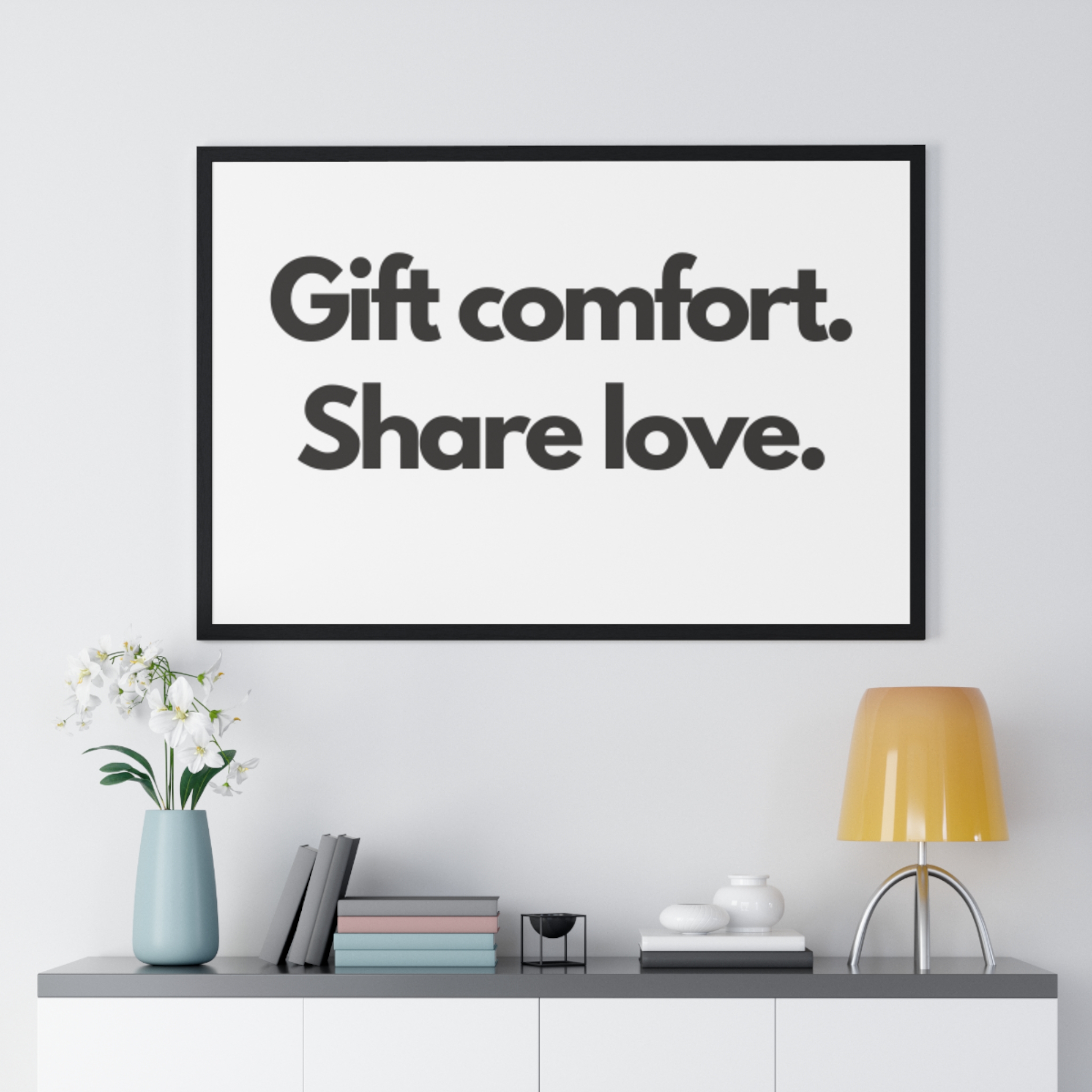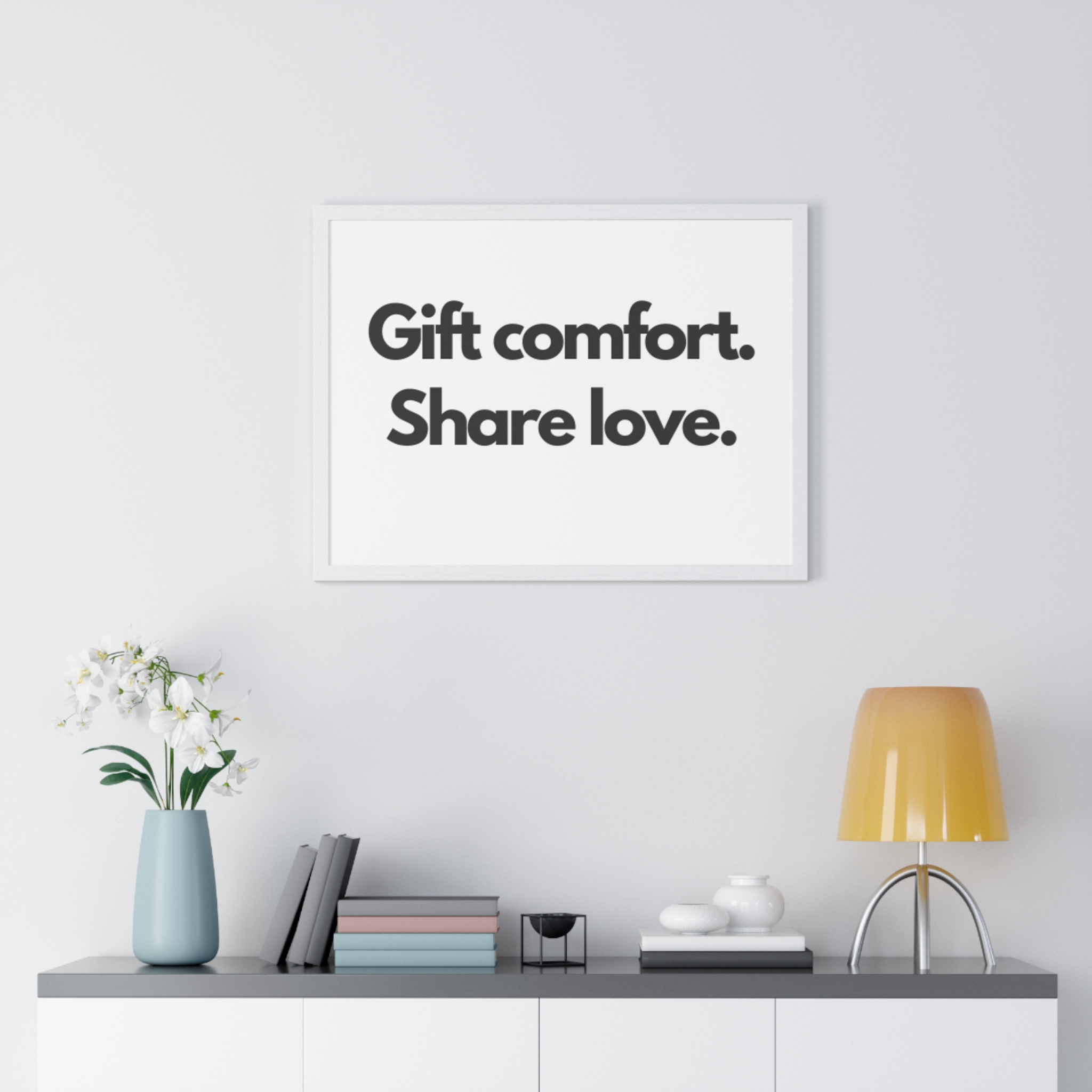 A clean, modern horizontal framed poster that speaks in quiet confidence. Bold, sans-serif text—”Gift comfort. Share love.”—rests on matte museum-grade paper, printed with vivid pigment inks that hold rich blacks and crisp edges. The slim wooden frame (choose black or white) and plexiglass front create a gallery-ready piece that hangs easily with pre-installed hardware. It brings a calm, thoughtful presence to living rooms, entryways, nurseries, or cozy reading nooks, and scales across multiple sizes to suit your wall and mood.