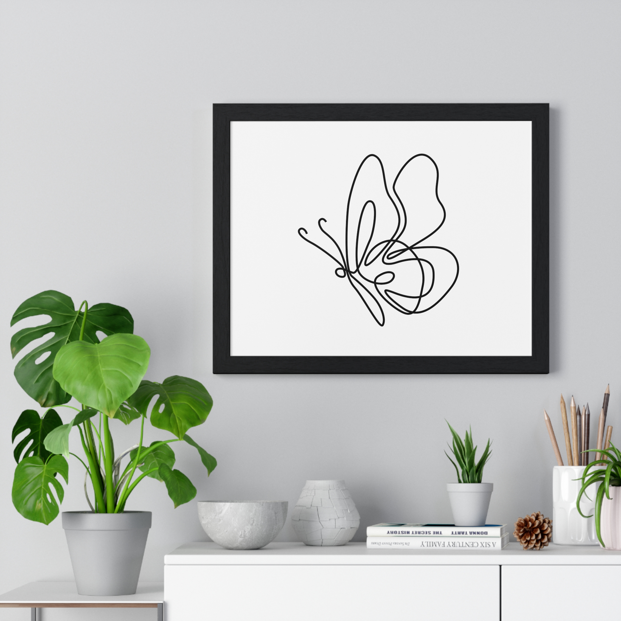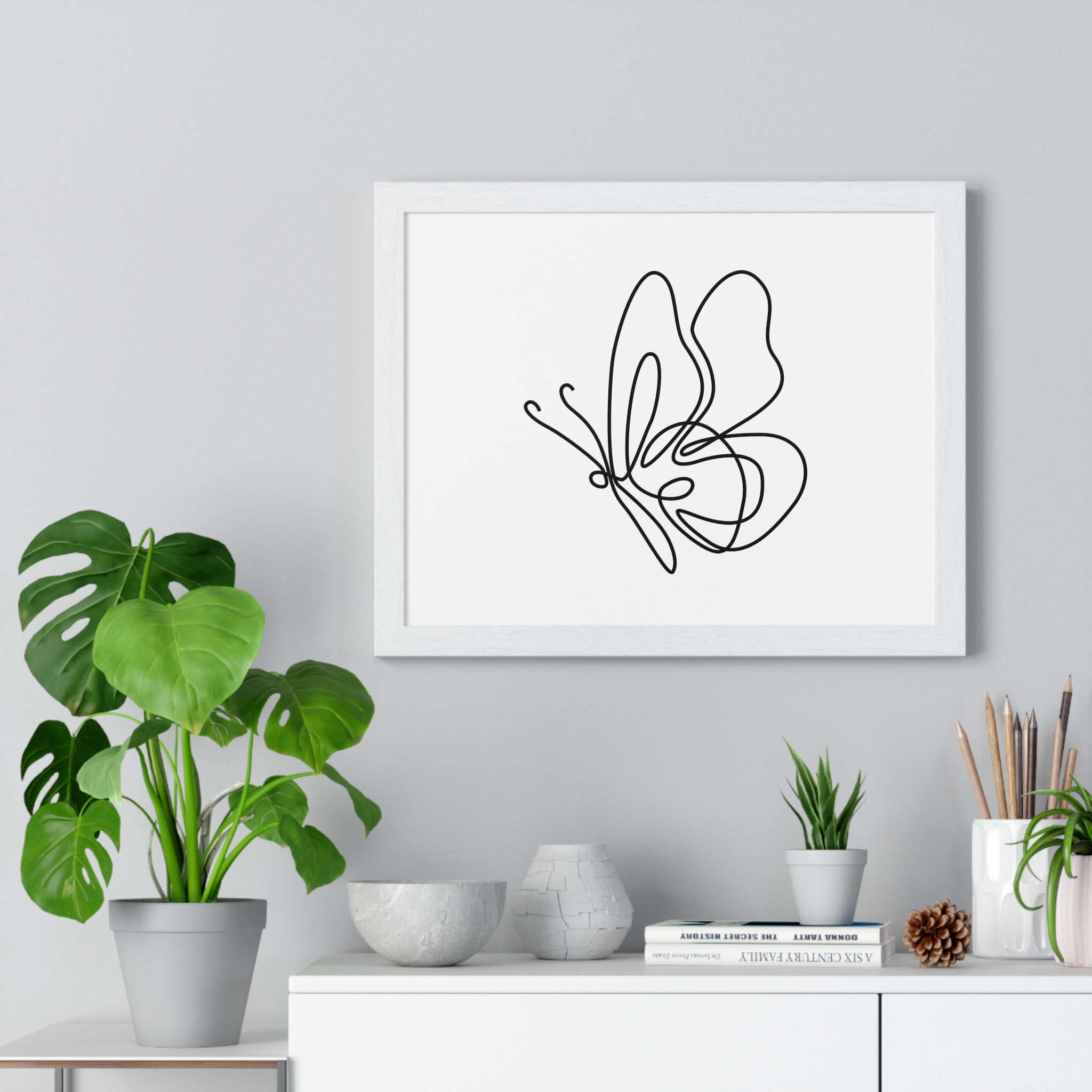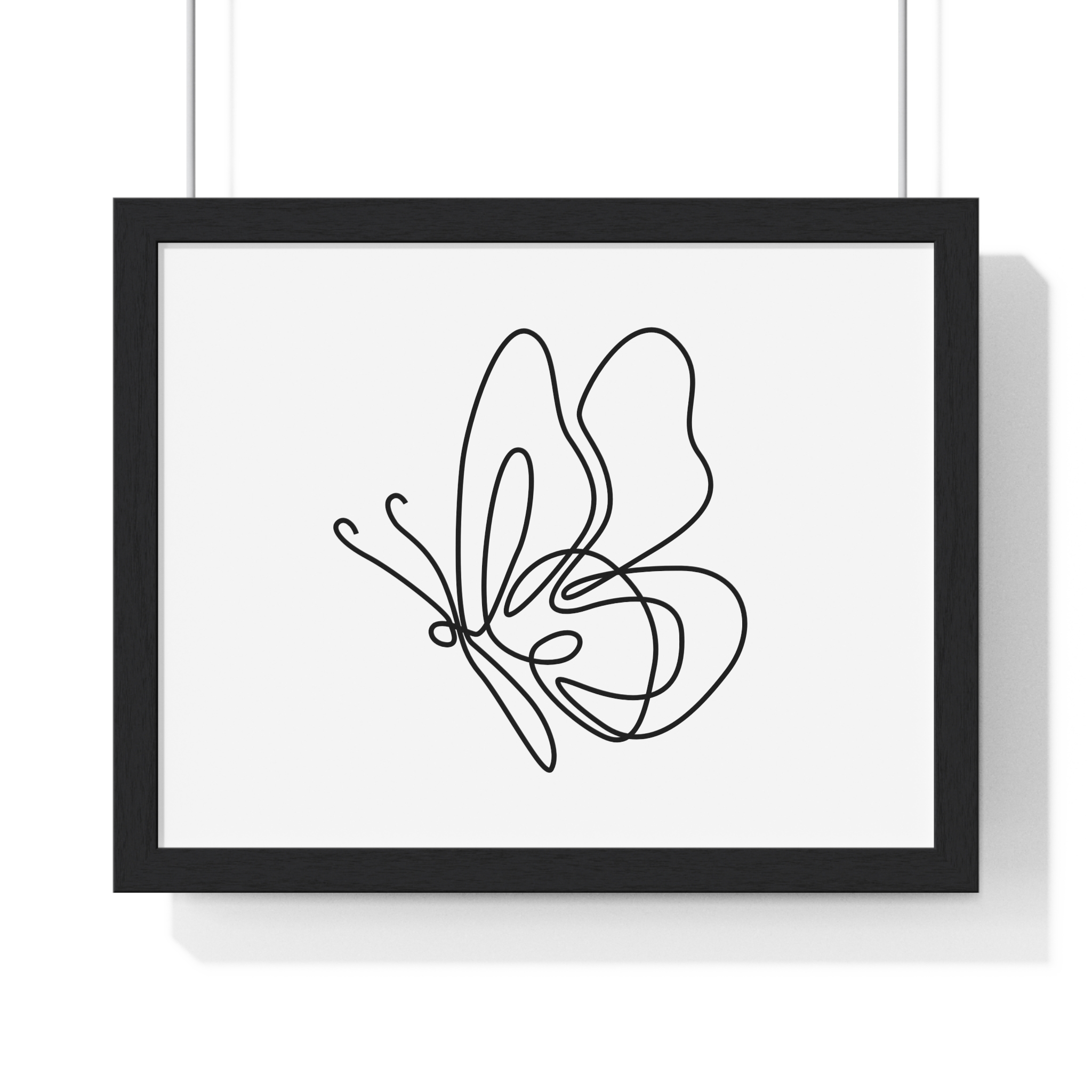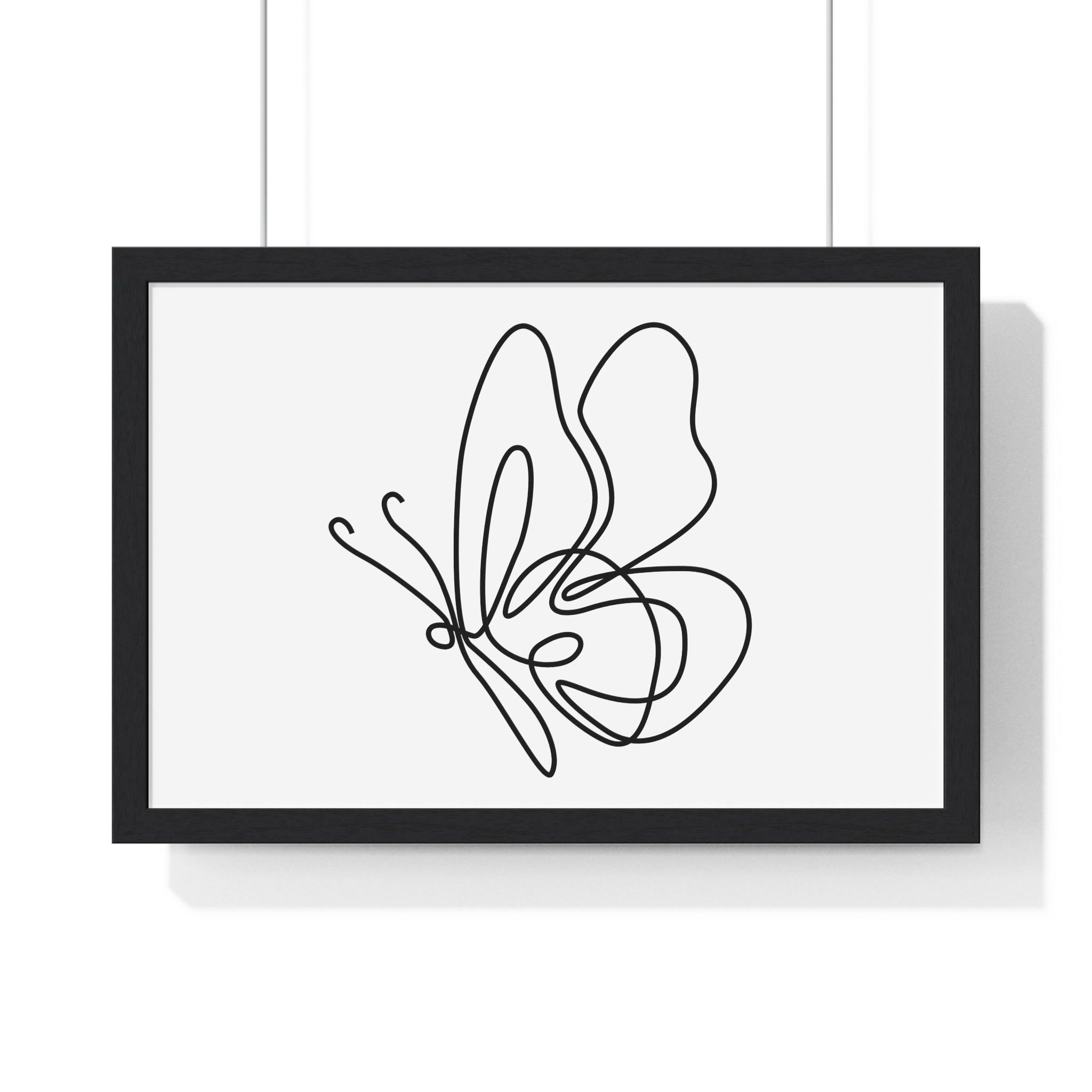 A calm, modern framed poster that brings quiet elegance to a living space. The minimalist single-line butterfly sketch floats on museum-grade matte paper, rendered with rich pigment inks for clean, lasting contrast. The slim wooden frame — offered in black or white — and plexiglass front keep the piece feeling contemporary and light while protecting the print for years. Pre-installed hanging hardware makes placement effortless, and multiple sizes let you scale the artwork from a delicate nook to a statement above a console. For indoor spaces where subtlety matters, this framed print settles into serene corners, bright shelves, or gallery-style walls.