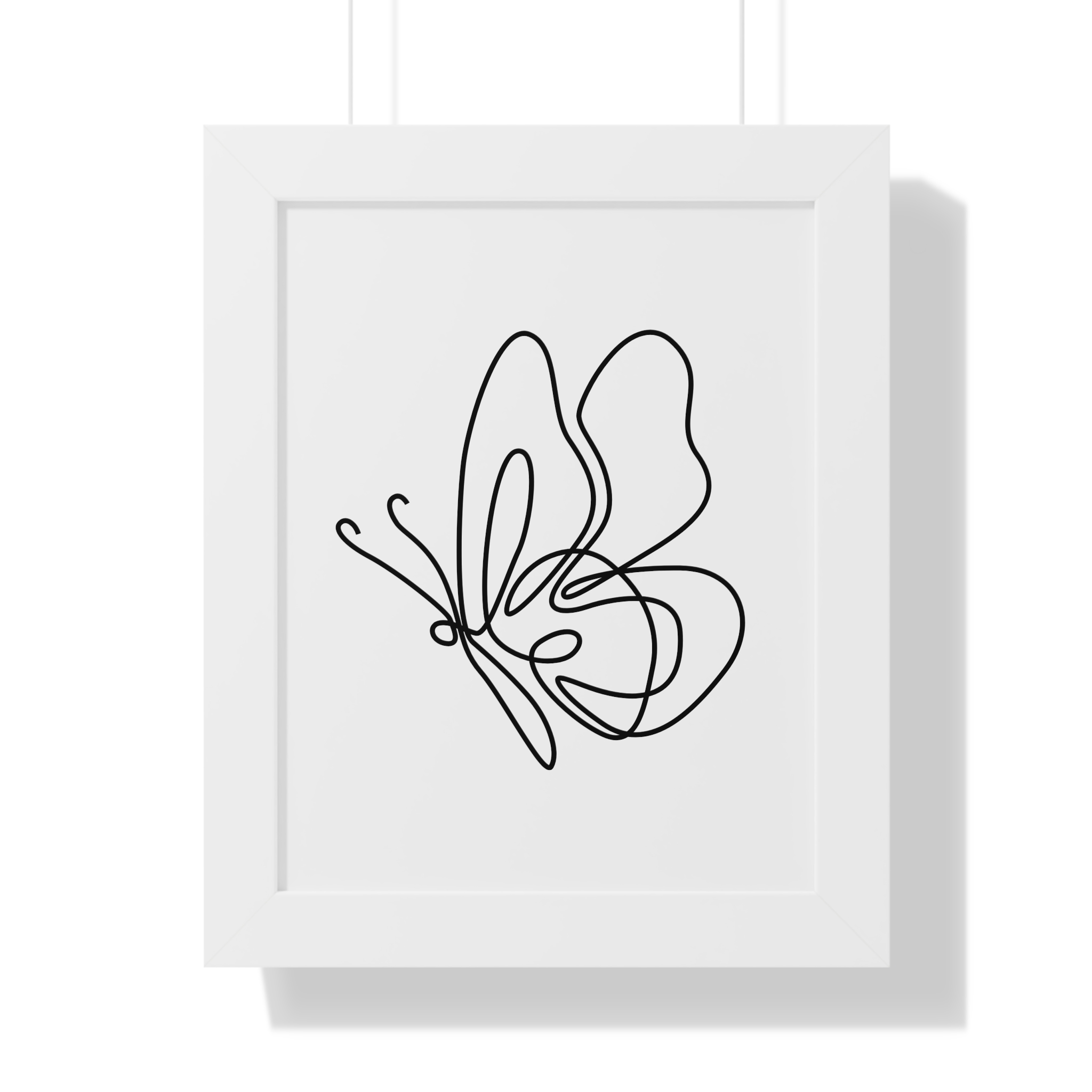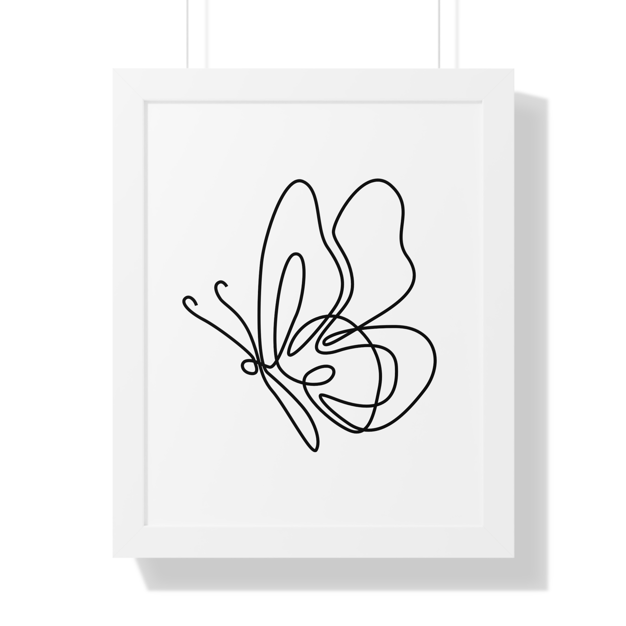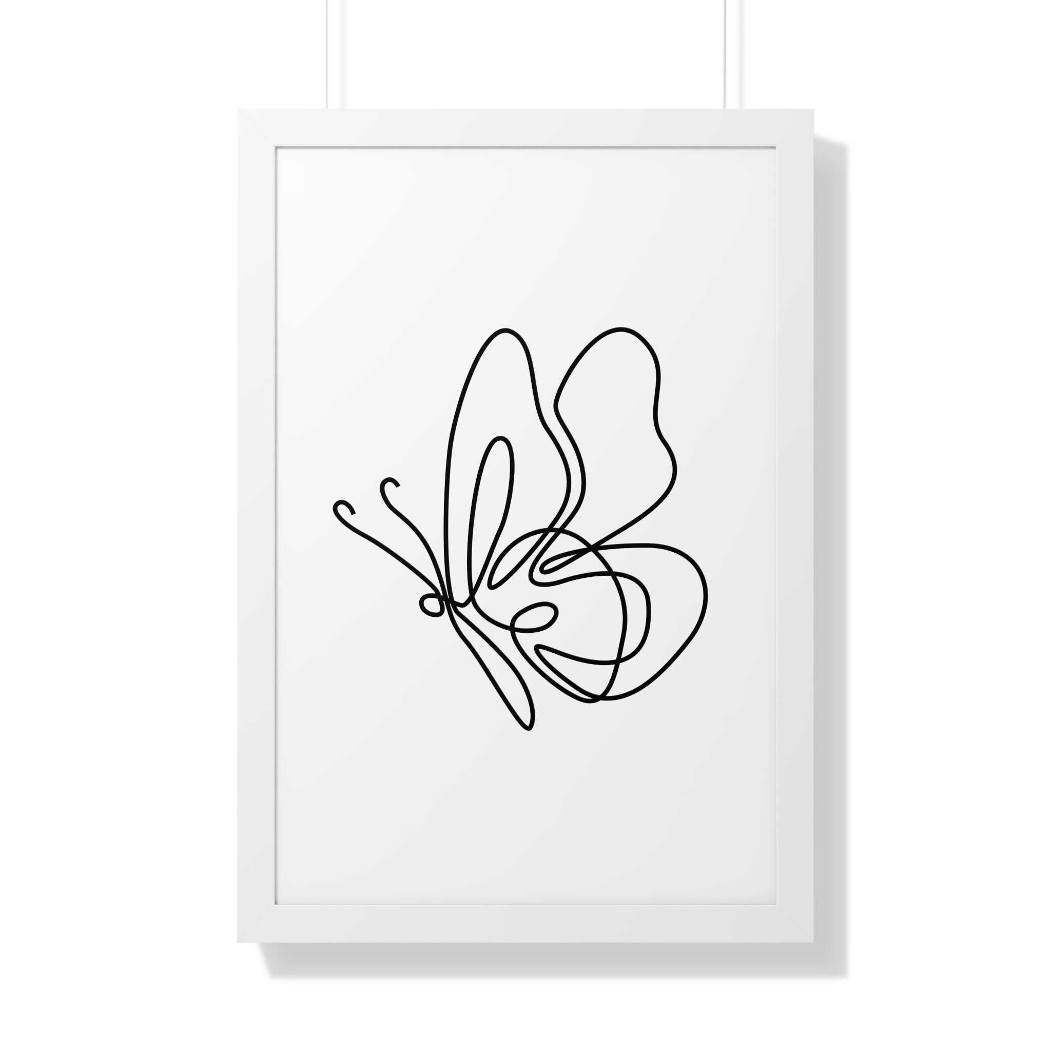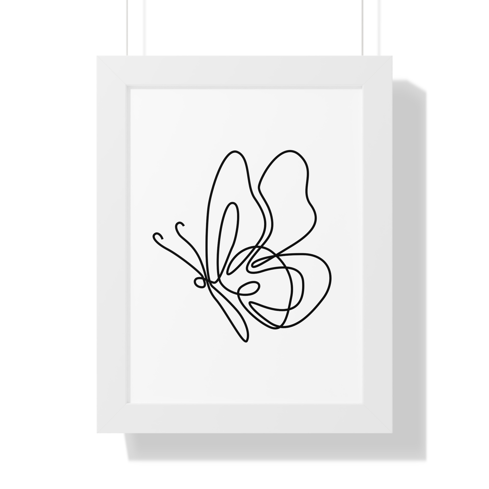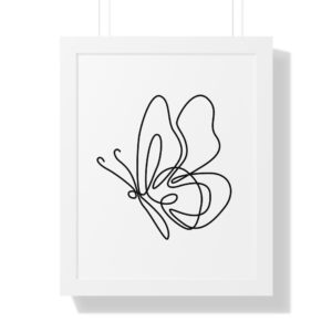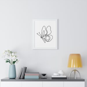 A minimalist framed vertical poster that brings calm and understated elegance to any wall. The single-line butterfly sketch floats on museum-quality matte paper, its gentle curves and negative space creating a quiet focal point. Framed in your choice of black, white, or warm walnut, the piece arrives ready to hang with protective acrylic cover and built-in or included hardware. It reads as modern, airy, and thoughtfully simple — a subtle statement that complements clean, plant-filled interiors and serene workspaces.
