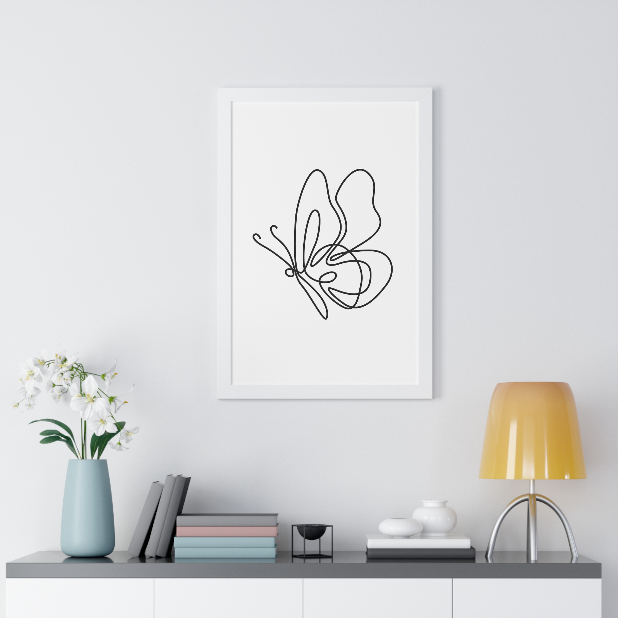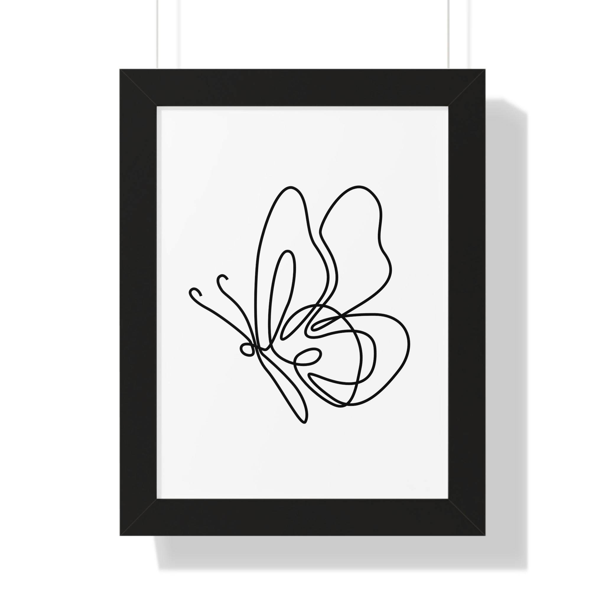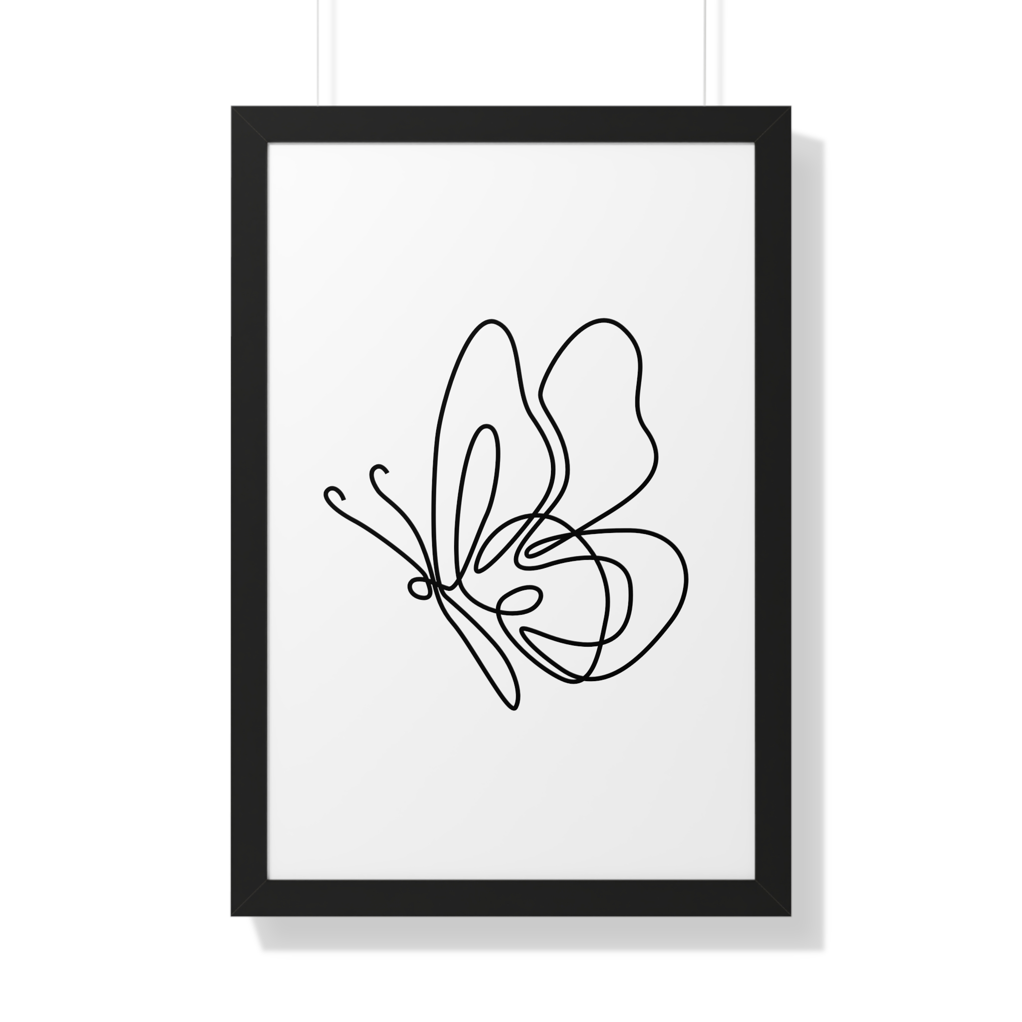 A minimalist framed vertical poster that brings calm and understated elegance to any wall. The single-line butterfly sketch floats on museum-quality matte paper, its gentle curves and negative space creating a quiet focal point. Framed in your choice of black, white, or warm walnut, the piece arrives ready to hang with protective acrylic cover and built-in or included hardware. It reads as modern, airy, and thoughtfully simple — a subtle statement that complements clean, plant-filled interiors and serene workspaces.