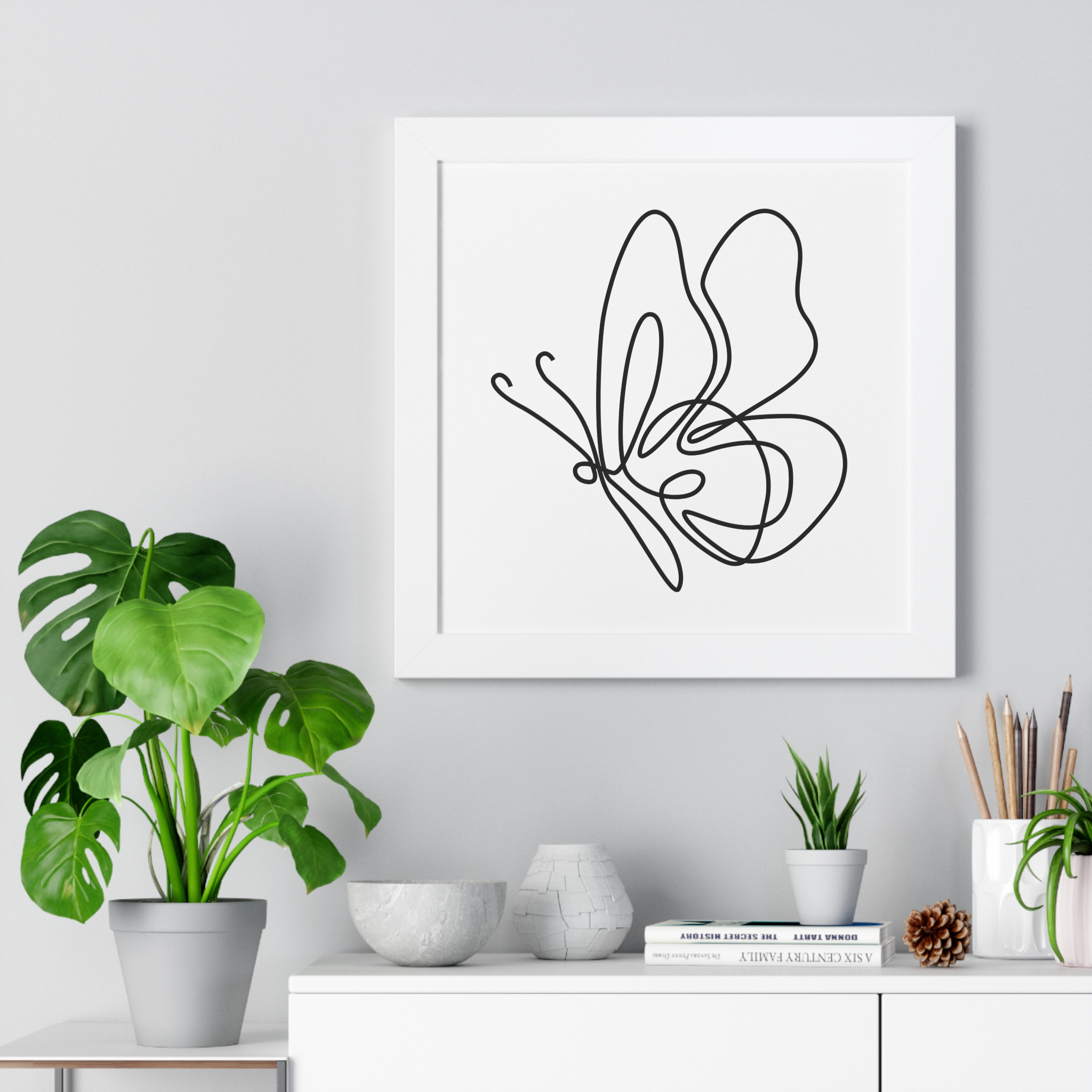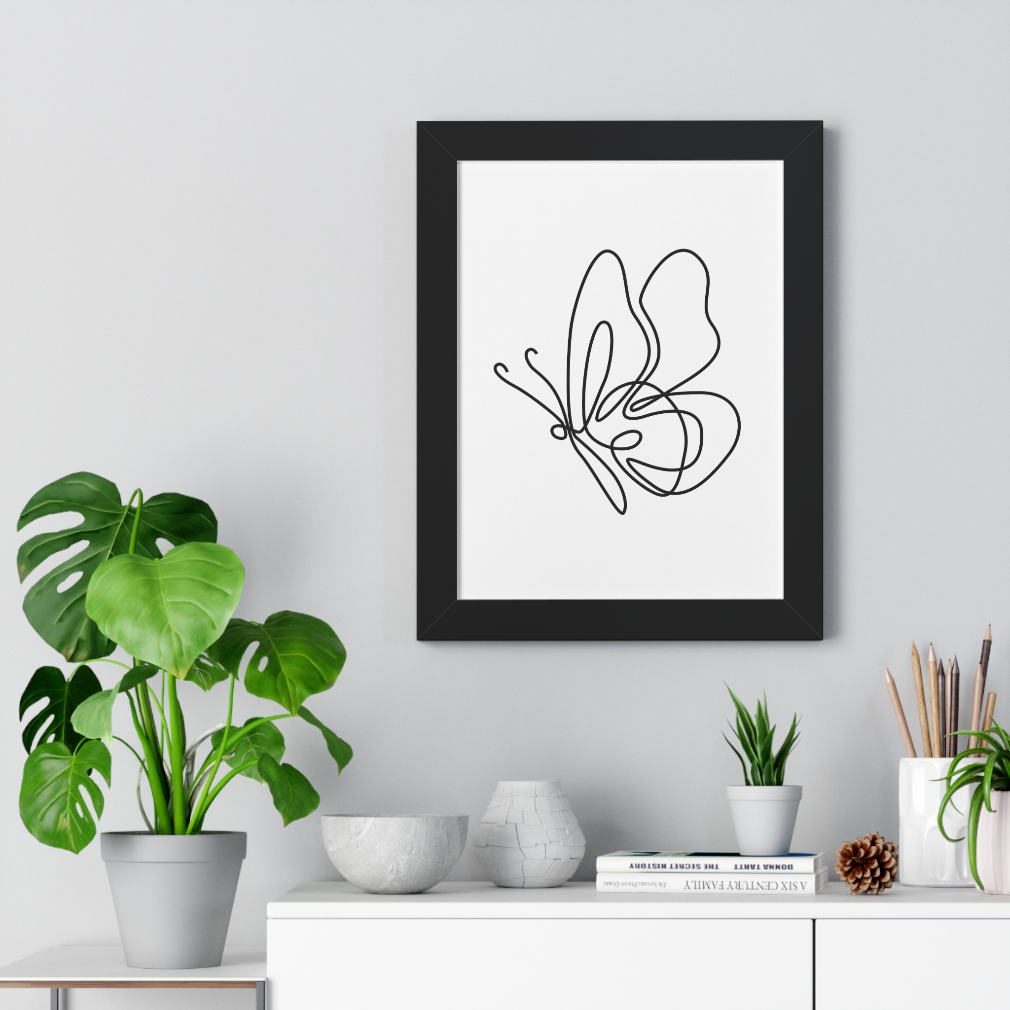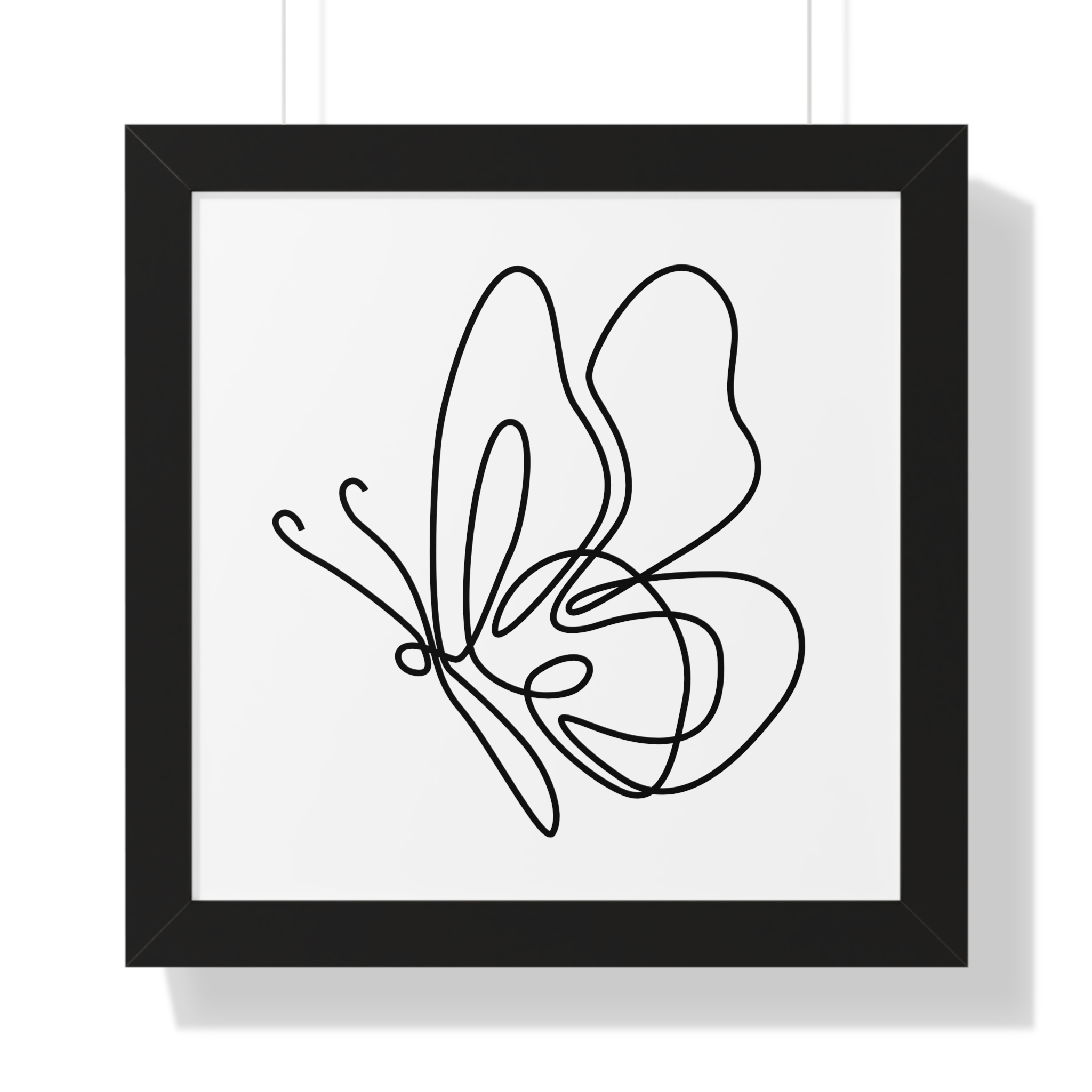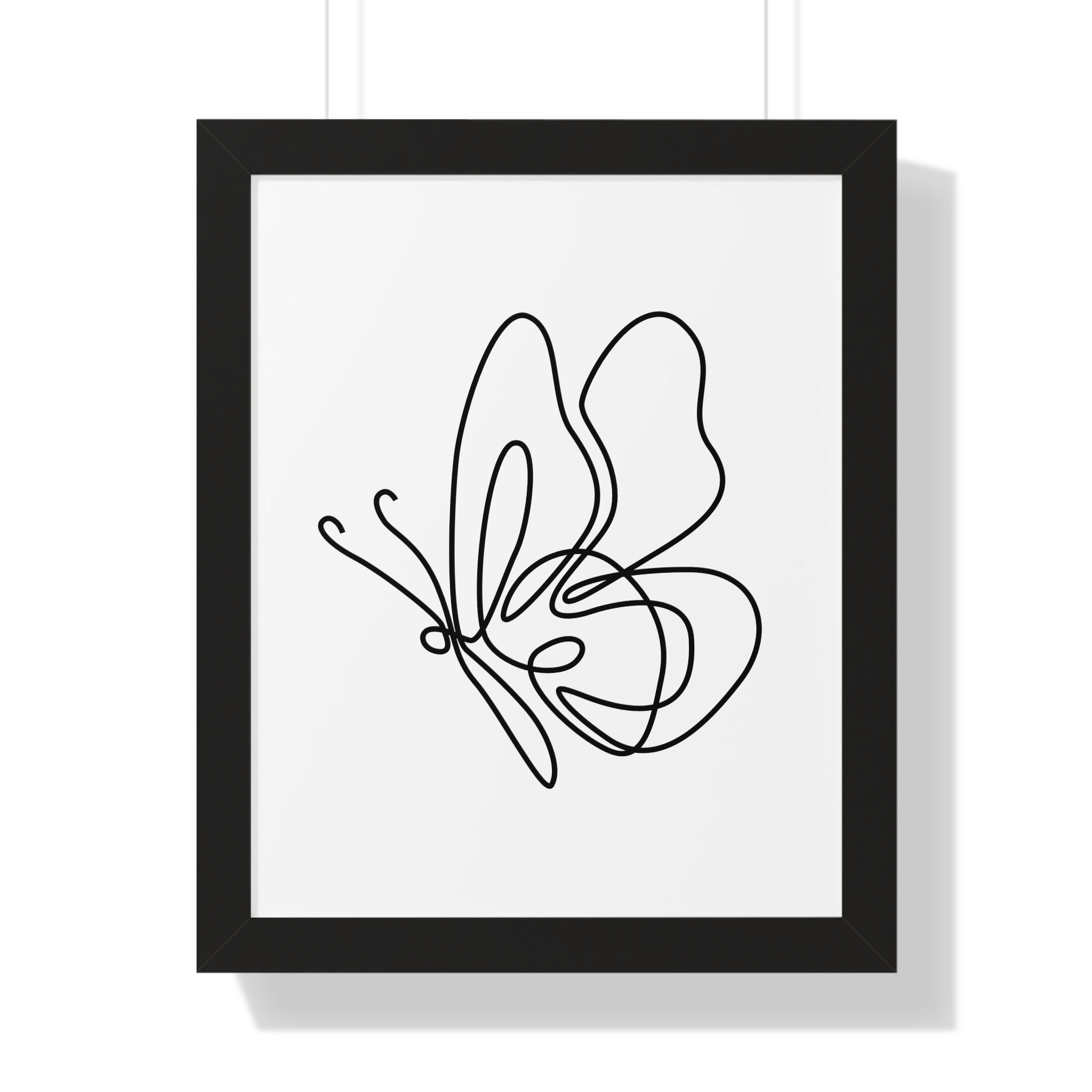A minimalist framed vertical poster that brings calm and understated elegance to any wall. The single-line butterfly sketch floats on museum-quality matte paper, its gentle curves and negative space creating a quiet focal point. Framed in your choice of black, white, or warm walnut, the piece arrives ready to hang with protective acrylic cover and built-in or included hardware. It reads as modern, airy, and thoughtfully simple — a subtle statement that complements clean, plant-filled interiors and serene workspaces.