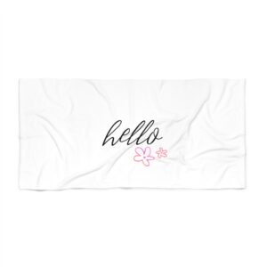 Hello Floral Beach Towel — Lightweight White Towel with Script “hello” and Pink Flowers