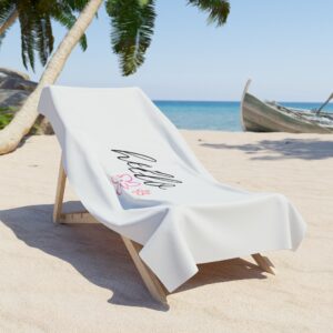 Lightweight and cheerful, this beach towel brings a gentle hello to slow mornings by the water. The one-sided, crisp print shows a handwritten “hello” and two soft pink blossoms on a clean white field — a quiet, friendly accent that reads sunny and calm. The top face is a quick-drying polyester knit that holds the print vividly. The back is a soft cotton loop weave that soaks up moisture and feels comfortable against skin. Hemmed edges keep the towel looking neat through repeated use. Choose a compact 30″ × 60″ for easier packing or the roomy 36″ × 72″ to stretch out on the sand. It’s made from a polyester/cotton blend and meets common safety and dye standards, so you get both playful design and dependable performance.