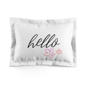 A soft, welcoming touch for any restful corner — this microfiber pillow sham reads “hello” in a flowing script, accented by two hand-drawn pink blooms. The brushed microfiber surface holds crisp print detail while feeling lightweight and gentle against the skin. Finished with a neat flange edge and a double-layer envelope closure, it slips over your pillow insert easily and keeps everything tucked in. Subtle cream backing and a clean white front let this design blend with neutral linens or add a friendly pop to a cottage, modern, or minimalist bedside. Use it to refresh a guest room, brighten a reading nook, or add a casual, cheerful layer to everyday bedding.