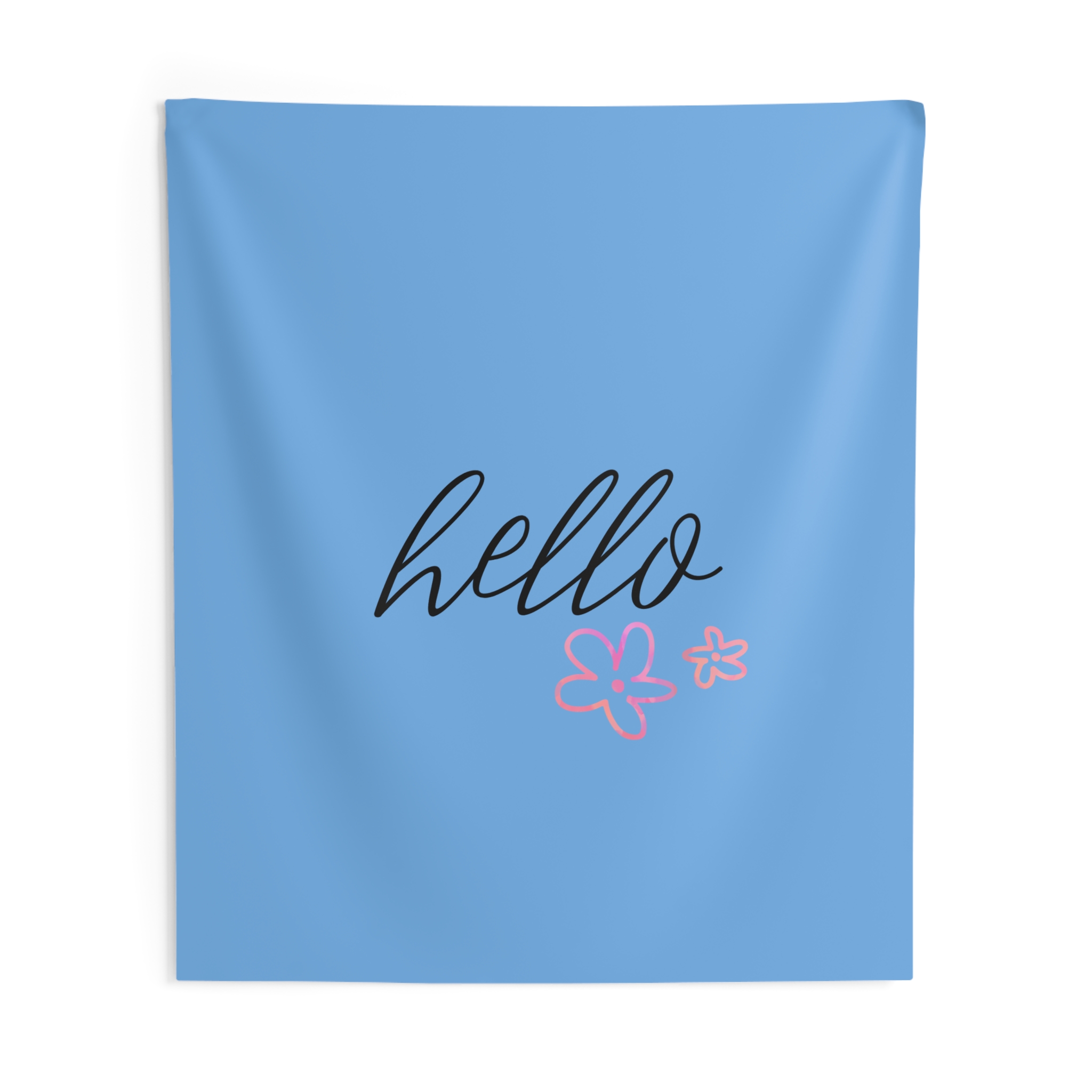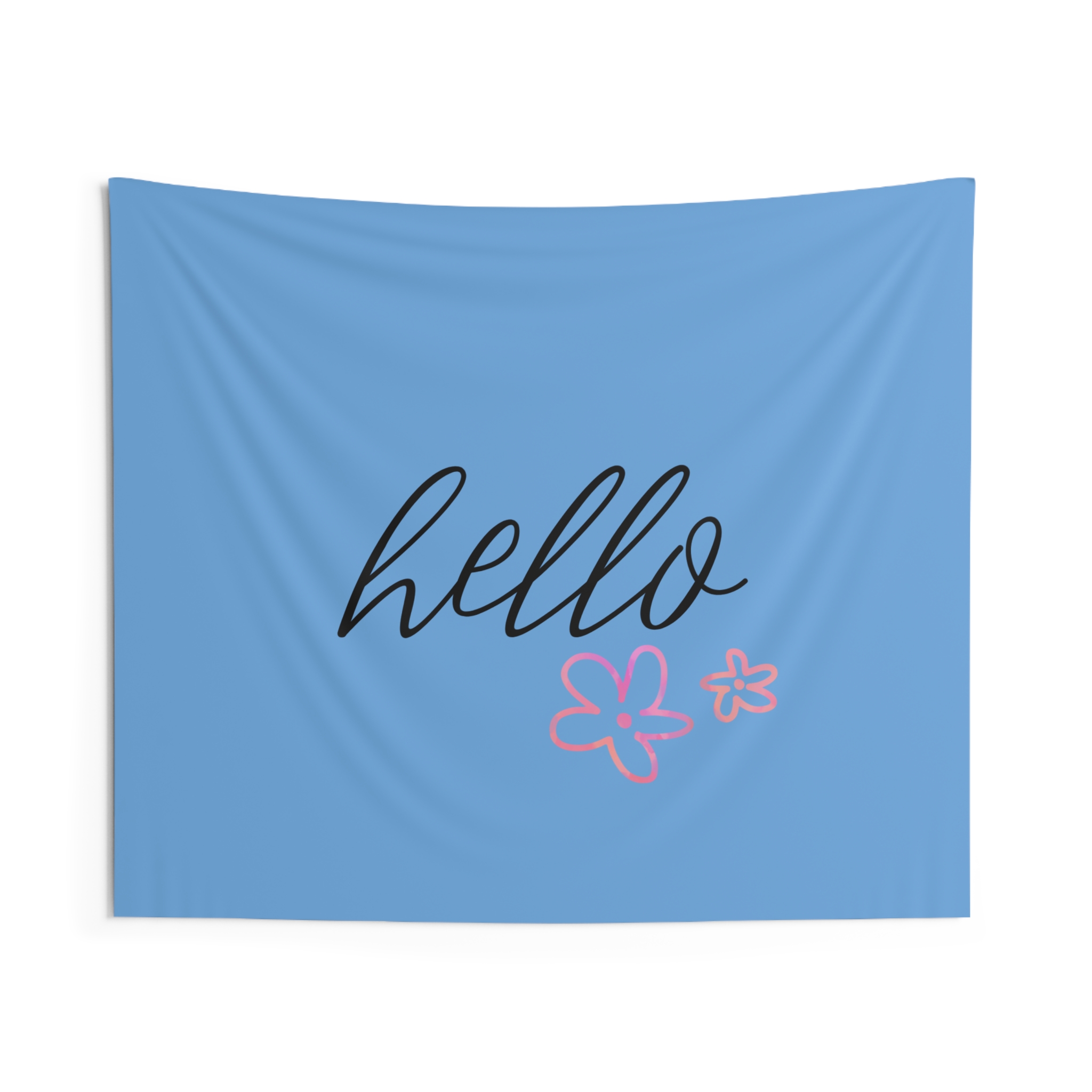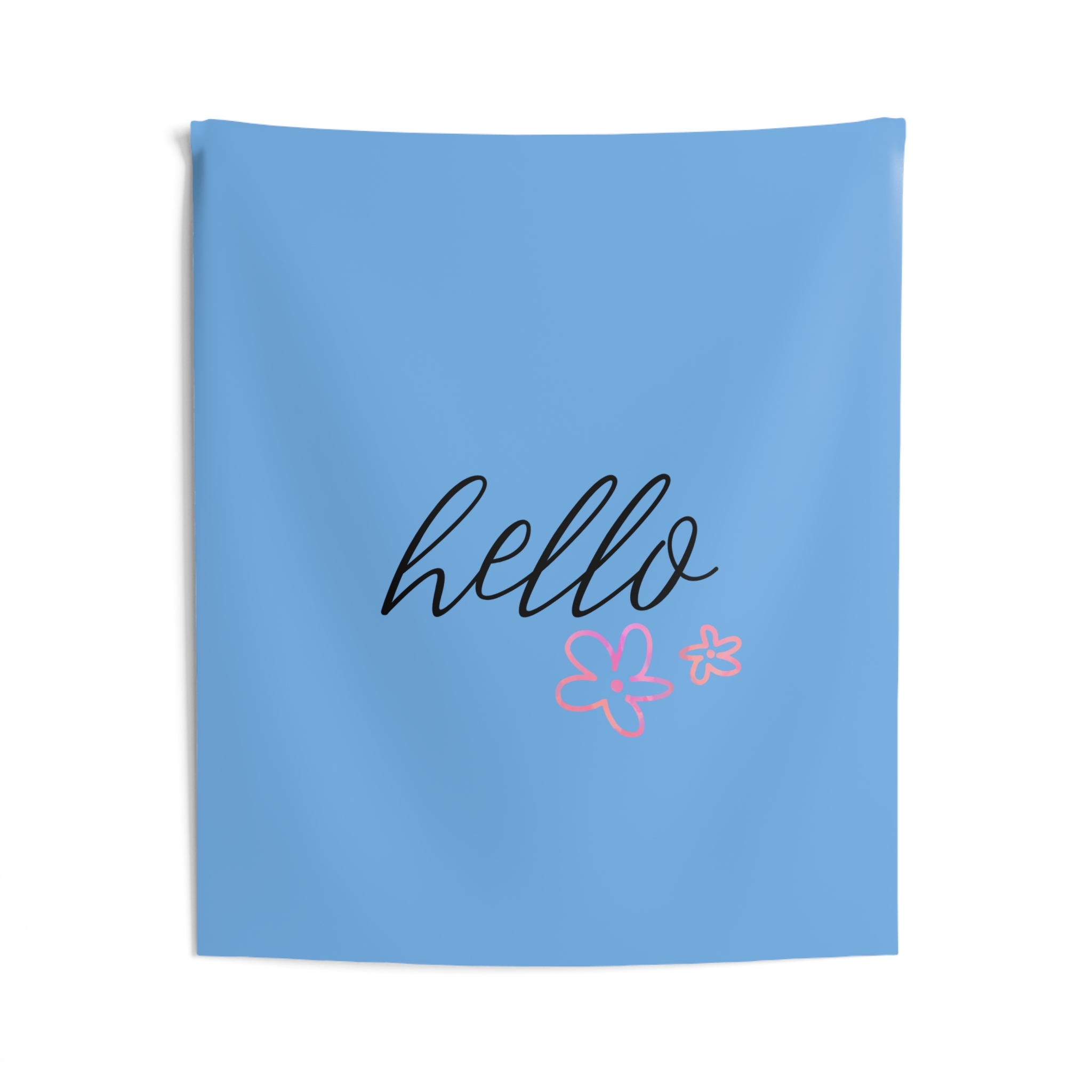 A soft, breezy wall tapestry that greets your space with casual warmth. The sky-blue field and handwritten “hello” float like a friendly note, while two simple pink blossoms add a playful, handmade touch. Lightweight polyester hangs smoothly, keeps its shape, and brings a gentle splash of color to bedrooms, home offices, dorm rooms, or shared living areas. Draped above a bed or pinned over a desk, it reads like a small, steady reminder to slow down and smile.