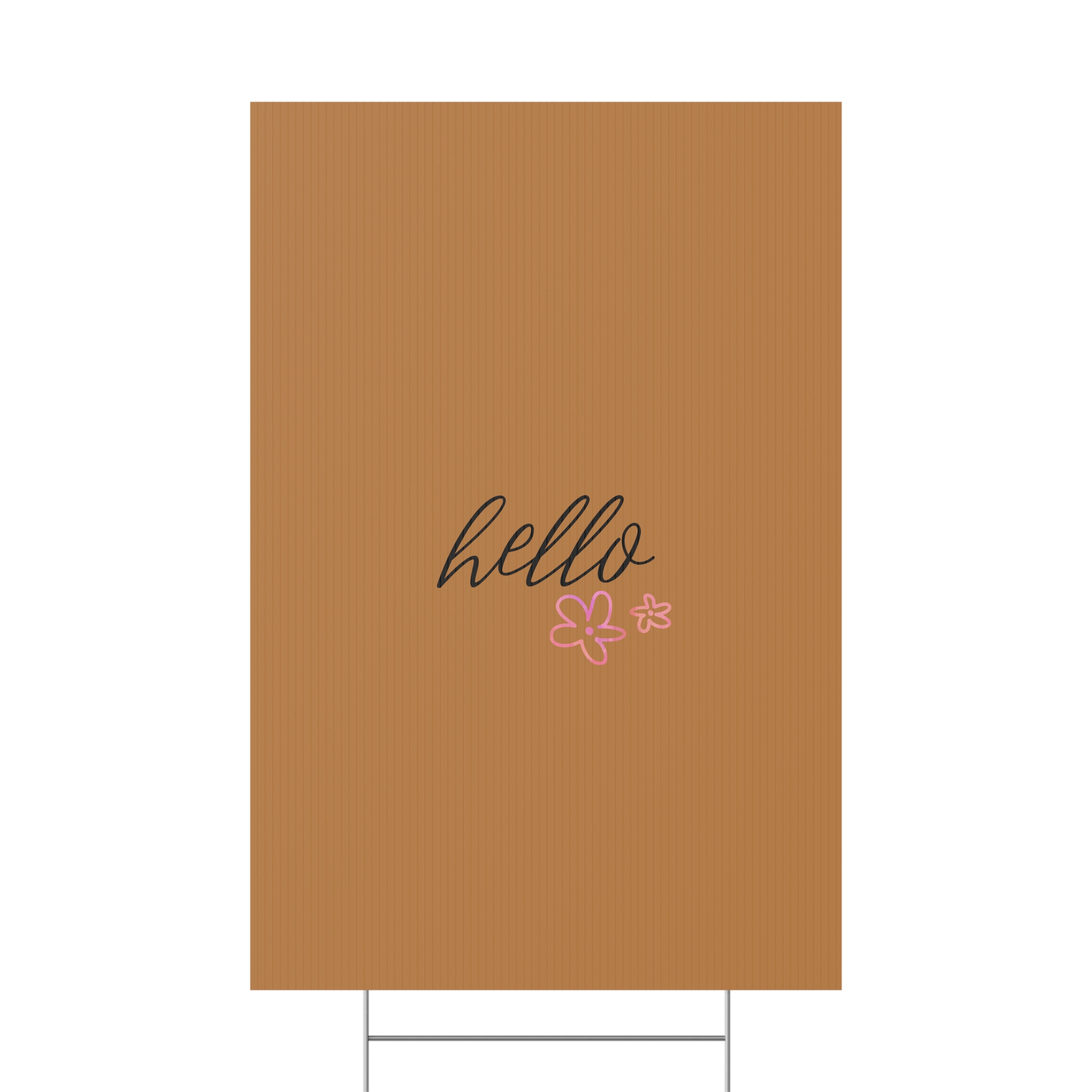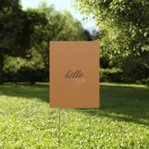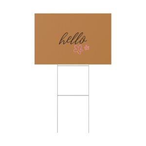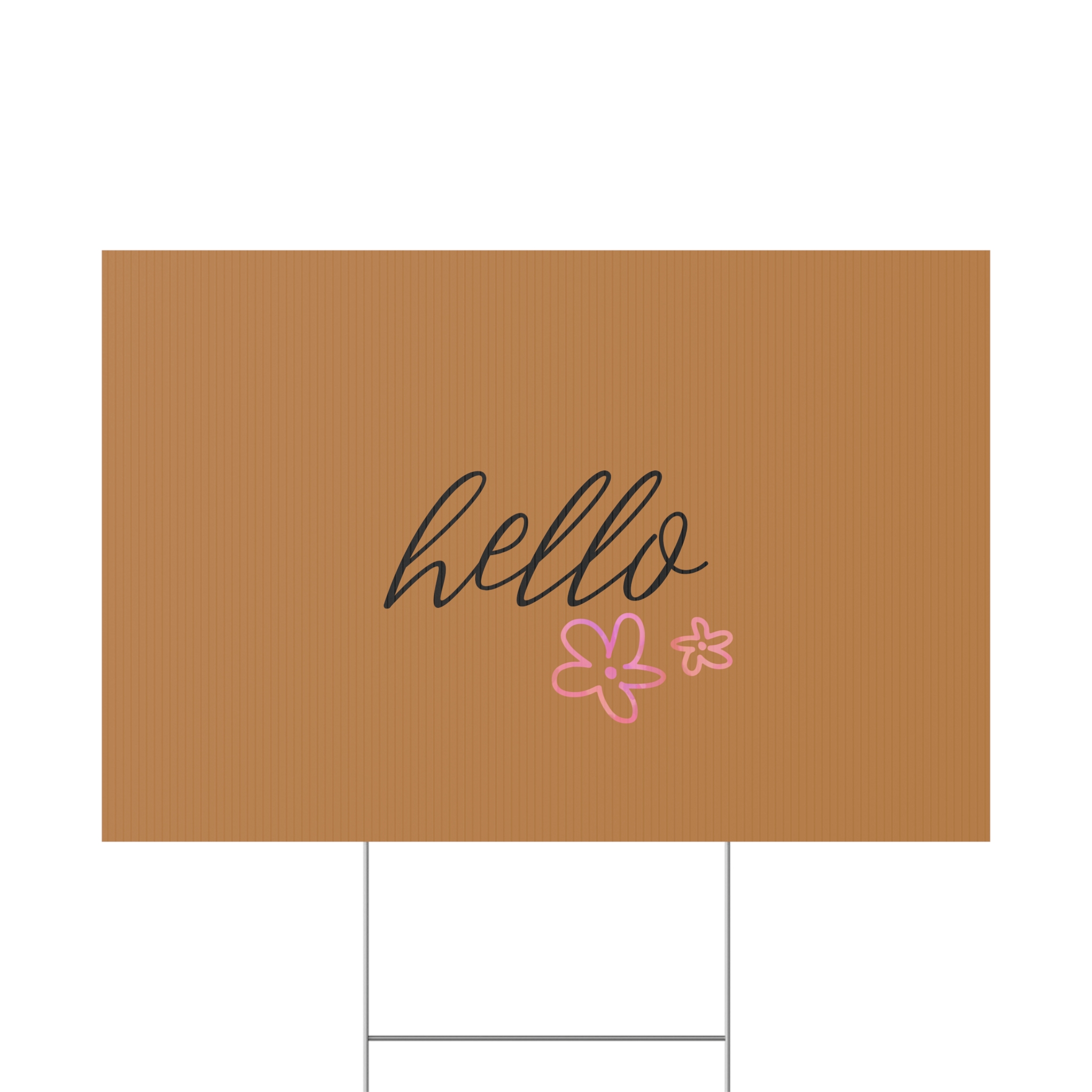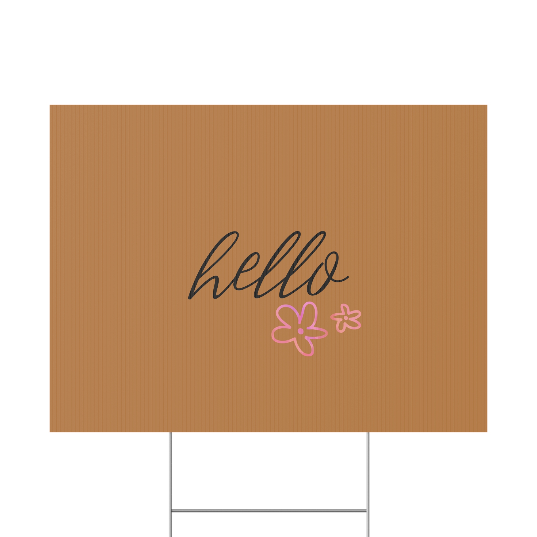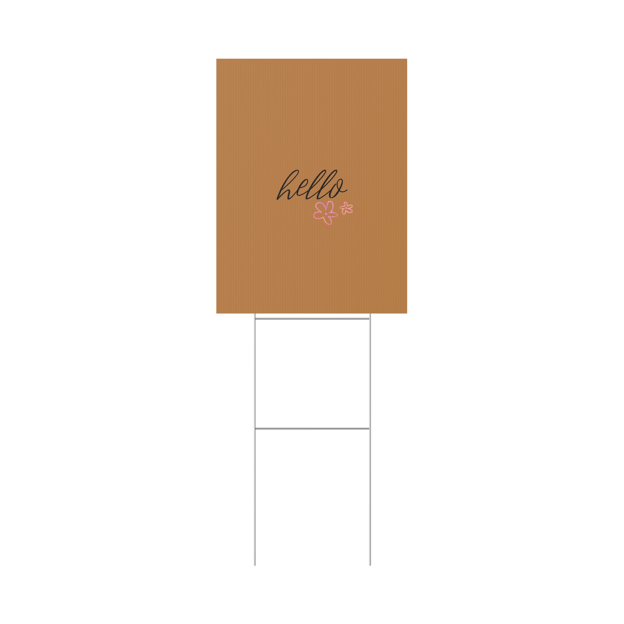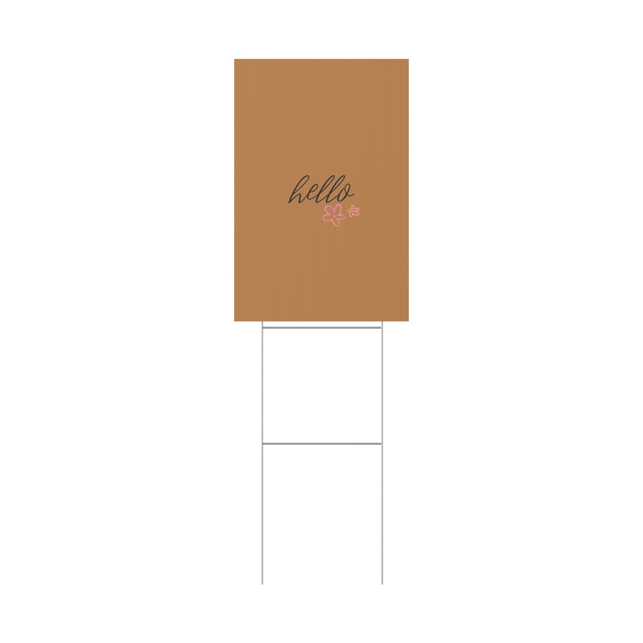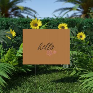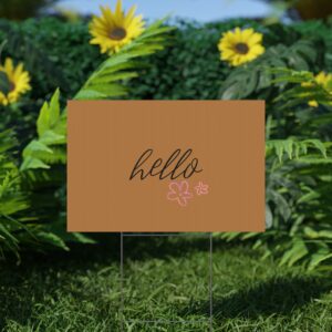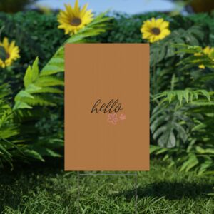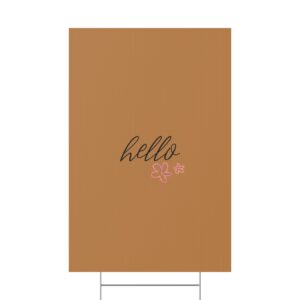 A warm, welcoming yard sign that brings a gentle, handmade touch to your front lawn. The matte, earthy background sets off a casual hand-lettered “hello” paired with two simple pink blooms — a soft hello to neighbors, visitors, and passersby. Weather-ready and printed on both sides, this low-key design reads clearly from either direction and settles into gardens, porches, or pathway beds without shouting. It feels friendly and calm, like waving from a sunlit porch on a slow morning.