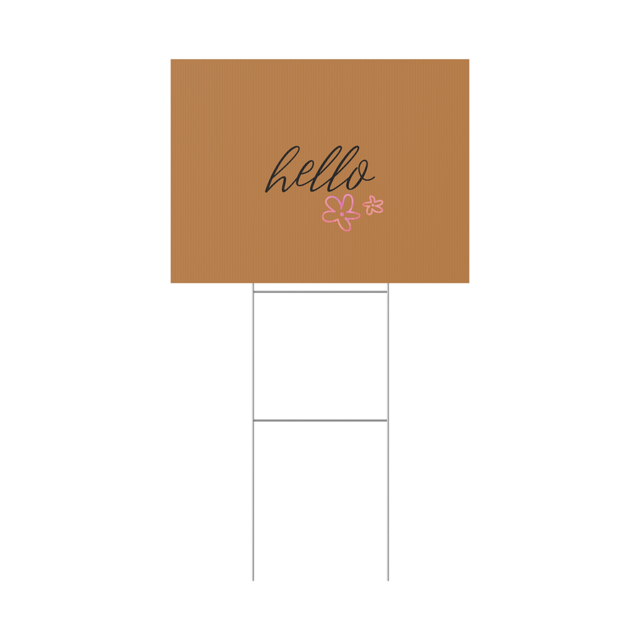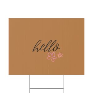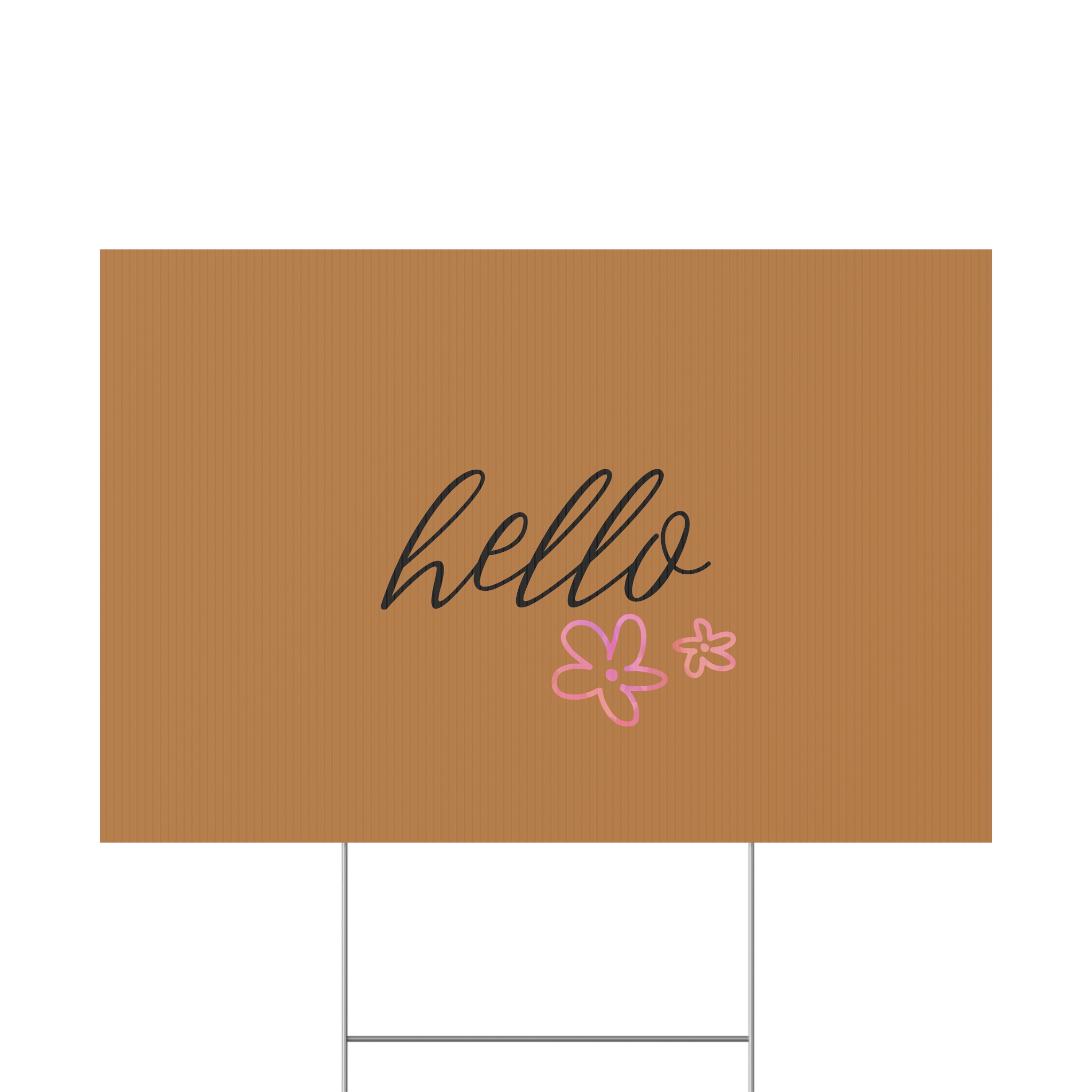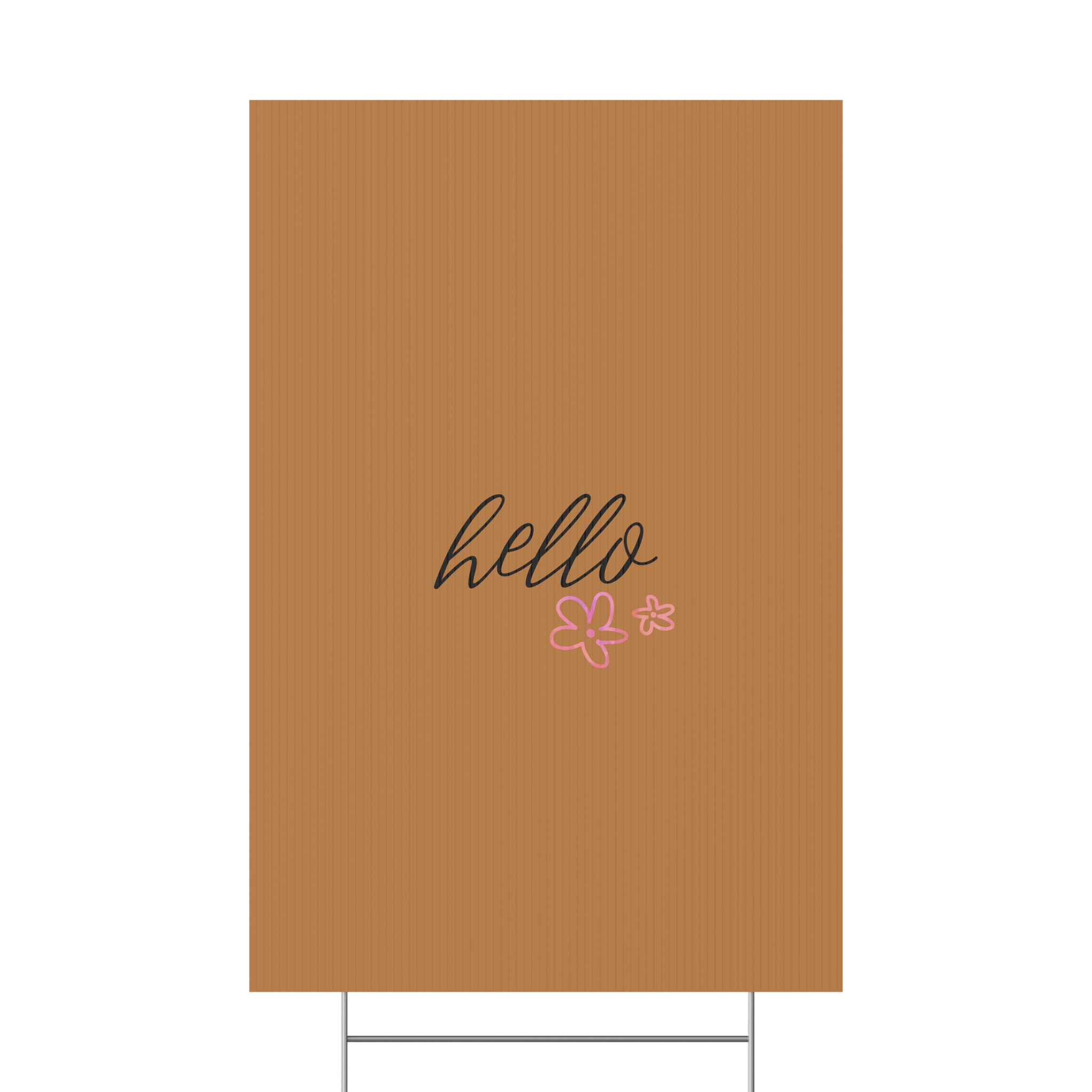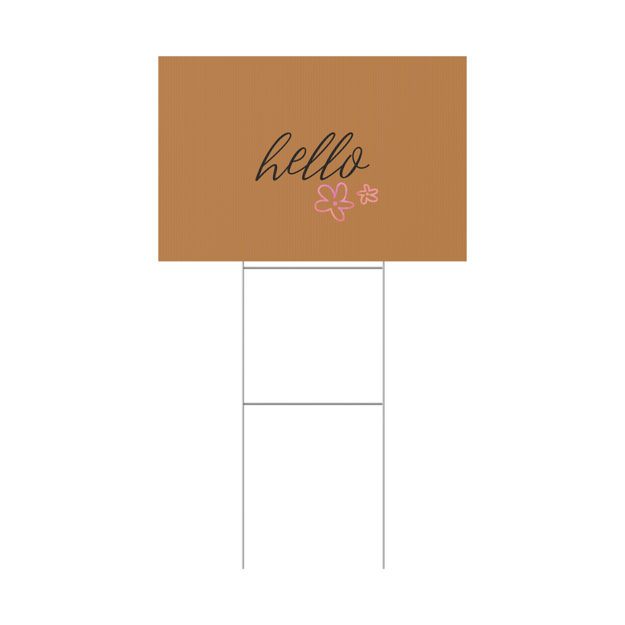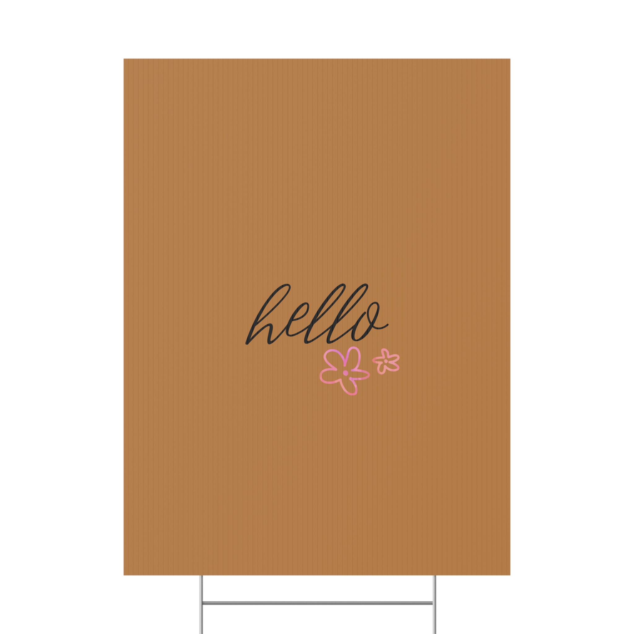 A warm, welcoming yard sign that brings a gentle, handmade touch to your front lawn. The matte, earthy background sets off a casual hand-lettered “hello” paired with two simple pink blooms — a soft hello to neighbors, visitors, and passersby. Weather-ready and printed on both sides, this low-key design reads clearly from either direction and settles into gardens, porches, or pathway beds without shouting. It feels friendly and calm, like waving from a sunlit porch on a slow morning.