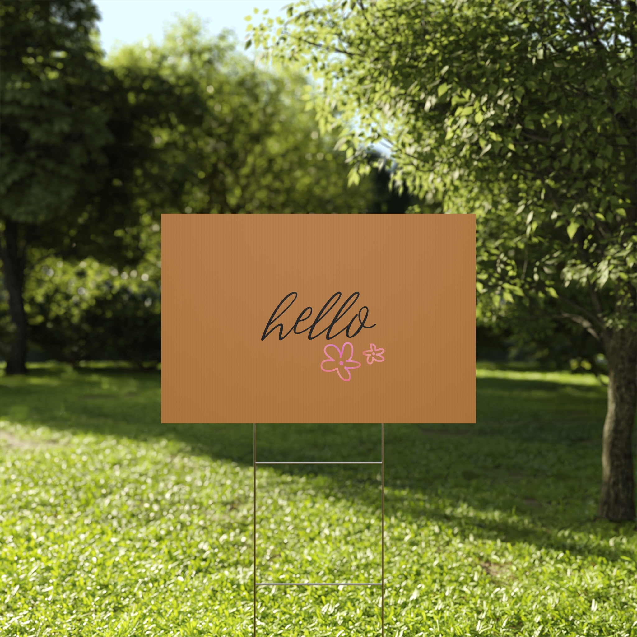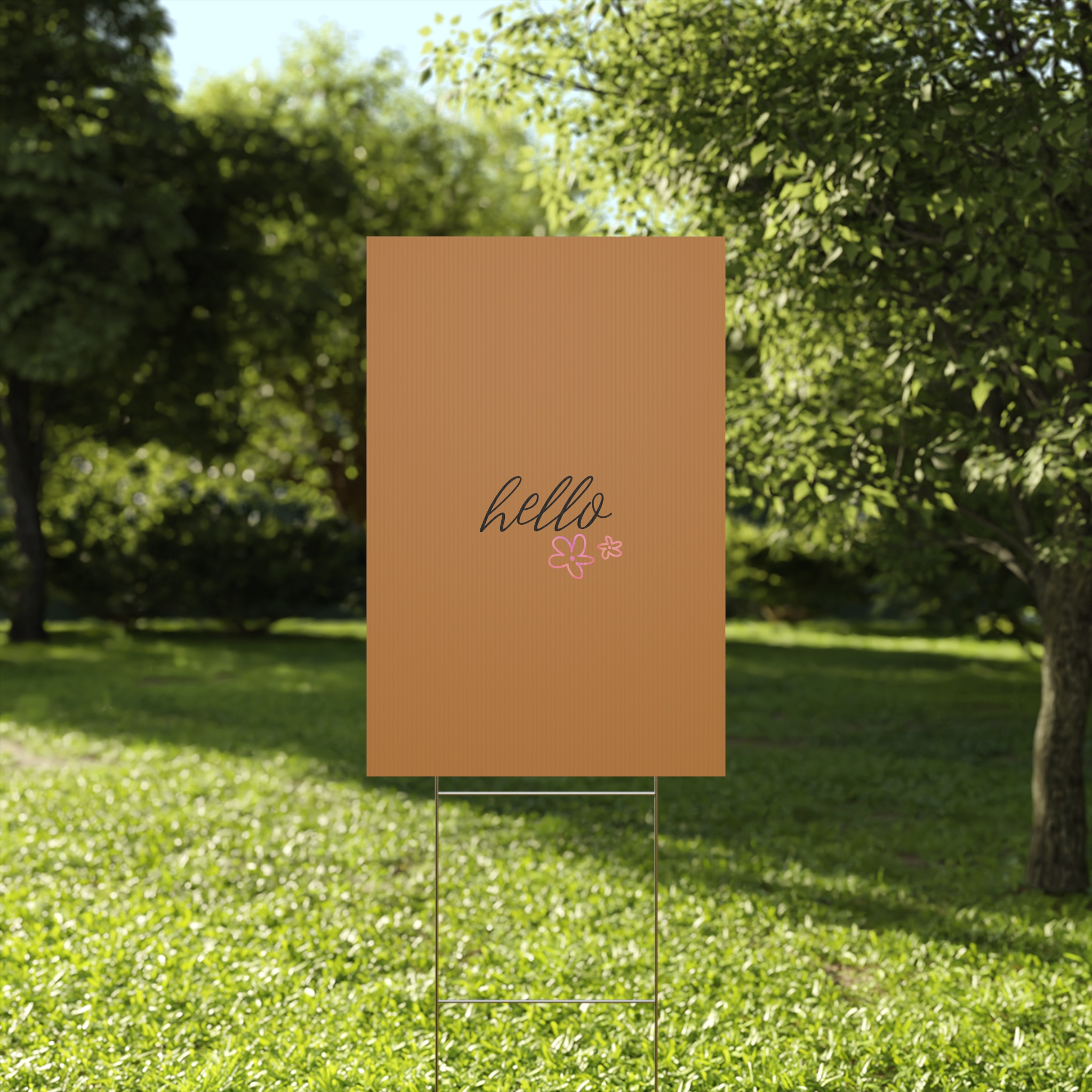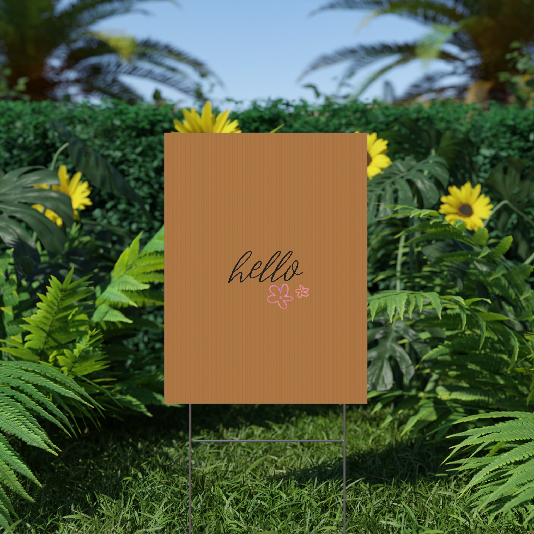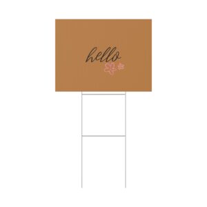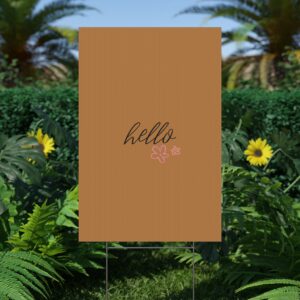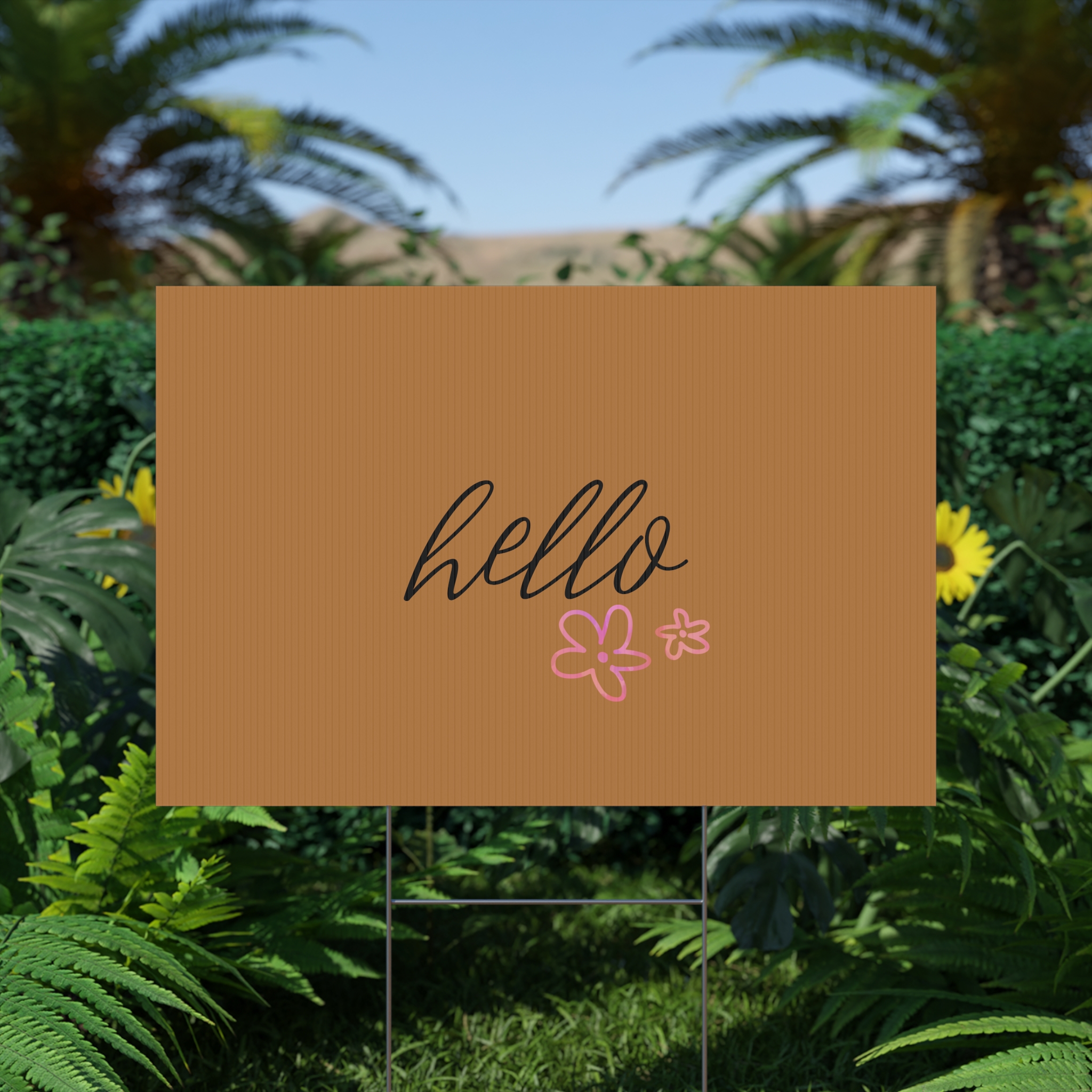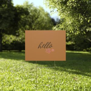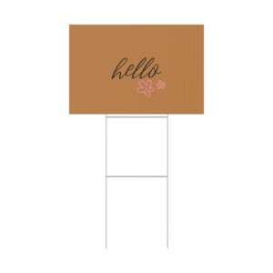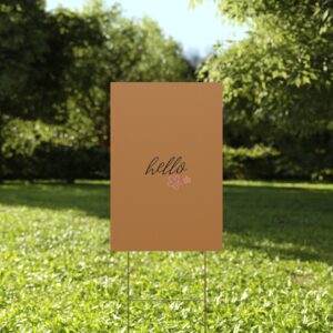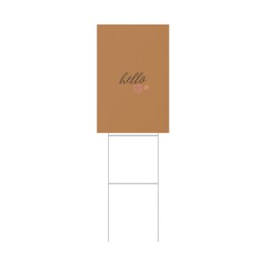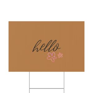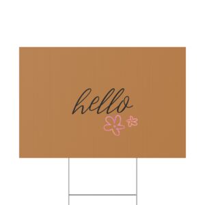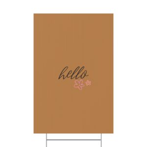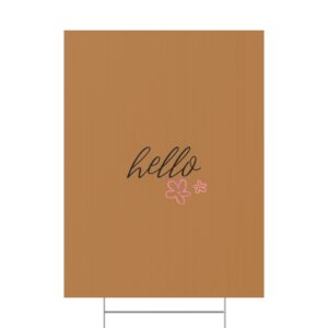 A warm, welcoming yard sign that brings a gentle, handmade touch to your front lawn. The matte, earthy background sets off a casual hand-lettered “hello” paired with two simple pink blooms — a soft hello to neighbors, visitors, and passersby. Weather-ready and printed on both sides, this low-key design reads clearly from either direction and settles into gardens, porches, or pathway beds without shouting. It feels friendly and calm, like waving from a sunlit porch on a slow morning.