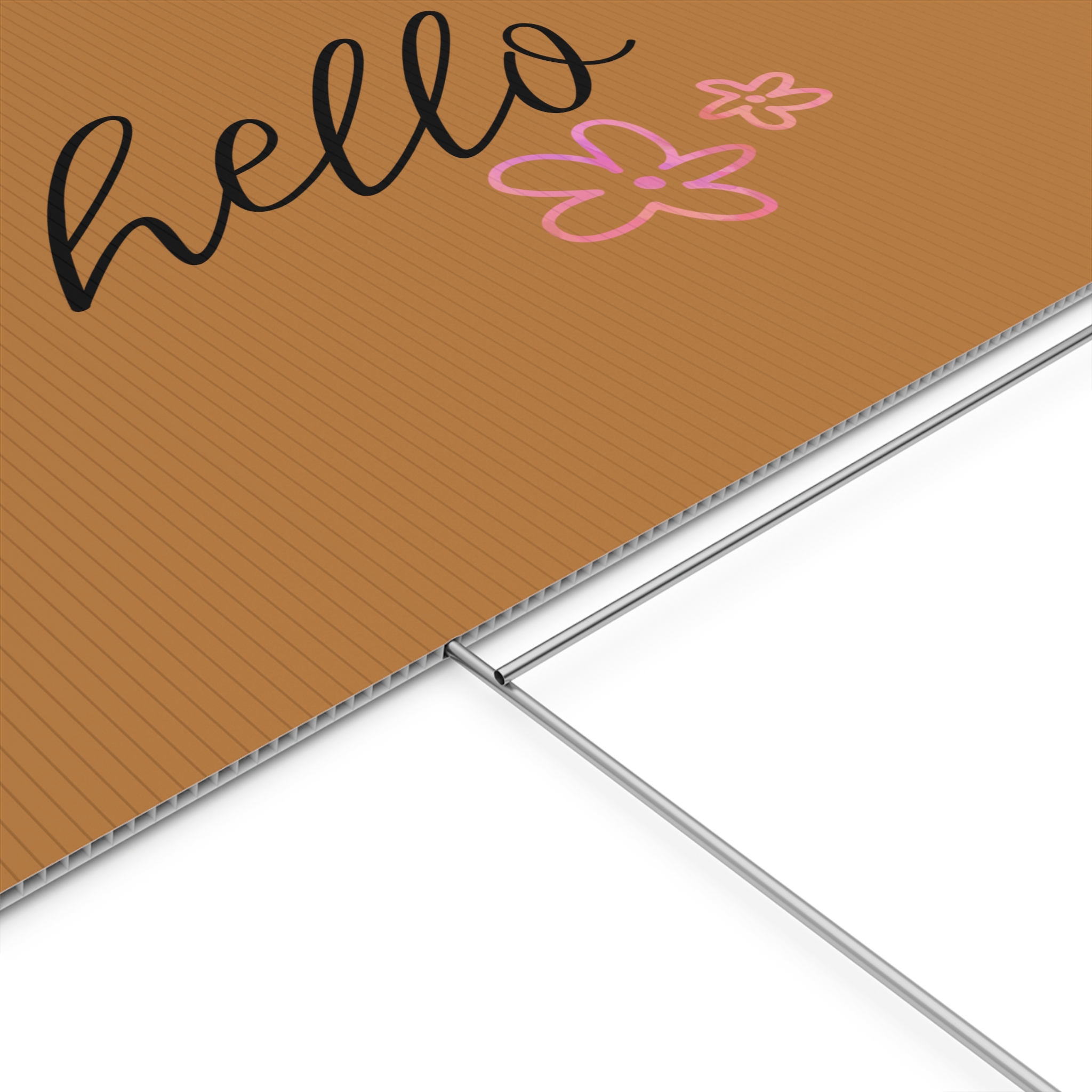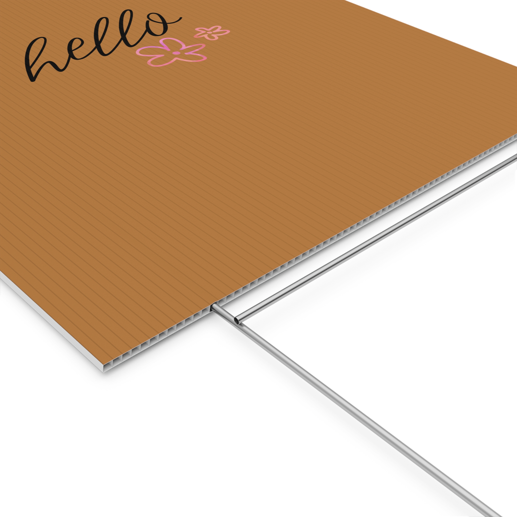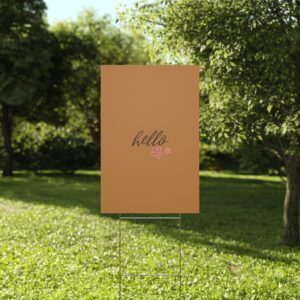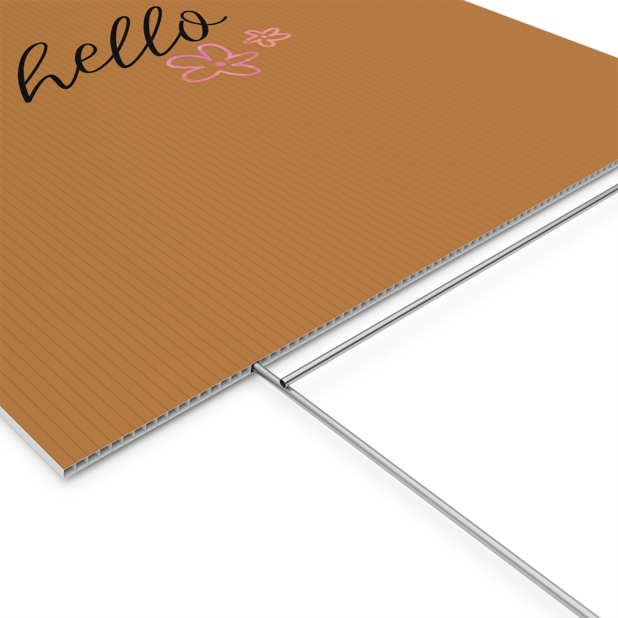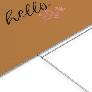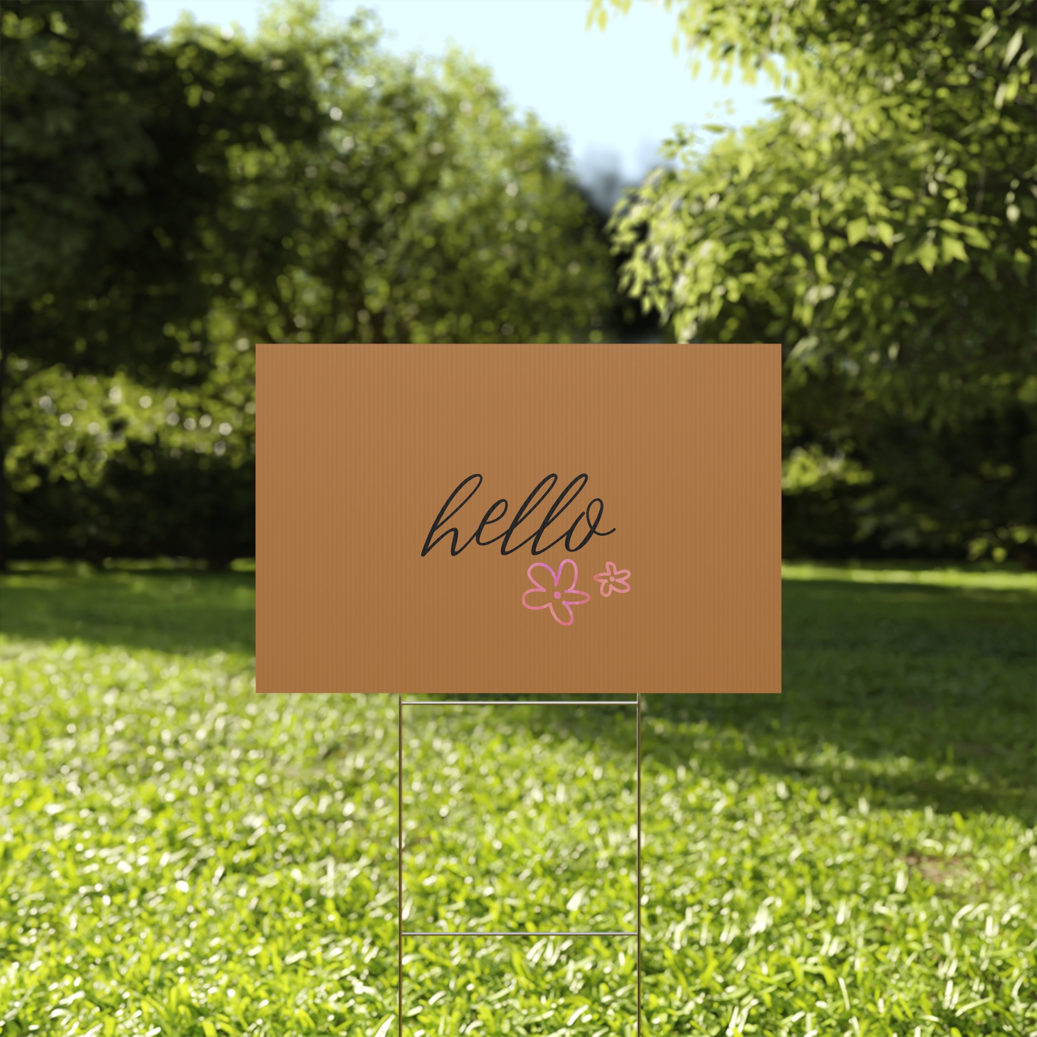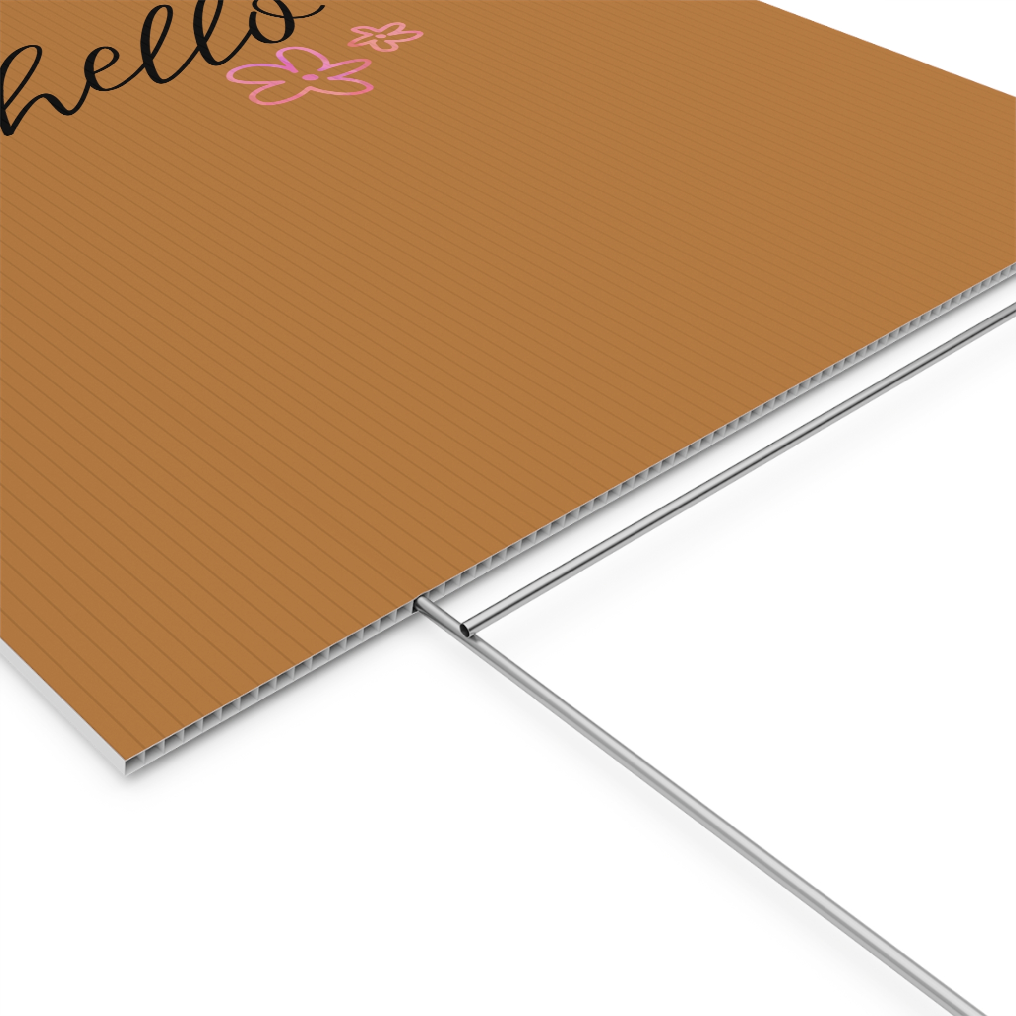 A warm, welcoming yard sign that brings a gentle, handmade touch to your front lawn. The matte, earthy background sets off a casual hand-lettered “hello” paired with two simple pink blooms — a soft hello to neighbors, visitors, and passersby. Weather-ready and printed on both sides, this low-key design reads clearly from either direction and settles into gardens, porches, or pathway beds without shouting. It feels friendly and calm, like waving from a sunlit porch on a slow morning.