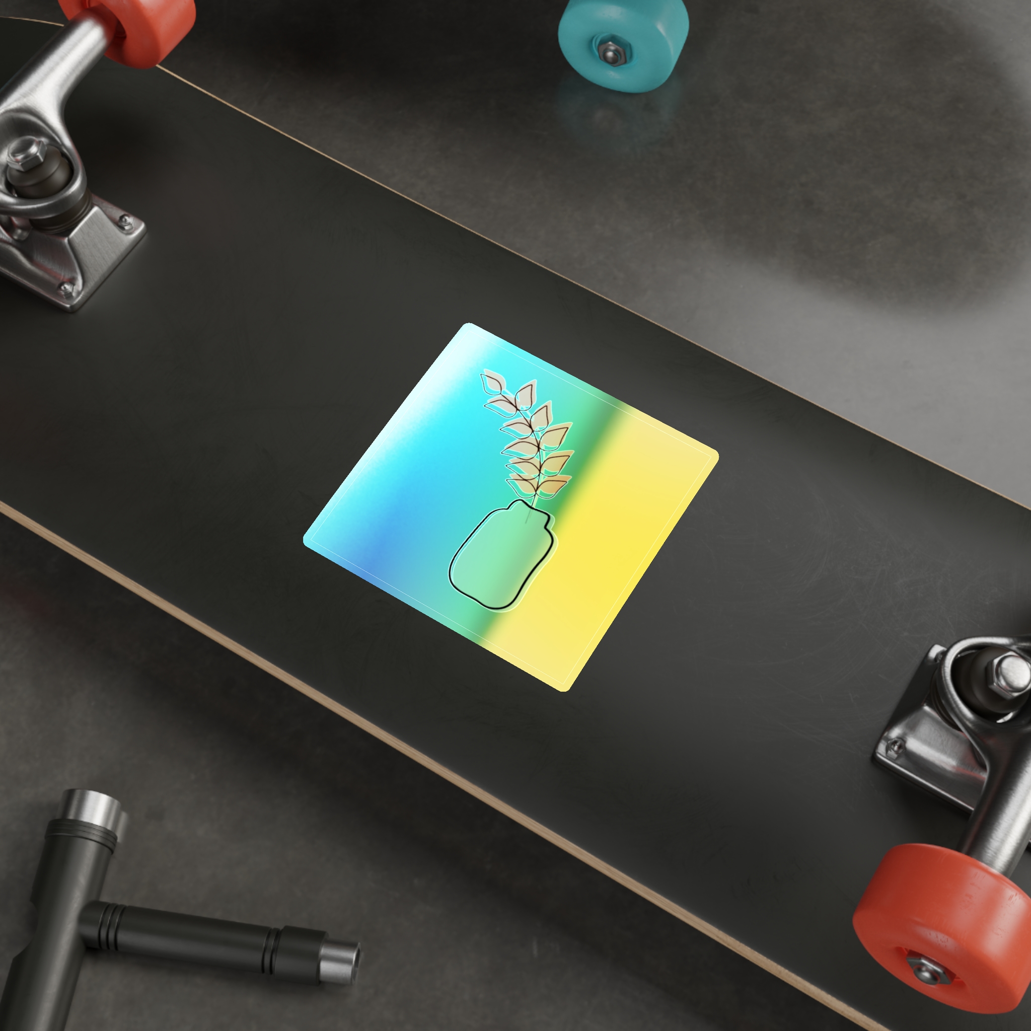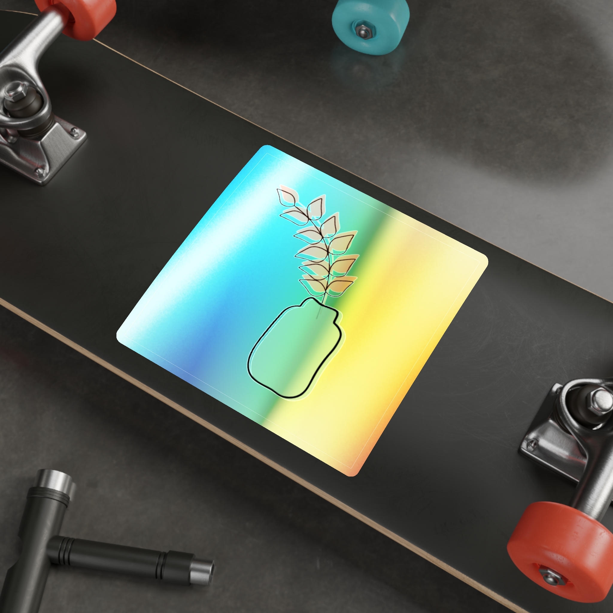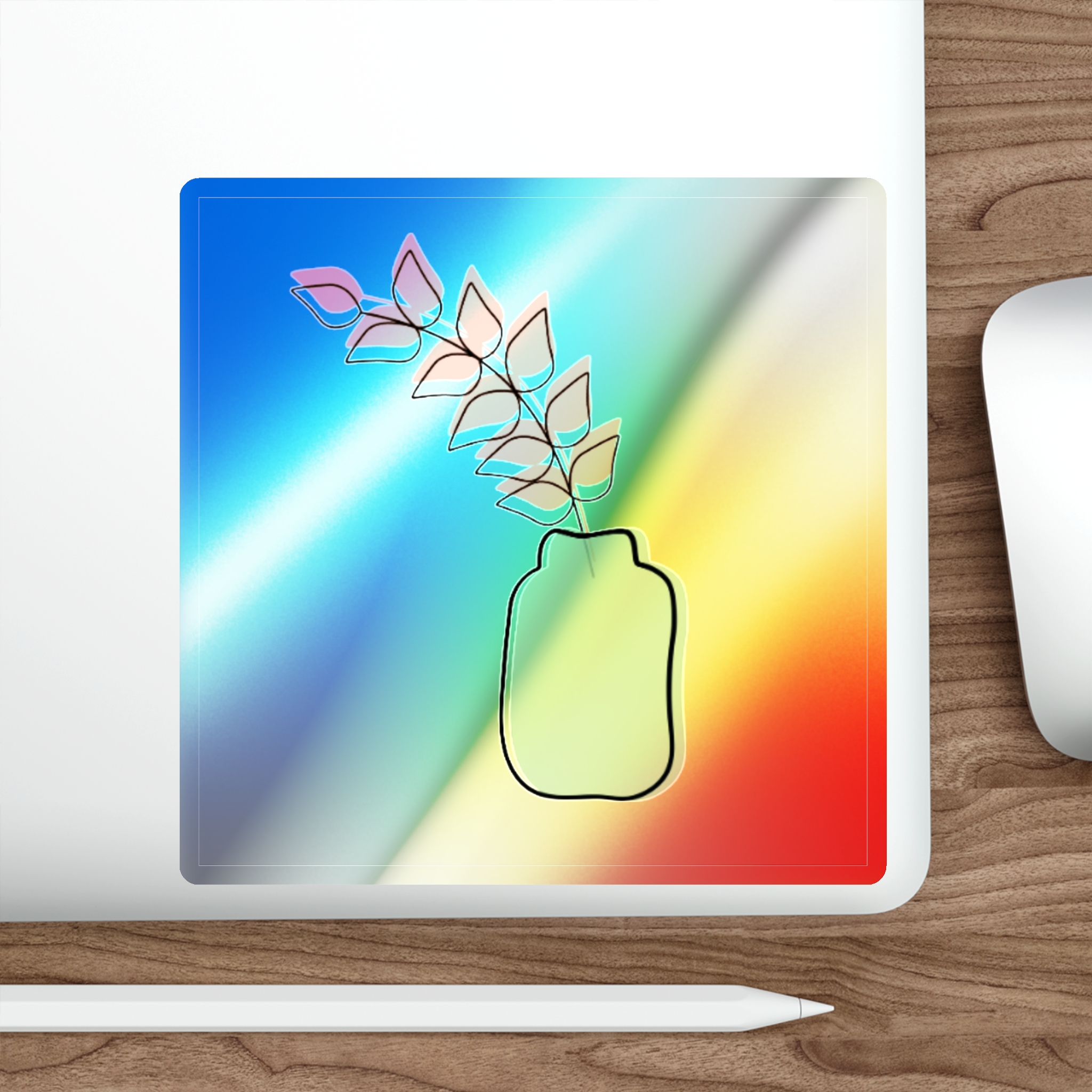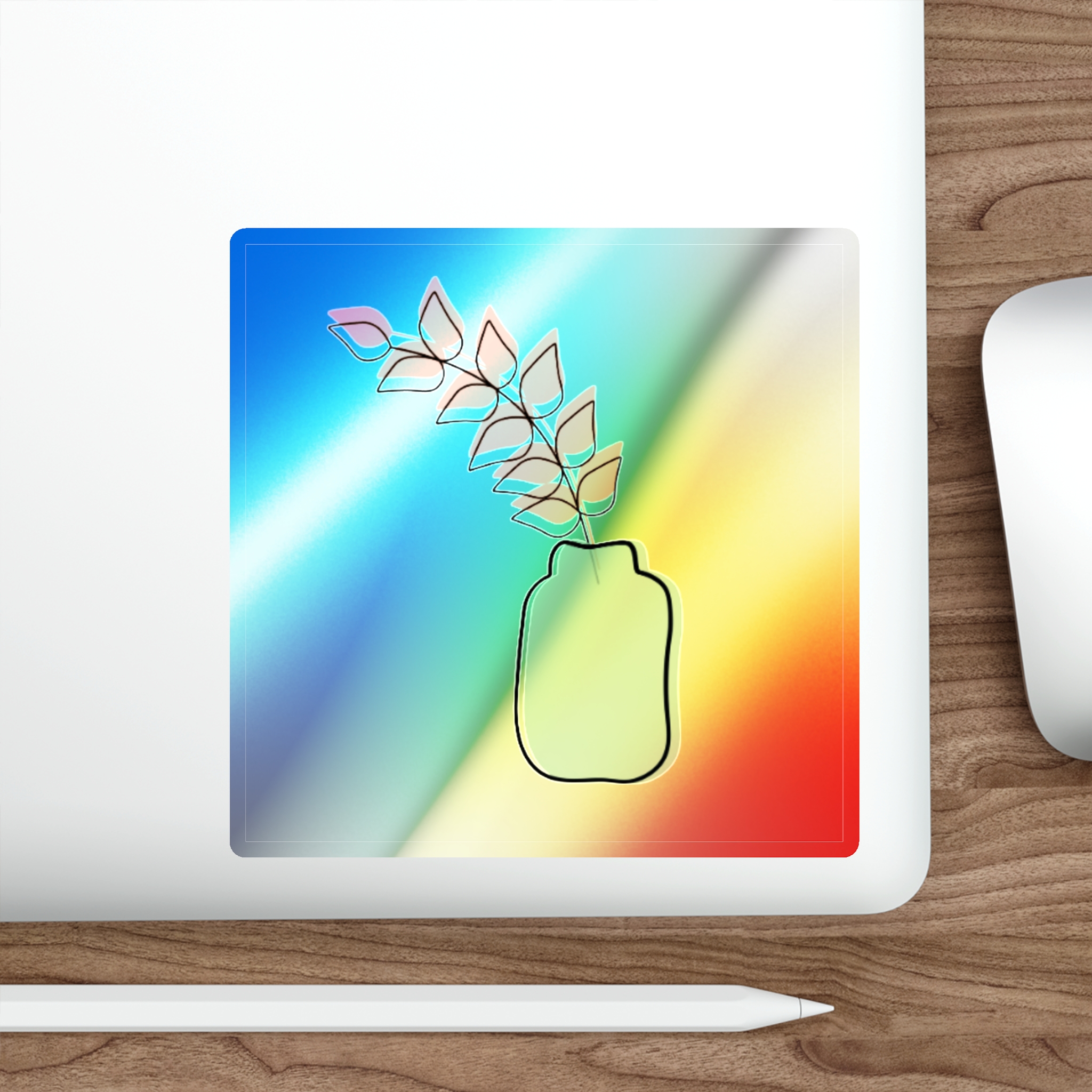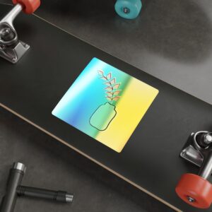A holographic die-cut sticker that catches light and shifts through a spectrum of colors. The design shows a minimalist vase and leaf motif rendered with a high-opacity holographic finish that layers rainbow shimmer beneath your artwork. It feels playful and slightly nostalgic—an instant bright spot on a water bottle, laptop, or skateboard. The durable printable vinyl holds up to everyday wear while maintaining vibrant color and a glossy, rainbow sheen that amplifies simple graphics into something joyful and eye-catching.