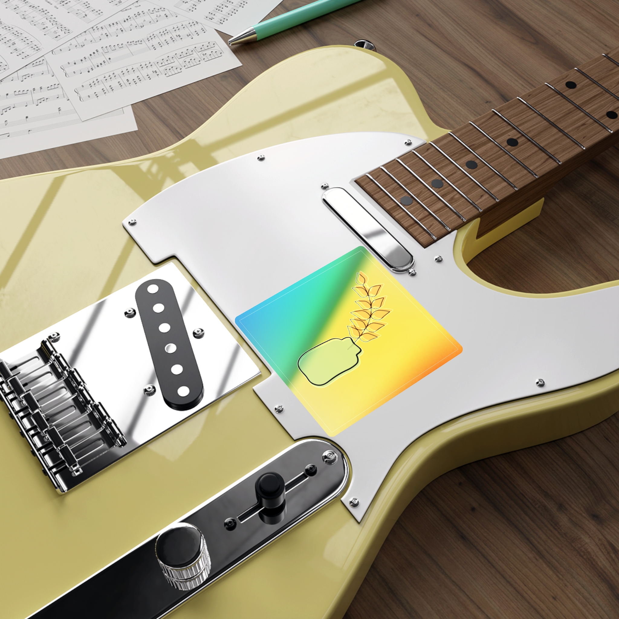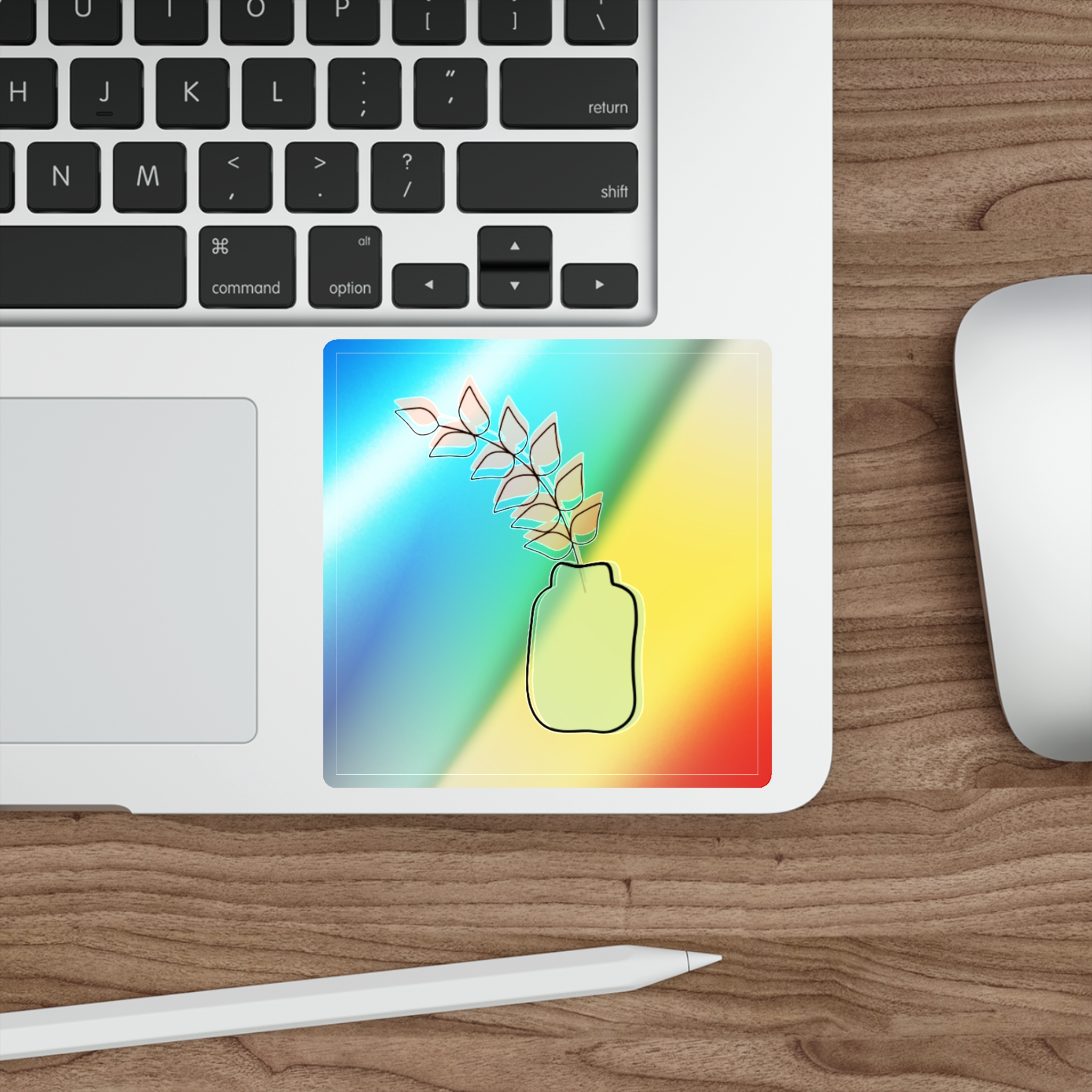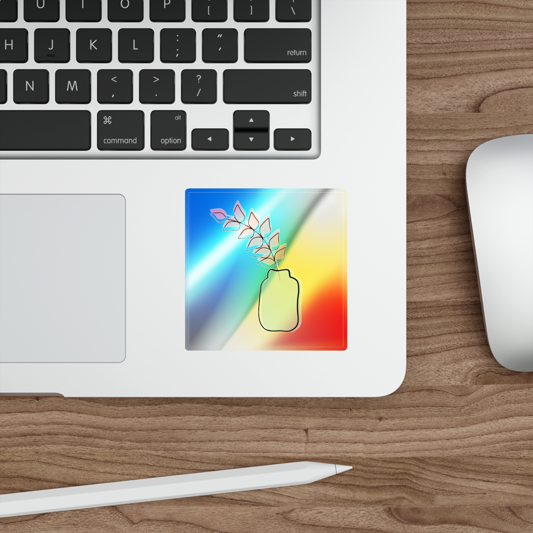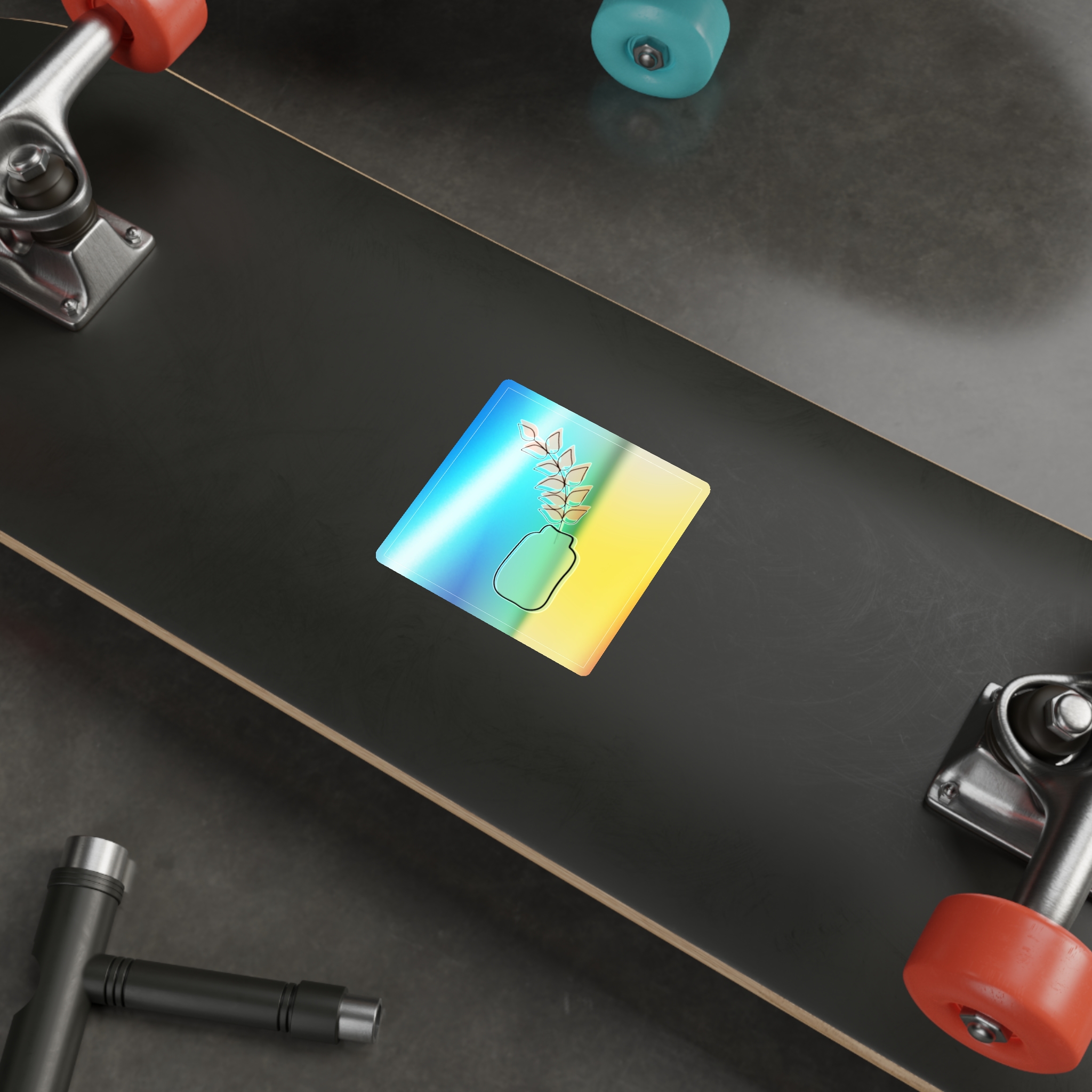 A holographic die-cut sticker that catches light and shifts through a spectrum of colors. The design shows a minimalist vase and leaf motif rendered with a high-opacity holographic finish that layers rainbow shimmer beneath your artwork. It feels playful and slightly nostalgic—an instant bright spot on a water bottle, laptop, or skateboard. The durable printable vinyl holds up to everyday wear while maintaining vibrant color and a glossy, rainbow sheen that amplifies simple graphics into something joyful and eye-catching.
