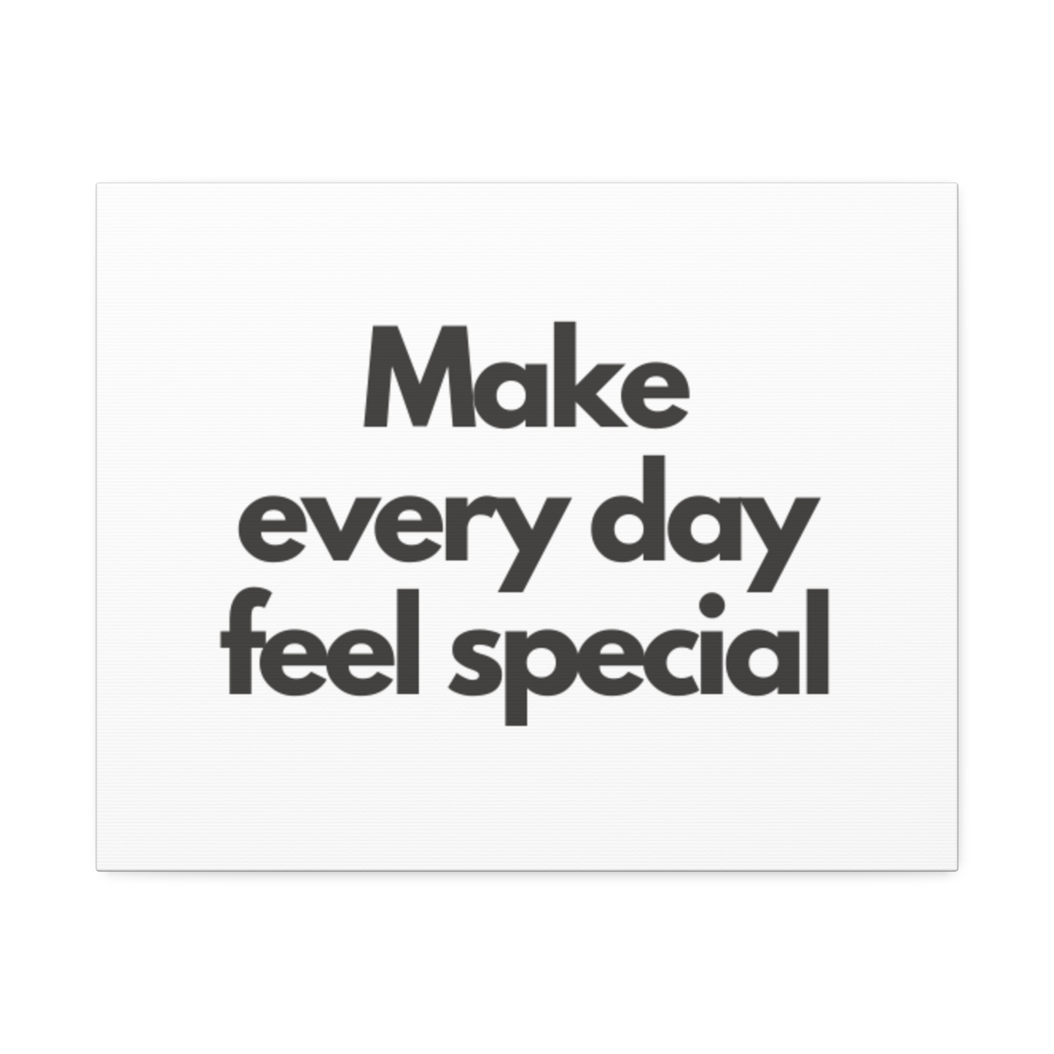 A minimalist stretched canvas print that speaks softly but clearly: bold, rounded type set against a clean white field reads “Make every day feel special.” It brings quiet encouragement to entryways, workspaces, nurseries, or beside a morning coffee station. The semi-gloss polyester surface keeps the black lettering crisp and modern while the hand-stretched fabric over a 1.5″ pine frame gives subtle depth on the wall. Ready-to-hang with included mounting hardware and a small QR code on the back for care or provenance, this canvas blends everyday optimism with gallery-quality construction.