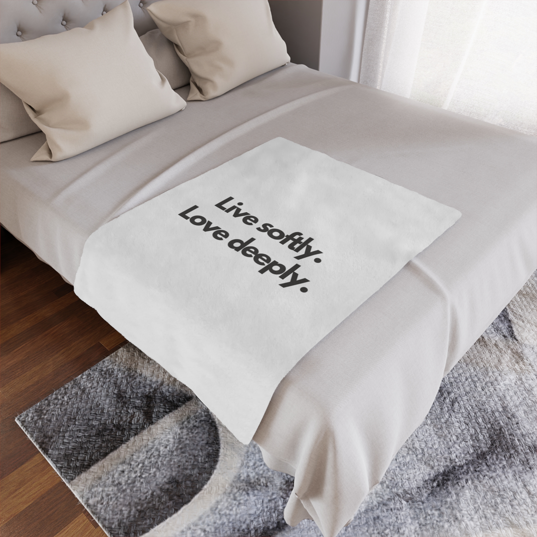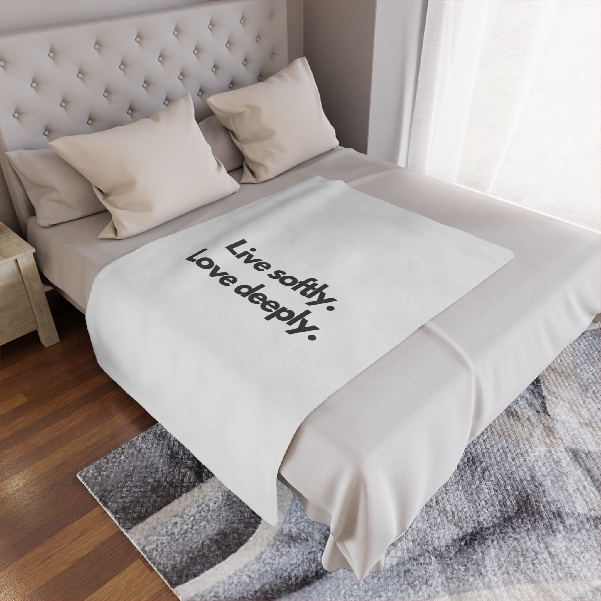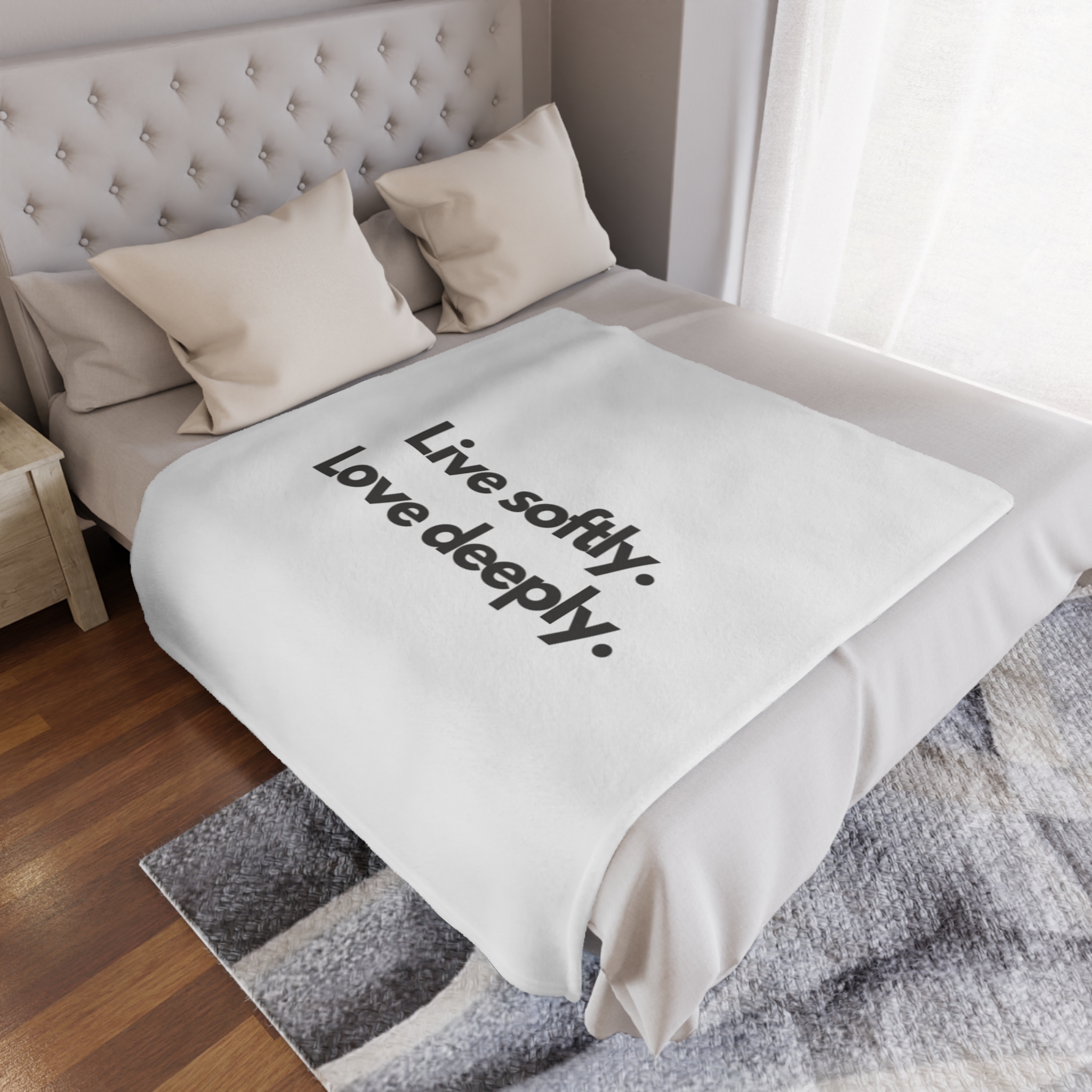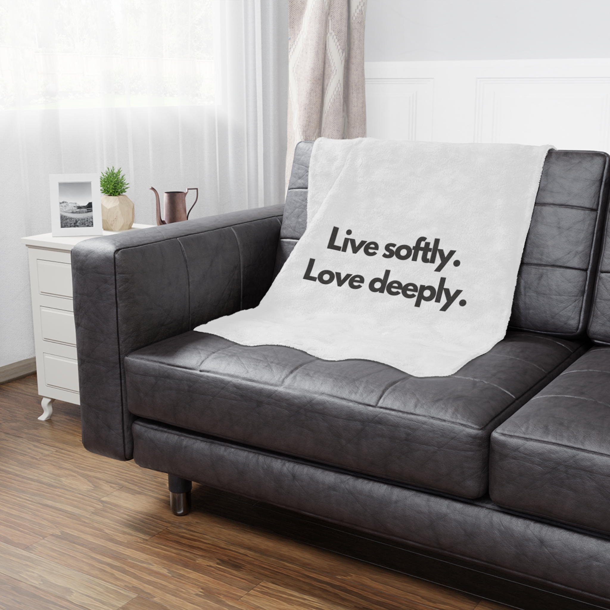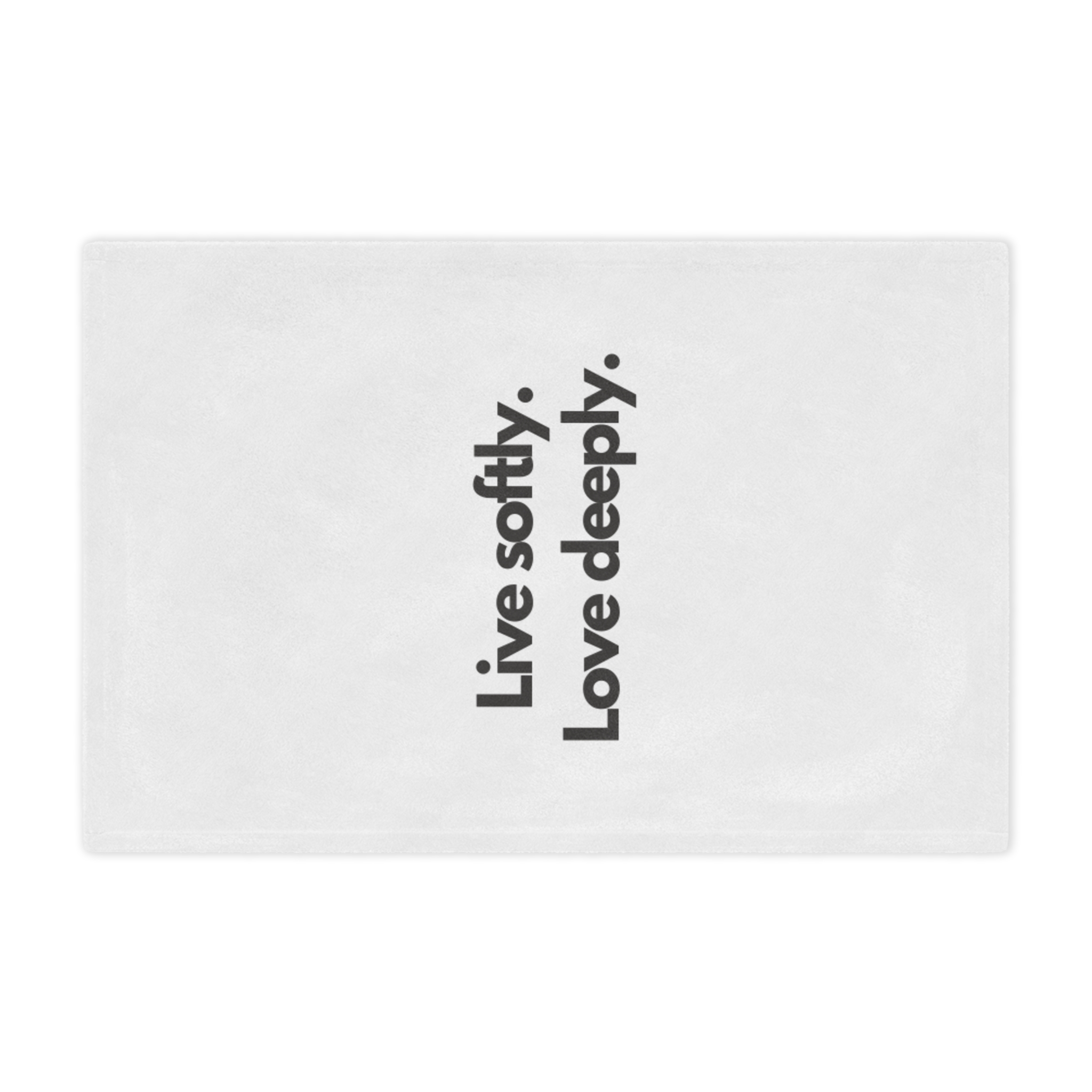 Wrap yourself in a gentle reminder to slow down and savor the moment. This plush minky blanket features bold, simple typography—“Live softly. Love deeply.”—on a clean white field. It’s light enough for curling up on the couch with a book and warm enough for quiet nights by the window. The soft, velvety pile invites you to rest, reflect, and reconnect. Slip it over your shoulders during a chilly morning coffee, lay it across a reading chair, or tuck it at the foot of the bed as an everyday comfort that speaks to a calmer, kinder way of living.