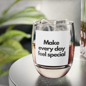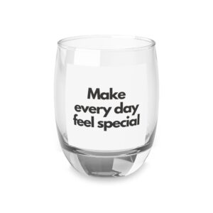 Smooth, low-slung whiskey glass with a modern printed message that quiets the day and invites a slower sip. The glossy print reads like a little pause — soft, confident typography set against clear glass so your drink remains the star. It sits comfortably in hand, catches light on the faceted base, and brings a touch of ceremony to ordinary evenings. Use it for neat pours, small cocktails, or a calming nightcap when you want the moment to feel intentional.